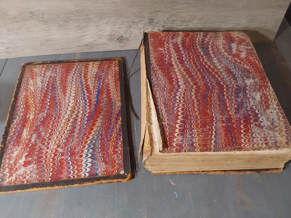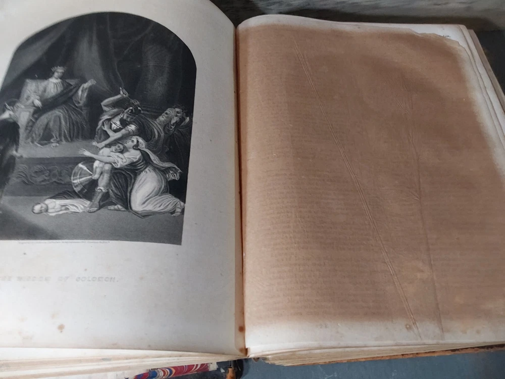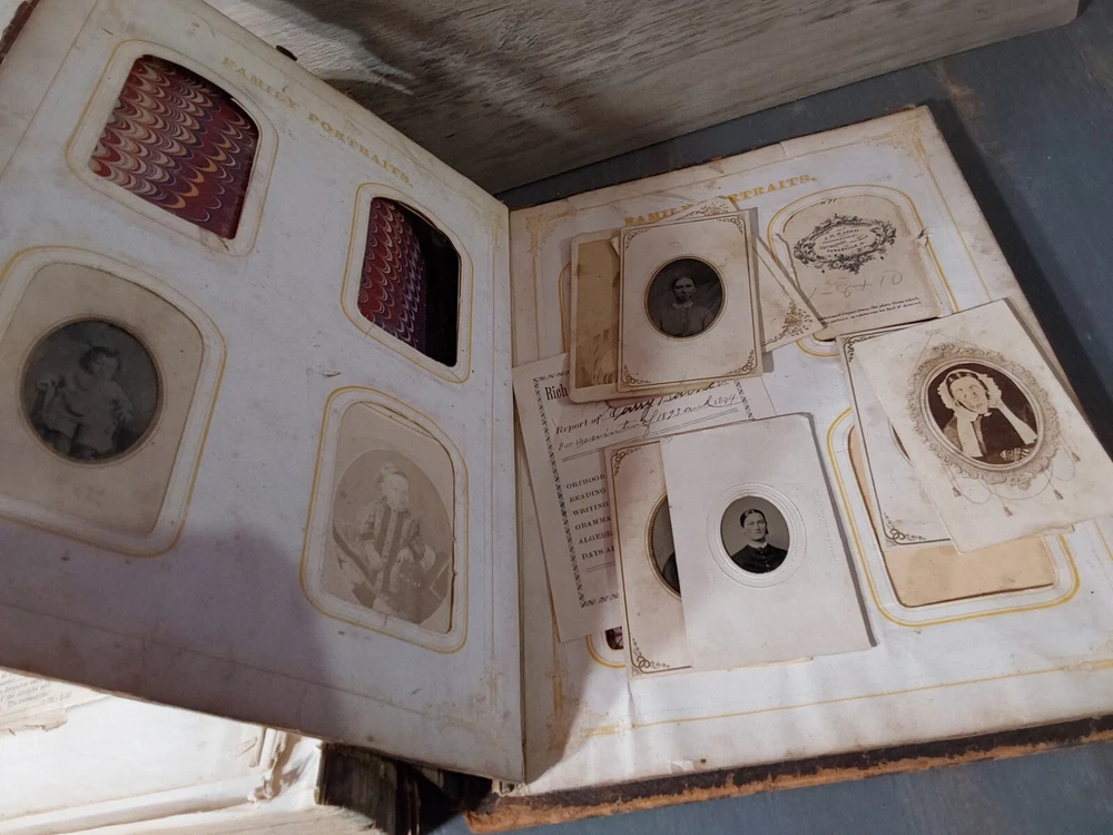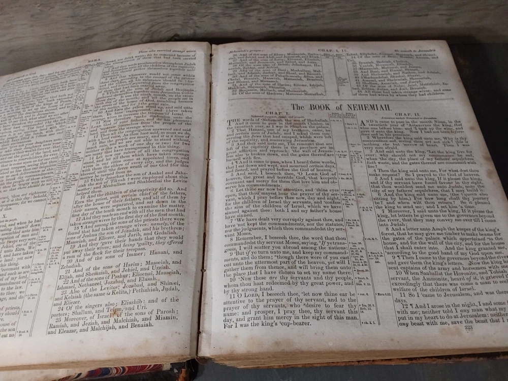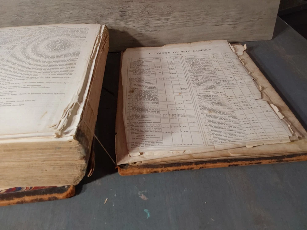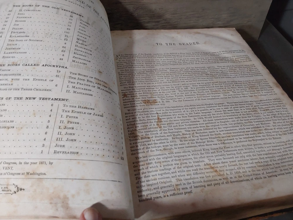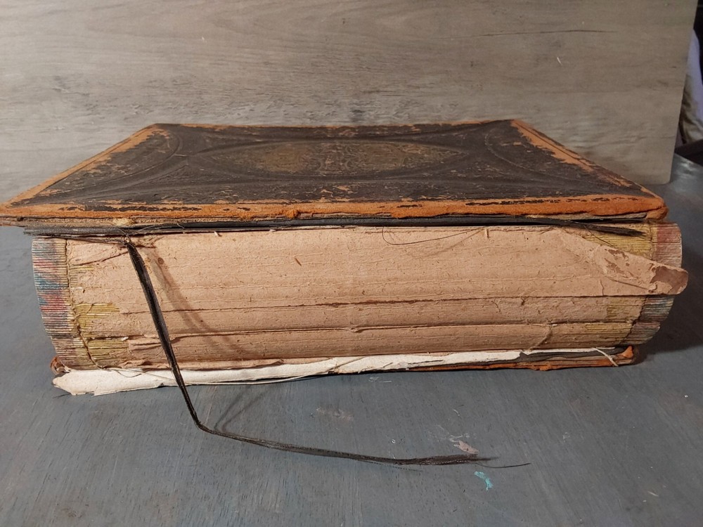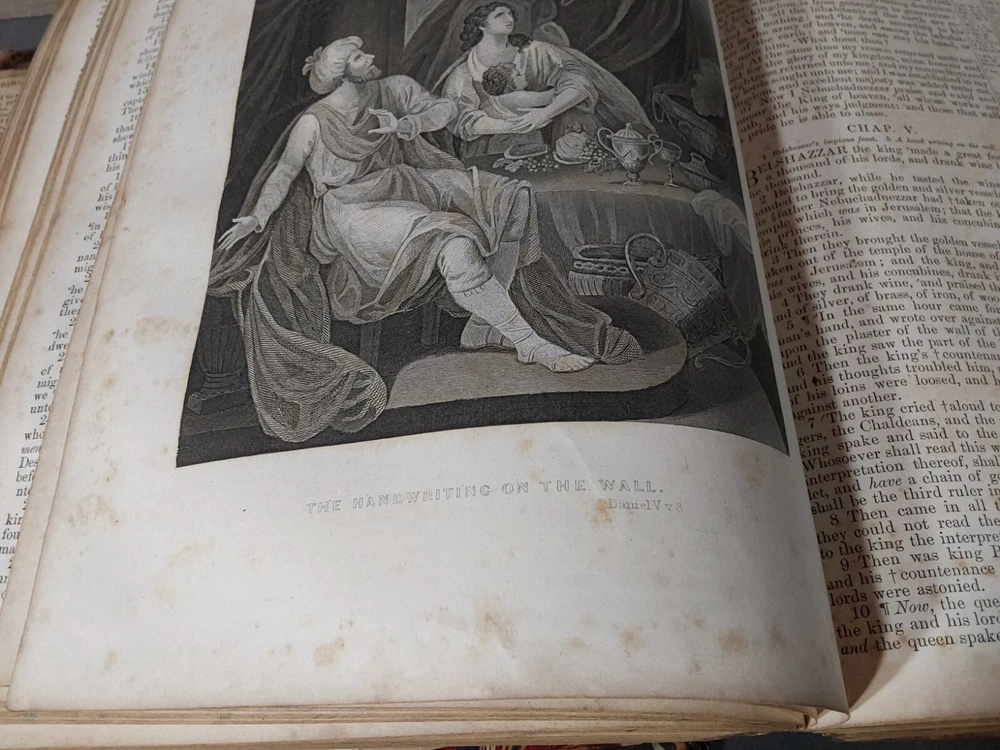 Leather Bound Family Bible 1871 Illustrated Polyglot Old/New Testaments HC main book is still bound to the spine top cover is detached and 1st page pages are marked with old spots does have that old book musty smell to it There are of family photos in the back in leaving them in there - I believe if it's in the book it should stay with the book
