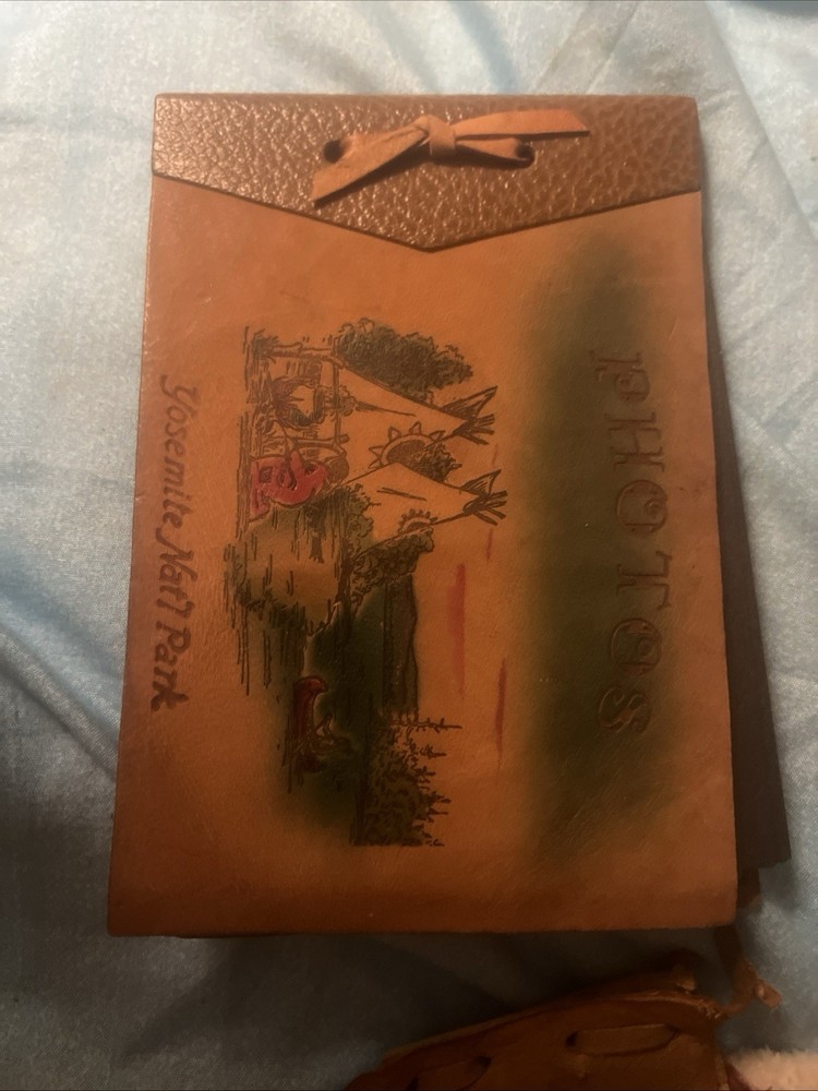 Capture and preserve your memories in a unique way with this antique leather-bound photo album. The front showcases a hand-painted picture, setting the tone for a piece that's not just an album, but a work of art. Designed for 4 x 6 inch photographs, it's perfect for displaying your cherished color images in a classic cabinet card format. Crafted with an eye for detail, this Americana-themed album features an embossed design that adds a tactile element to its nostalgic appeal. Manufactured in the United States between 1925 and 1949, it's a true vintage gem that embodies the spirit of travel, nature, and American history.