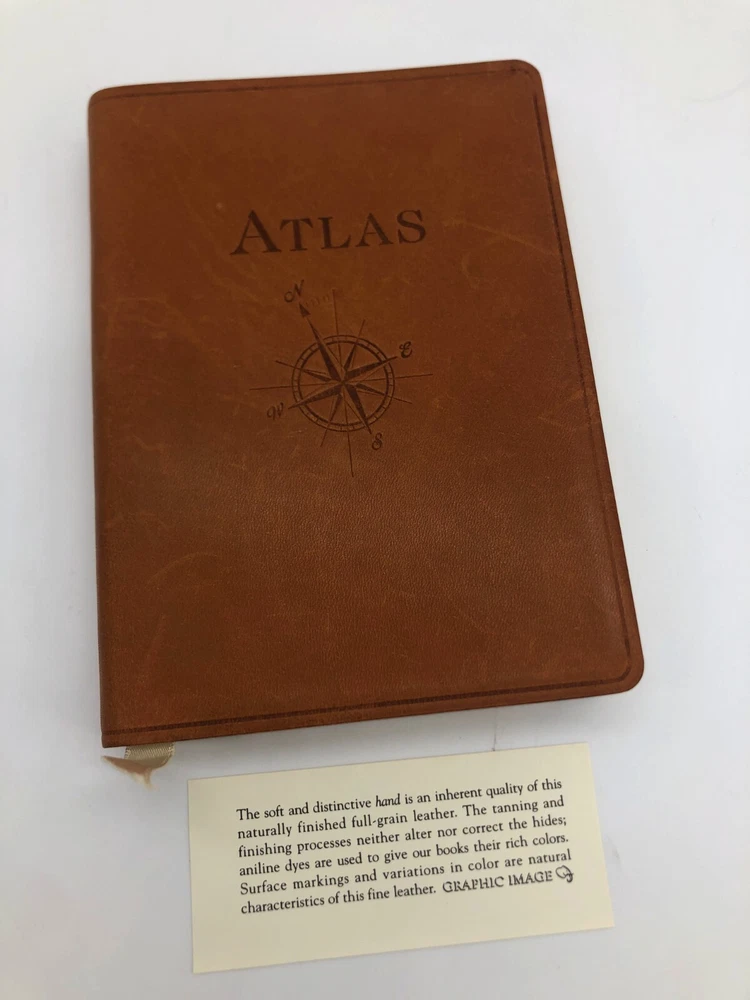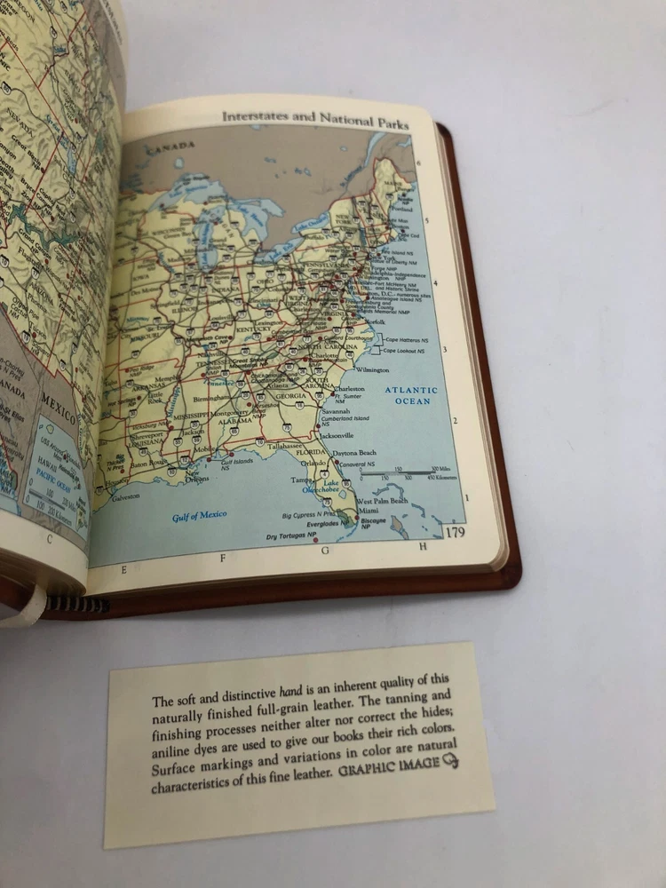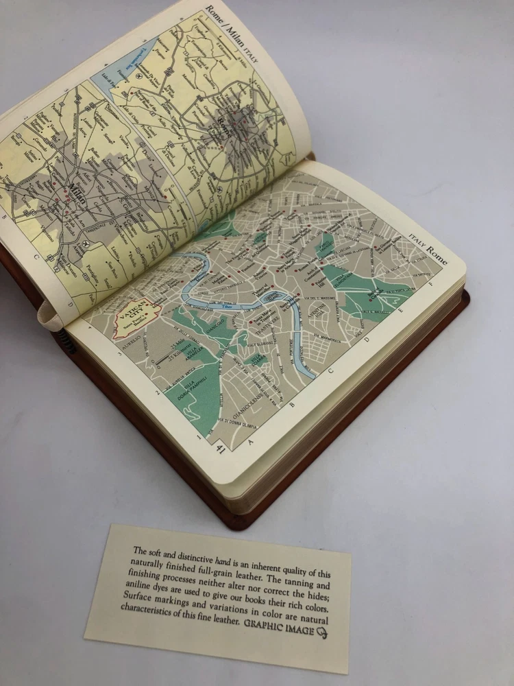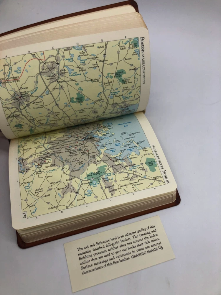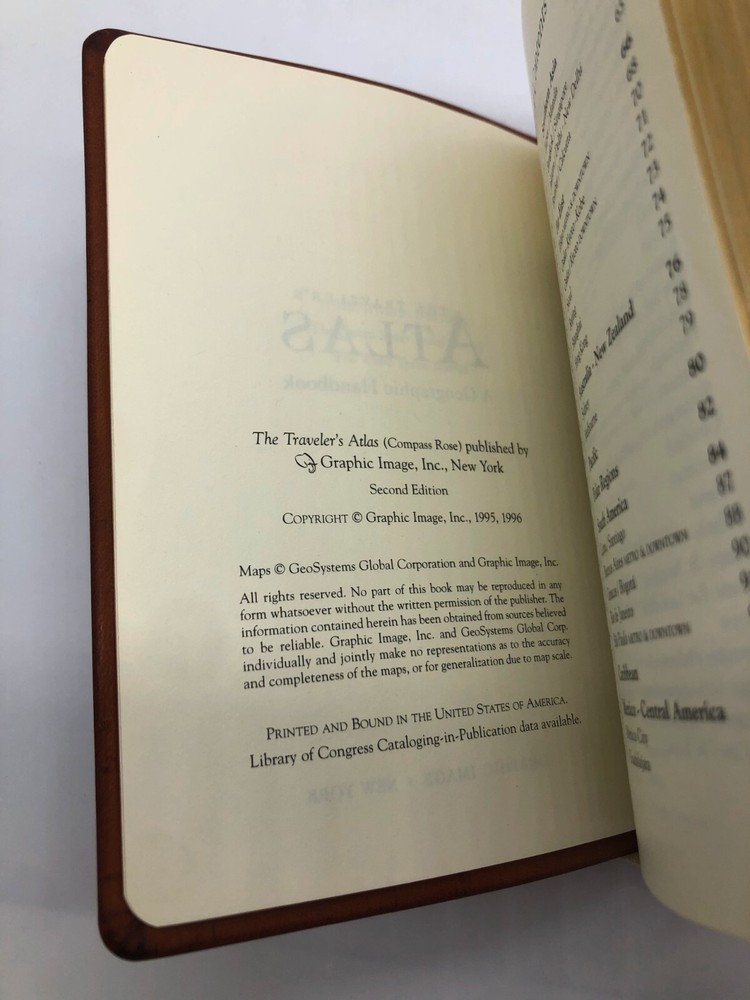 Leather Bound Traveler's Atlas (Compass Rose) by Graphic Image, Vintage 1996 Ed. "The Travler's Atlas" Publisher: Graphic Image, Inc. Second Edition Vintage edition: 1996 British Tan Traditional Leather Full Grain Hide 318 pages Book measures 6" x 4.5" x .75" Cream-white, acid-free paper with gilt edges Double-faced cream satin ribbon marker Smyth-sewn for strength and longevity Printed and Bound in the United States of America (USA) "The soft and distinctive hand is an inherent quality of this naturally finsihed full-grain leather. The tanning and finishing processes neither alter nor correct the hides; aniline dyes are used to give our books their rich colors. Surface markings and variations in color are natural characteristics of this fine leather." The photos are of the actual leather bound, full grain hide, book that you will receive. Emphasis on cities, transportation systems and urban points of interest. This compact companion is both comprehensive and travel friendly. An indispensable tool for both the seasoned and recreational traveler alike. Item: AUW Location: Bin S-08