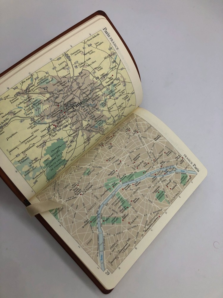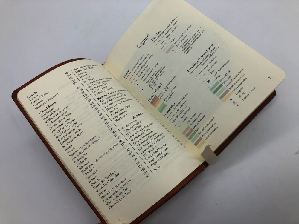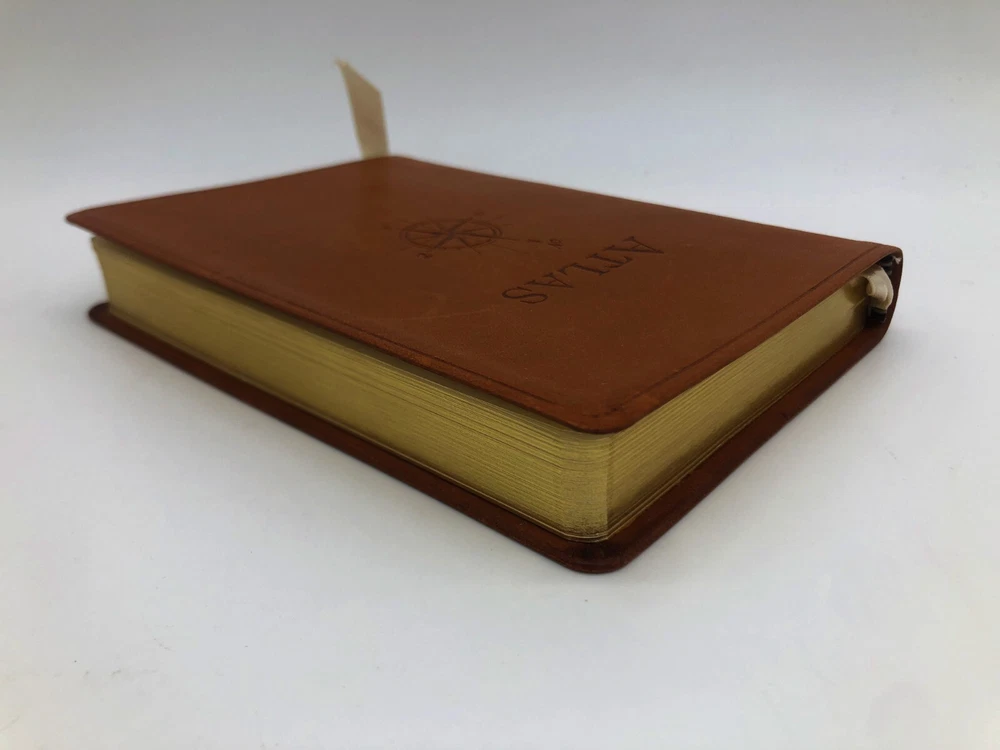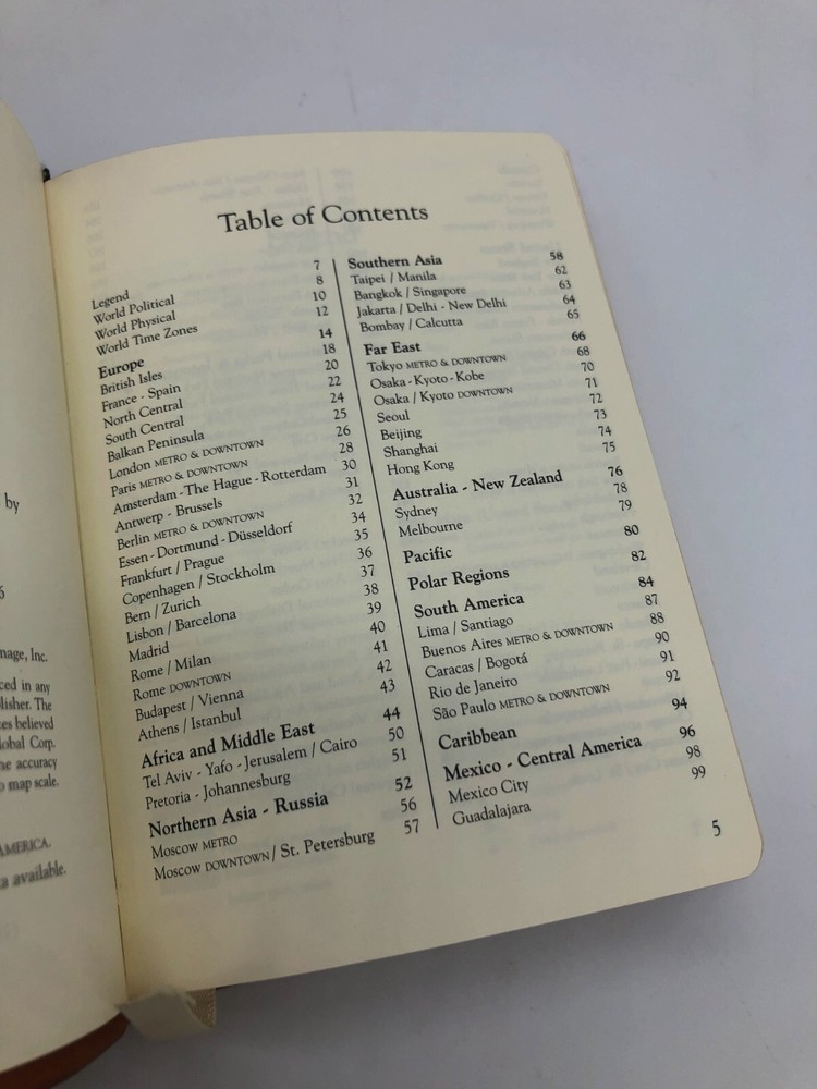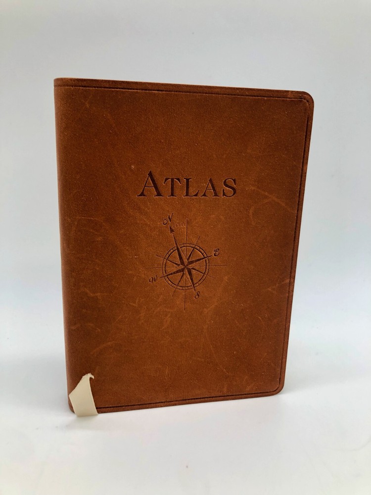 Leather Bound Traveler's Atlas (Compass Rose) by Graphic Image, Vintage 1996 Ed. "The Travler's Atlas" Publisher: Graphic Image, Inc. Second Edition Vintage edition: 1996 British Tan Traditional Leather Full Grain Hide 318 pages Book measures 6" x 4.5" x .75" Cream-white, acid-free paper with gilt edges Double-faced cream satin ribbon marker Smyth-sewn for strength and longevity Printed and Bound in the United States of America (USA) "The soft and distinctive hand is an inherent quality of this naturally finsihed full-grain leather. The tanning and finishing processes neither alter nor correct the hides; aniline dyes are used to give our books their rich colors. Surface markings and variations in color are natural characteristics of this fine leather." The photos are of the actual leather bound, full grain hide, book that you will receive. Emphasis on cities, transportation systems and urban points of interest. This compact companion is both comprehensive and travel friendly. An indispensable tool for both the seasoned and recreational traveler alike. Item: AUW Location: Bin S-08