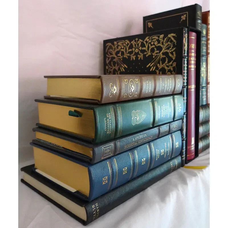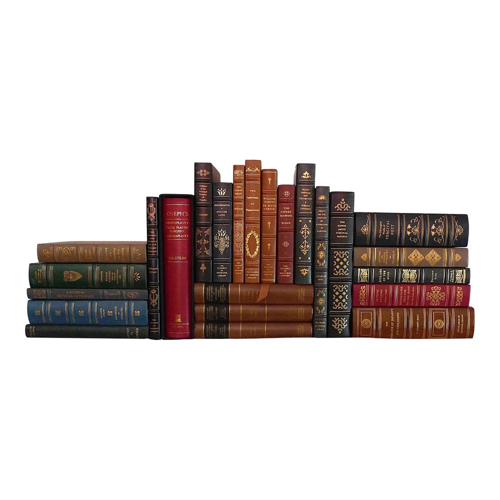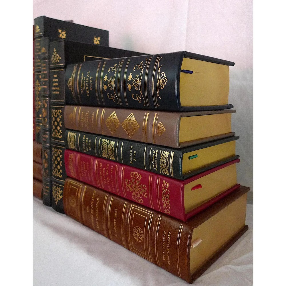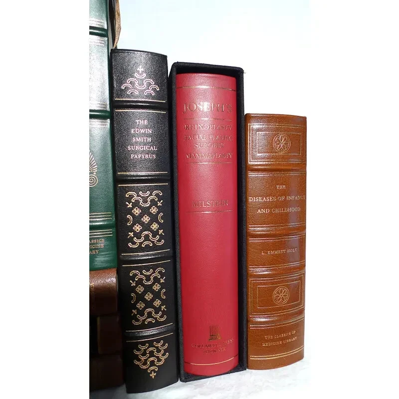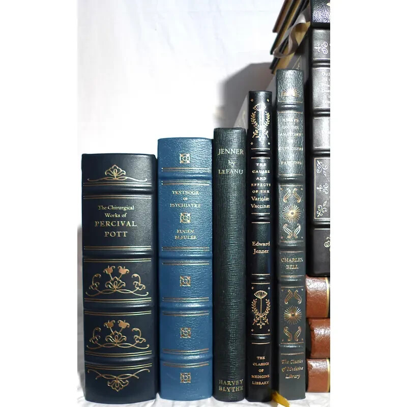 20th Century Leather Illustrated Library Collection, Classics of Medicine, Psychiatry & Psychology, Limited Editions - 24 Books. Measures: 1-2 (38 overall) W x 9.5 D x 12 H inches. 1. Rhinoplasty and Facial Plastic Surgery with a Supplement on Mammaplasty and Other Operations in the Field of Plastic Surgery of the Body, an Atlas and Textbook Author: Prof. Dr. J. Joseph (of Berlin). Publisher: Columella Press/Phoenix, copyright 1987. Edition: A limited first edition in English. Description: Publisher's hardcover in 1/4 red leather with gilt title stamped/embossed on spine cover, cloth boards, illustrated text, black cloth covered slipcase with author's facsimile signature on front cover. 2. The Chirurgical Works of Percival Pitt, F.R.S. and Surgeon to St. Bartholomew's Hospital, in Two Volumes, 1878. Author: Percival Pott, F.R.S. Publisher: The Classics of Surgery Library, copyright 1985. Edition: Special Limited-edition number #734 of 7,500 copies. Description: Publisher's full blue leather hardcover with 22K gilt title/decoration stamped/embossed on spine cover and boards, full gilt leaf edges, illustrated text. 3. A Bio-Bibliography of Edward Jenner 1749-1823. Author: W.R. LeFanu. Publisher: Harvey and Blythe, Ltd., London, 1951. Edition: Limited edition number #727 of 1000 copies. Description: Faux black leather hardcover with gilt title/decoration stamped/embossed on spine and front board, illustrated text. Publisher: The Classics of the Medicine Library. Description: Privately printed publisher's full leather hardcovers with 22K gilt title and decorated boards, full gilt edges, illustrated text. 4. An Inquiry into the Causes and Effects of the Variolae Vaccinae, a Disease Discovered in Some of the Western Counties of England, Particularly Gloucestershire, and Known by the Name of The Cow Pox, 1798. Author: Edward Jenner, M.D. F.R.S. &c. Edition: Special edition number #9310, copyright 1978. Note: Included Editor's Notes folded in front endpapers. 5. The Aphorisms of Hippocrates Author: Thomas Coar (Translation into Latin) Edition: Special Edition, copyright 1982. 6. Arrowsmith Author: Sinclair Lewis. Edition: Special Edition, copyright 2001. 7. The Expert Midwife. Author: Rueff, Jacob. Edition: Special Edition, copyright 1997. Note: Included Editor's Notes folded in front endpapers. 8. William Harvey Exercitatio Anatomica De Motu Cordis et Sanguines in Animalibus. Being a Facsimile of the 1628 Francofurti Edition Together with the Keynes English Translation of 1928. Author: William Harvey. Edition: Special edition number #2246, copyright 1978. 9. The Diseases of Infancy and Childhood, for the Use of Students and Practitioners of Medicine, with Two Hundred and Four Illustrations Including Seven Colored Plates, 1897. Author: L. Emmett Holt, A.M., M.D. Edition: Special edition number #5955, copyright 1980. 10. Disease of the Mind. Author: Benjamin Rush. Edition: Special Edition, copyright 1979. 11. The Human Heart. Author: Thomas B. Peacock, M.D. Edition: Special Edition, copyright 1981. Note: Included Editor's Notes folded in front endpapers. 12. A Study in Hospital Efficiency as Demonstrated by the Case Report of the First Five Years of a Private Hospital, 1918. Author: E.A. Codman, M.D. Edition: Special edition, copyright 1992. Note: Included large fold-out chart, Index of Cases Combined with Statistical Tables Using Anatomic and Pathologic Classification of Diseases and Operations, folded in rear pocket of book endpapers. 13. Artistic Anatomy & Bridgewater* Treatise on the Hand**. Author(s):*Robert Knox, **Sir Charles Bell. Edition:Special edition #392 of 7500 copies, copyright 1985. 14. Outlines of the Principal Disease of Females. Author:Fleetwood Churchill. Edition: Special edition #392 of 7500 copies, copyright 1986. 15. The Integrative Action of the Nervous System. Author:Charles S. Sherrington. Edition:Special edition, copyright 1989. 16. Essays on the Anatomy of Expression in Painting. Author:Sir Charles Bell. Edition:Special edition, copyright 1984. 17. The Edwin Smith Surgical Papyrus. Author:James Henry Breasted (edited by). Edition: Special edition #392 of 7500 copies, copyright 1984. Publisher: The Classics of Psychiatry & Behavioral Sciences Library. 18. Textbook of Psychiatry. Author:Eugen Bleuler. Edition:Special edition, copyright 1988. 18. Lectures on Clinical Psychiatry. Author:Emil Kraepelin. Edition:Special edition, copyright 1988. 20. Mental Pathology and Therapeutics. Author:Wilhelm Griesinger. Edition:Special edition, copyright 1989. 21. Psychology from the Standpoint of a Behaviorist. Author:John Watson. Edition:Special edition #1408, copyright 1989. Publisher:University Publications of America. Series:Significant Contributions to the History of Psychology 1750-1920. 22. Series B, Psychometrics and Educational Psychology, Vol. IV. Author(s):A. Binet, T. Simon, W.L. Stern, F. Galton. 23. Series C, Medical Psychology, Vol. I. Author:T.A. Ribot. Edition:Copyright 1977. 24. Series C, Medical Psychology, Vol. II.