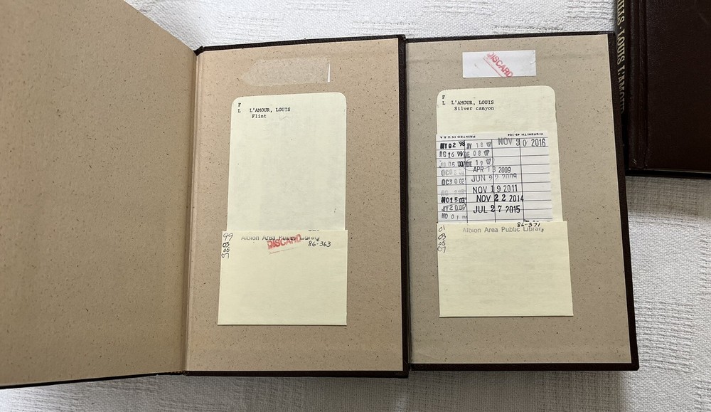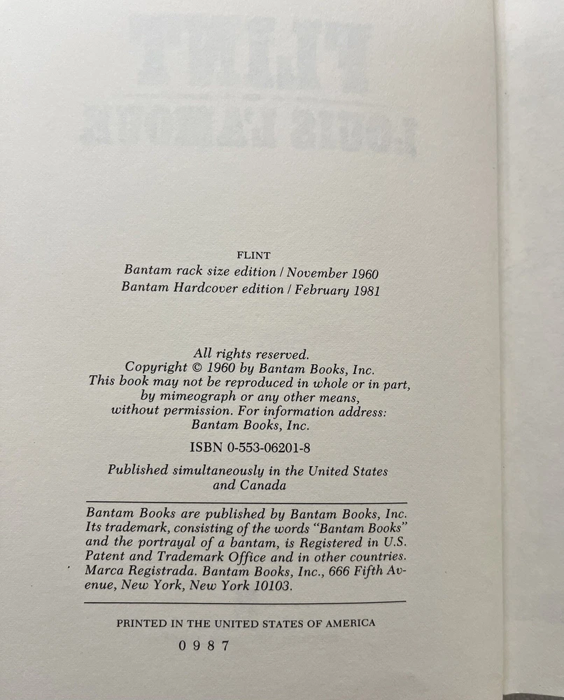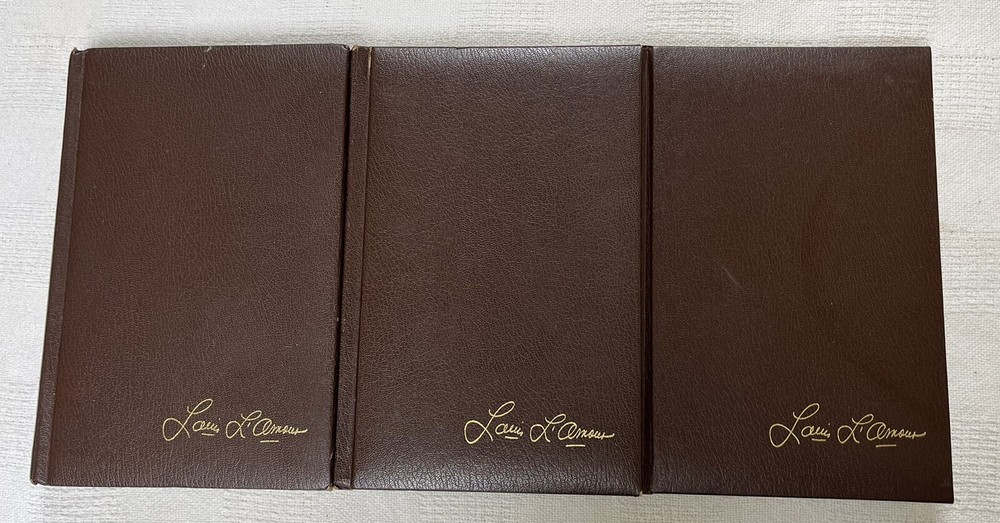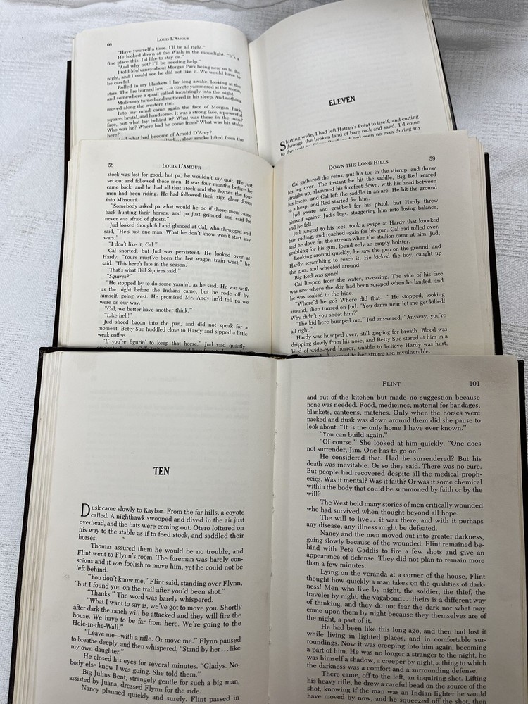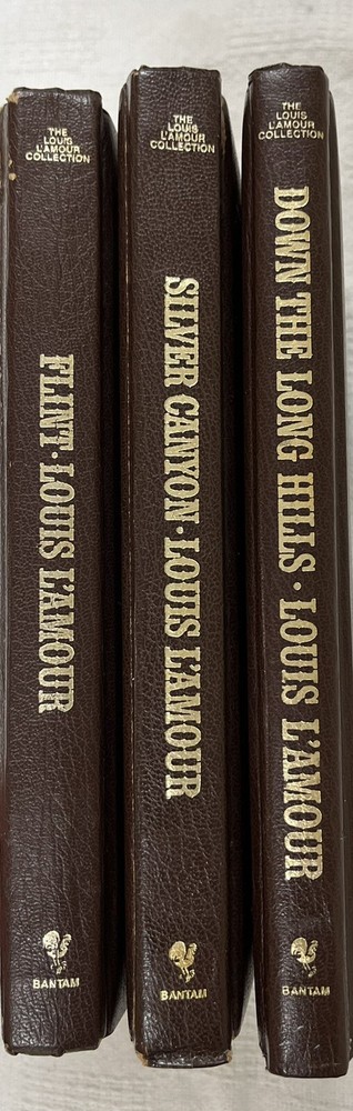 Leatherette Bantam Louis L'Amour Books (3) Westerns. Flint, Silver Canyon. Titles include: Flint, Silver Canyon and Down the Long Hills These are former library books. Interior of books look great. Exterior shows wear and the book shows a wearing of the leather (Down the Long Hills).
