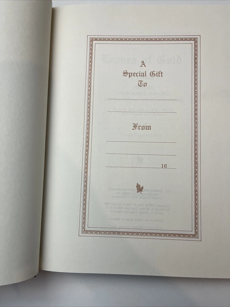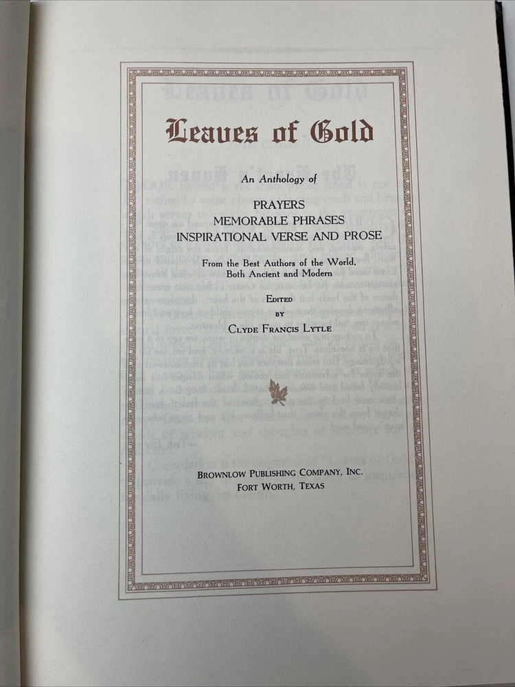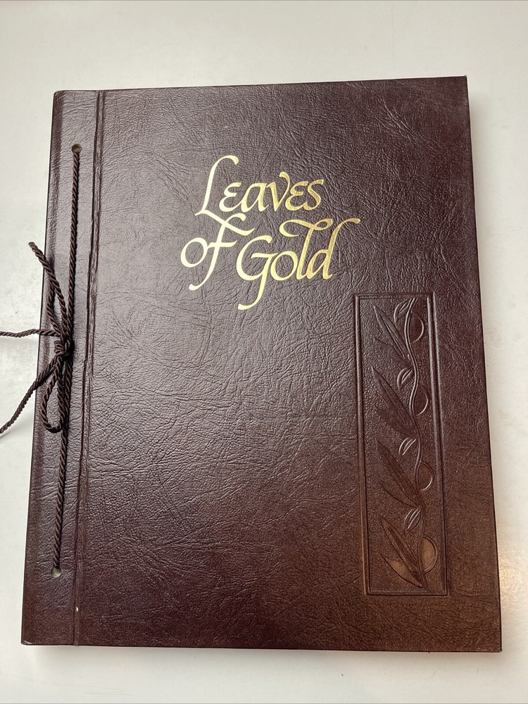 This vintage book, titled "Leaves of Gold," is a beautiful addition to any collection of Christian collectibles. The hard cover book is leather bound and was manufactured in the United States. The book is filled with intricate illustrations and detailed information about the history of Christianity. This book is perfect for anyone who is interested in the history of Christianity and wants to add a unique piece to their collection. It would make a great gift for anyone who is religious or spiritual. Don't miss out on the opportunity to own this rare and fascinating book. See Photos