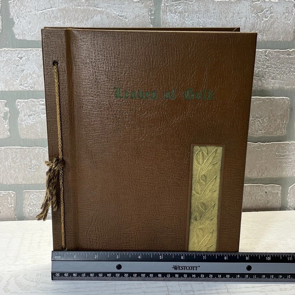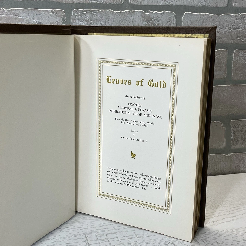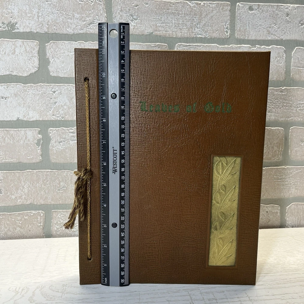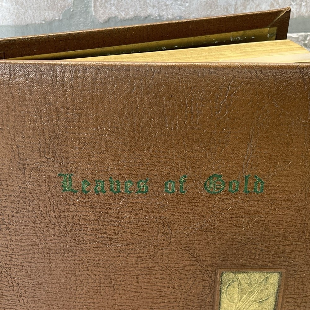 Vintage Leaves of Gold An Anthology of Prayers & Memorable Phrases Edited by: Clyde Francis Lytle. Revised Edition 1948 Vintage book is in good preowned condition. Book shows wear from age, use and storage including wear/rub marks, corner wear, wear to the embossed leaves on the front cover, frayed ends of the cord that binds the book, writing/dedication on the inside front cover page, wear to the inside covers, light yellowing and a small stain on page 41 where I had removed a dried flower. I see no rips or tears. The gold colored edges on the book pages looks nice. Book measures approximately 11" x 8.5" x 1" and has 200 pages filled with prayers & memorable phrases. See all photos for best description. See photos for condition. If you need additional photos, please let me know. Ships within 2 business days of purchase/payment. Shipping USPS