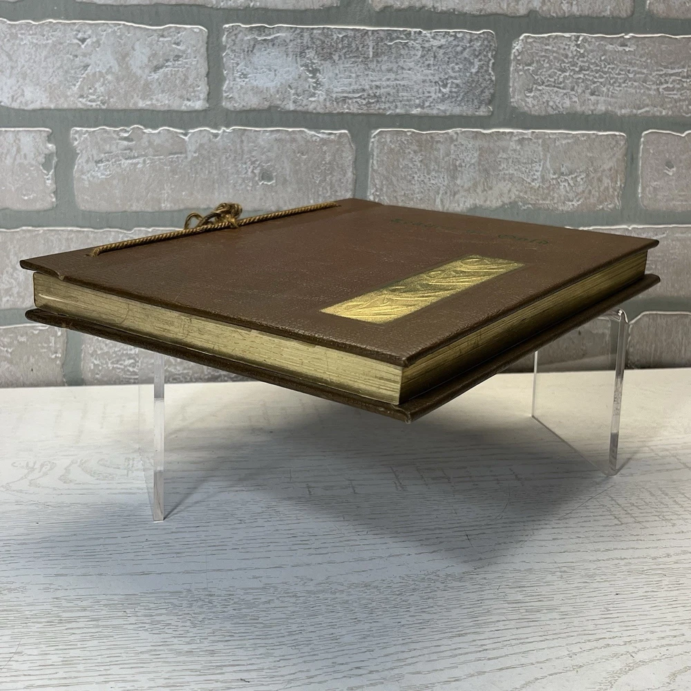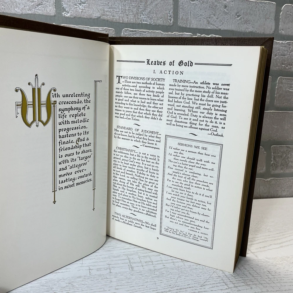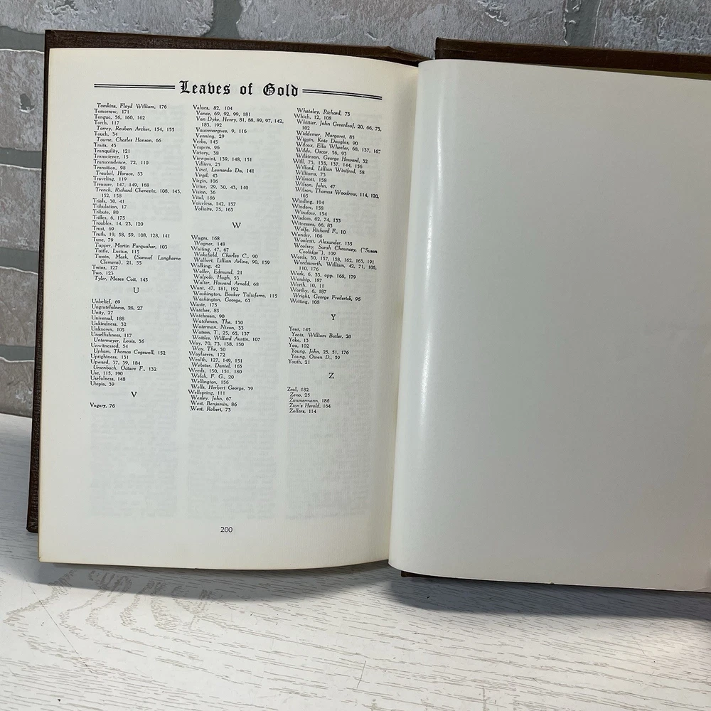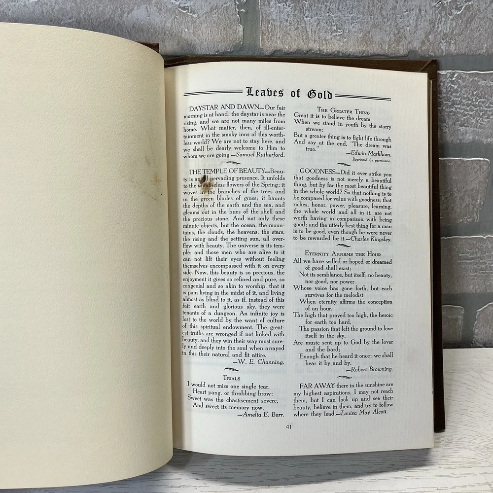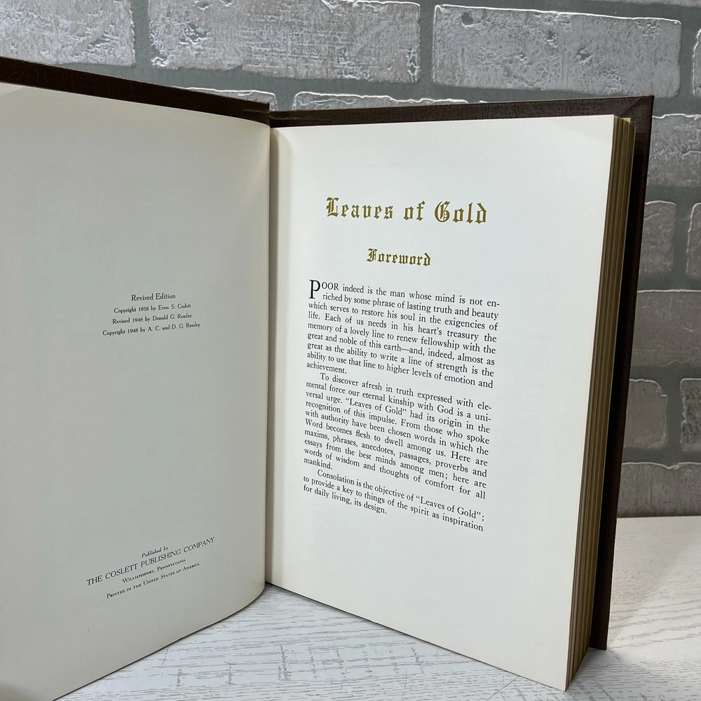 Vintage Leaves of Gold An Anthology of Prayers & Memorable Phrases Edited by: Clyde Francis Lytle. Revised Edition 1948 Vintage book is in good preowned condition. Book shows wear from age, use and storage including wear/rub marks, corner wear, wear to the embossed leaves on the front cover, frayed ends of the cord that binds the book, writing/dedication on the inside front cover page, wear to the inside covers, light yellowing and a small stain on page 41 where I had removed a dried flower. I see no rips or tears. The gold colored edges on the book pages looks nice. Book measures approximately 11" x 8.5" x 1" and has 200 pages filled with prayers & memorable phrases. See all photos for best description. See photos for condition. If you need additional photos, please let me know. Ships within 2 business days of purchase/payment. Shipping USPS