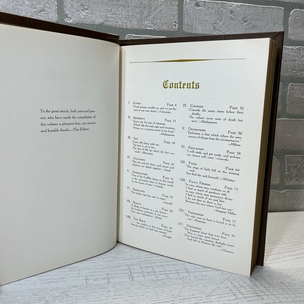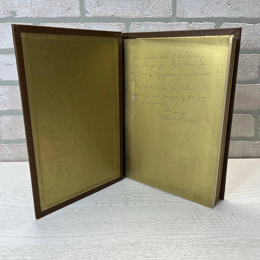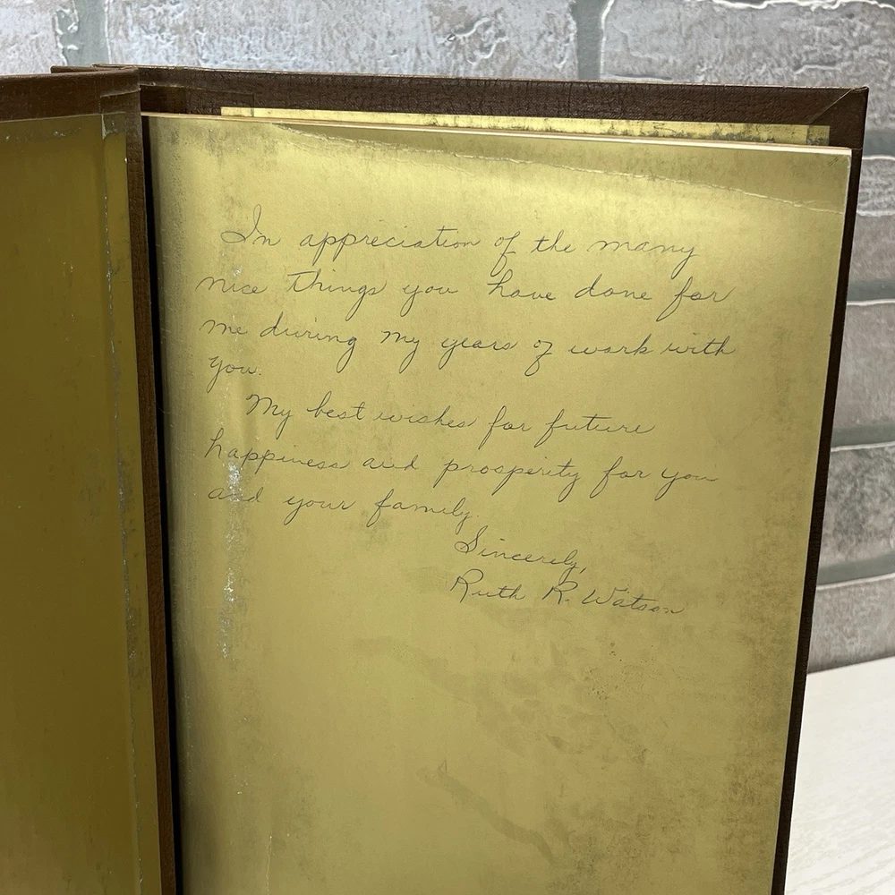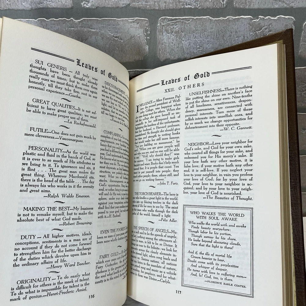 Vintage Leaves of Gold An Anthology of Prayers & Memorable Phrases Edited by: Clyde Francis Lytle. Revised Edition 1948 Vintage book is in good preowned condition. Book shows wear from age, use and storage including wear/rub marks, corner wear, wear to the embossed leaves on the front cover, frayed ends of the cord that binds the book, writing/dedication on the inside front cover page, wear to the inside covers, light yellowing and a small stain on page 41 where I had removed a dried flower. I see no rips or tears. The gold colored edges on the book pages looks nice. Book measures approximately 11" x 8.5" x 1" and has 200 pages filled with prayers & memorable phrases. See all photos for best description. See photos for condition. If you need additional photos, please let me know. Ships within 2 business days of purchase/payment. Shipping USPS