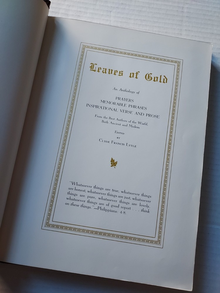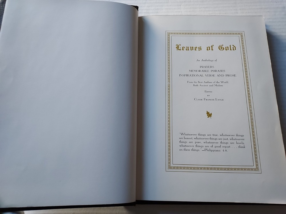 Leaves of Gold An Anthology Of Prayers Phrases 1962 Clyde Francis Lytle. Bumped Rubbed Corners and Edges Marks, scratches on Gold Gilded Edges Shelf Wear Visible Photos Show Condition! Please See Pictures! Available for questions/further pictures and/or description. Thank you for looking! Please check out my other listings! Happy Reading! You Are Appreciated!