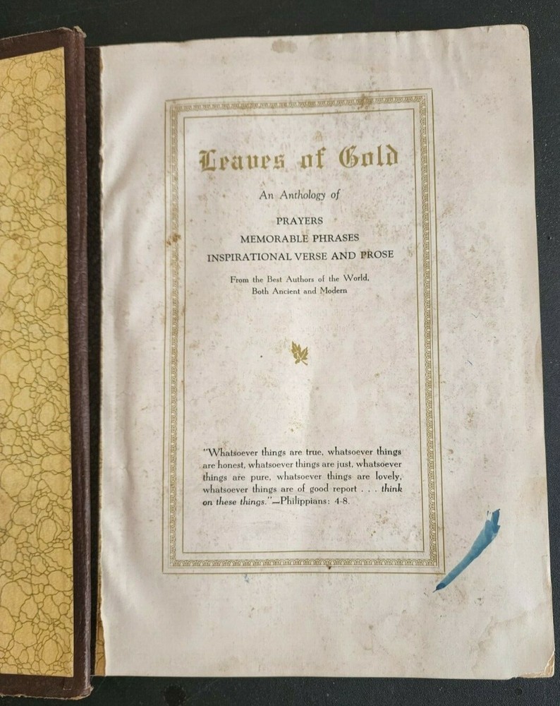 Leaves of Gold - Anthology of Prayers and Verses. Not in the best condition but definitely still readable. prayers, memorable phrases, inspirational verse and pros, religion...