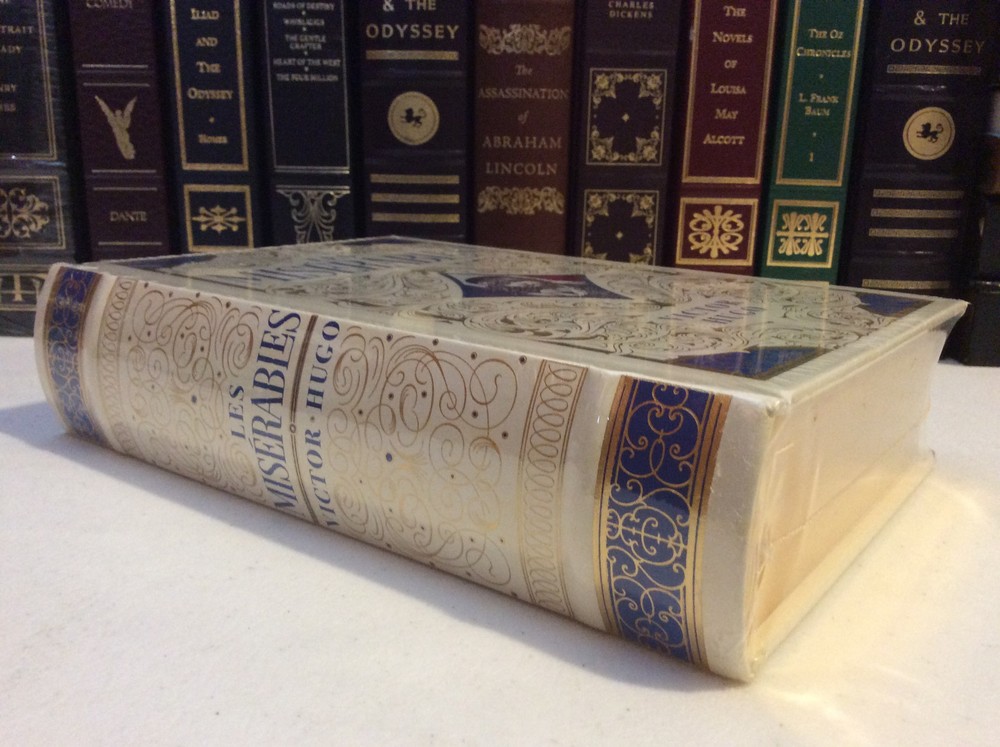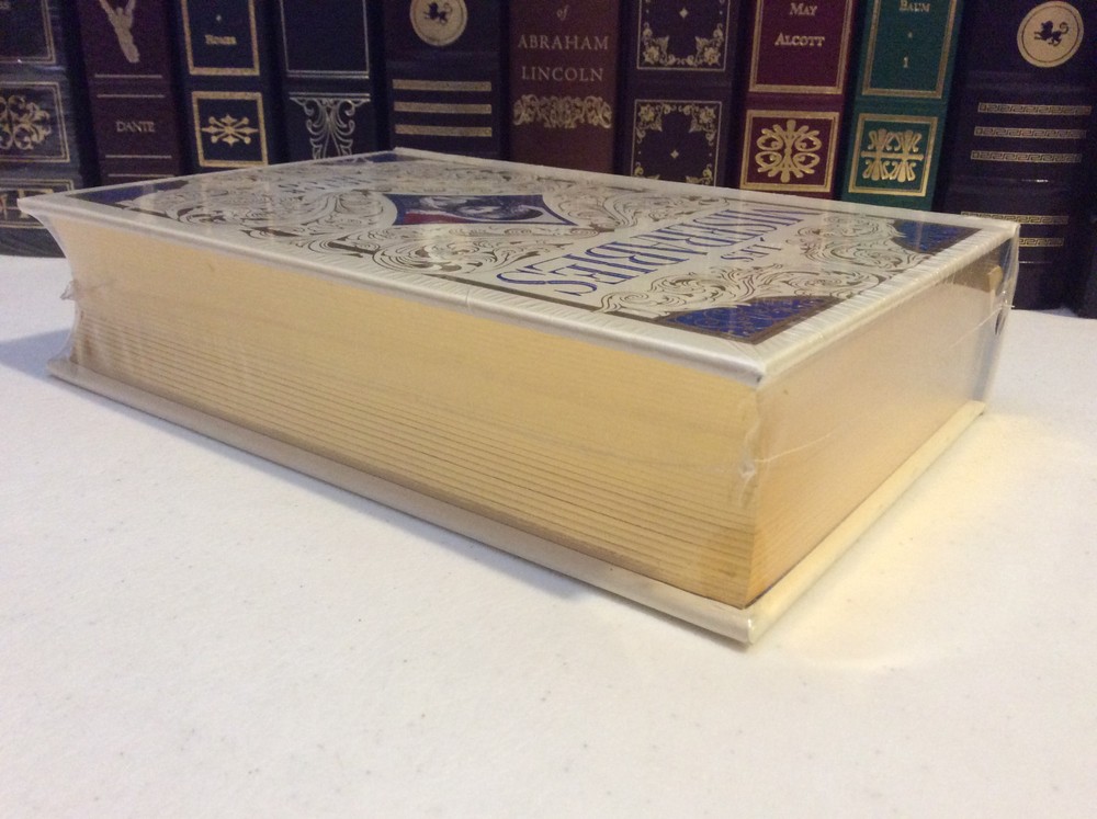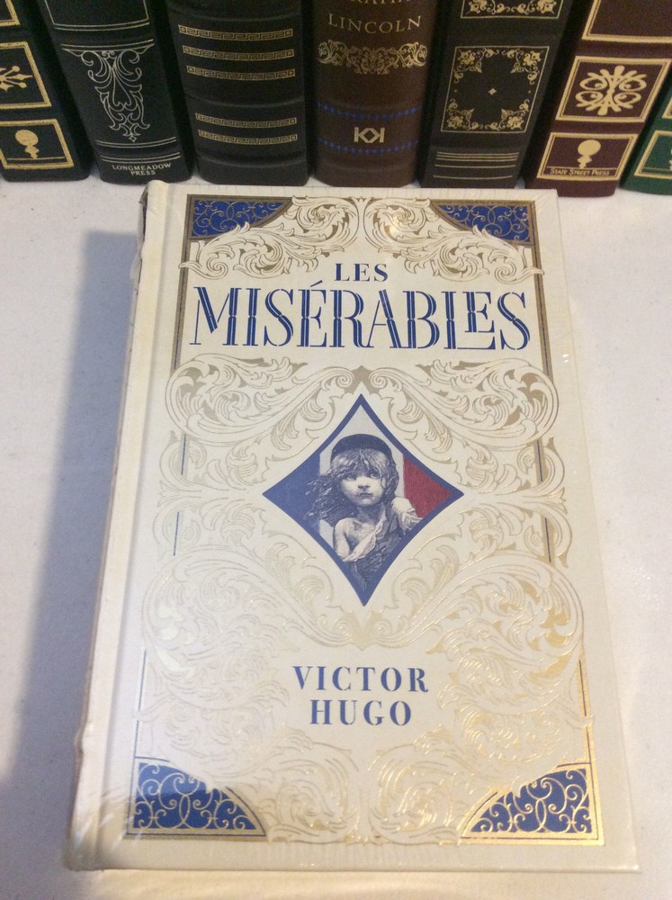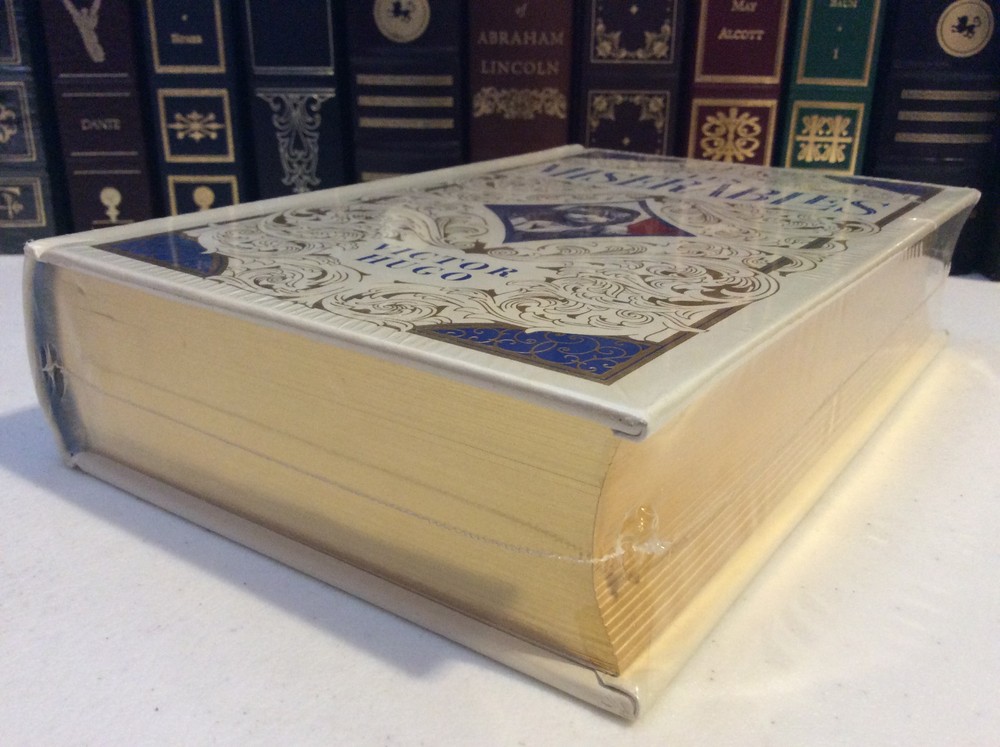 Les Miserables by Victor Hugo bound in leather, gilt page edges and a ribbon marker. Item Condition: A leatherbound hardcover, new, still sealed. Dimensions are approx: 9.25" x 6.25" x 2" This book will ship in a box, with bubble wrap. Photos 1-6 are of the actual book that will be shipped, the rest are examples of the book from an open copy. Les Misérables