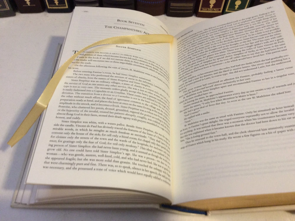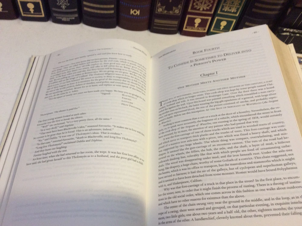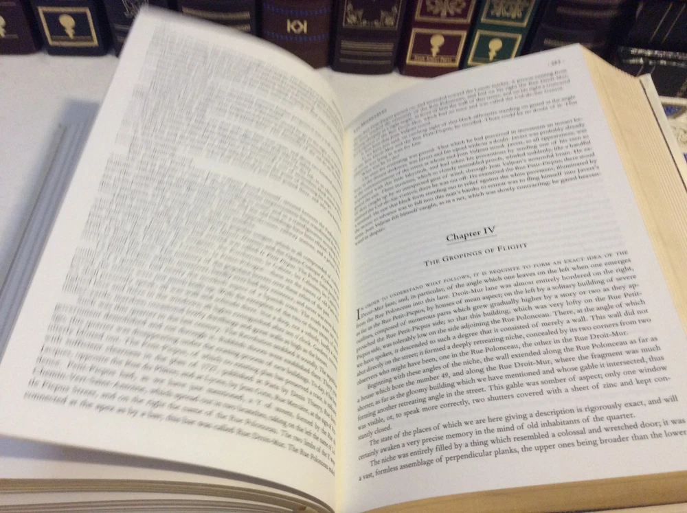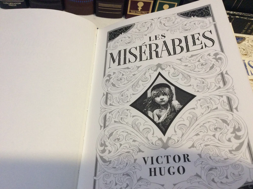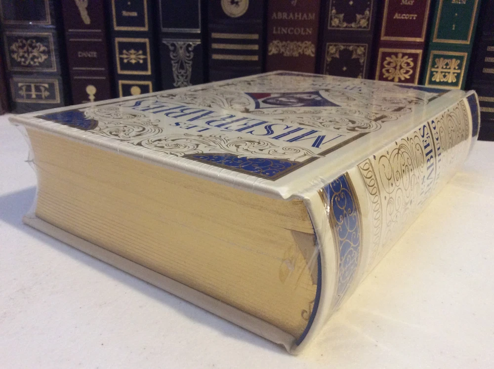 Les Miserables by Victor Hugo bound in leather, gilt page edges and a ribbon marker. Item Condition: A leatherbound hardcover, new, still sealed. Dimensions are approx: 9.25" x 6.25" x 2" This book will ship in a box, with bubble wrap. Photos 1-6 are of the actual book that will be shipped, the rest are examples of the book from an open copy. Les Misérables