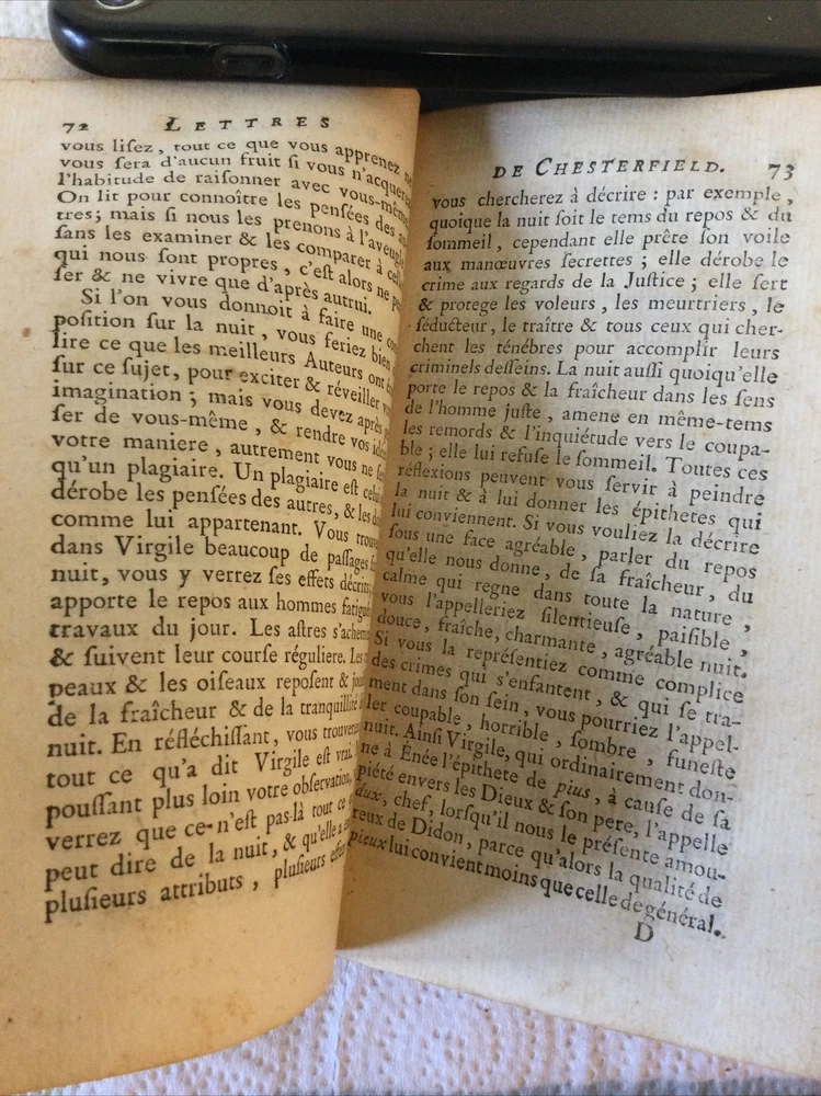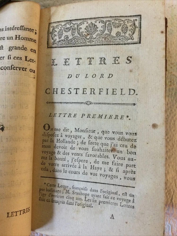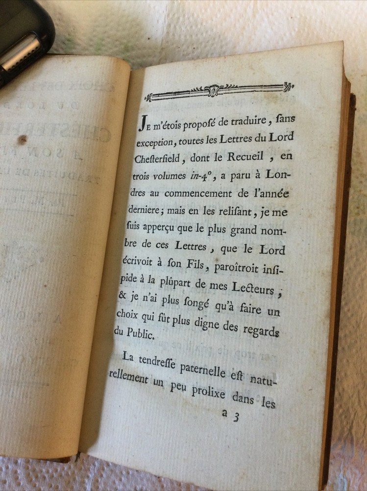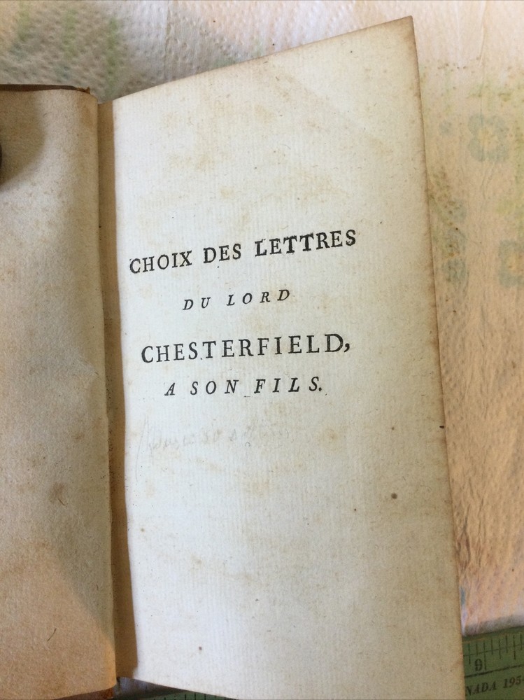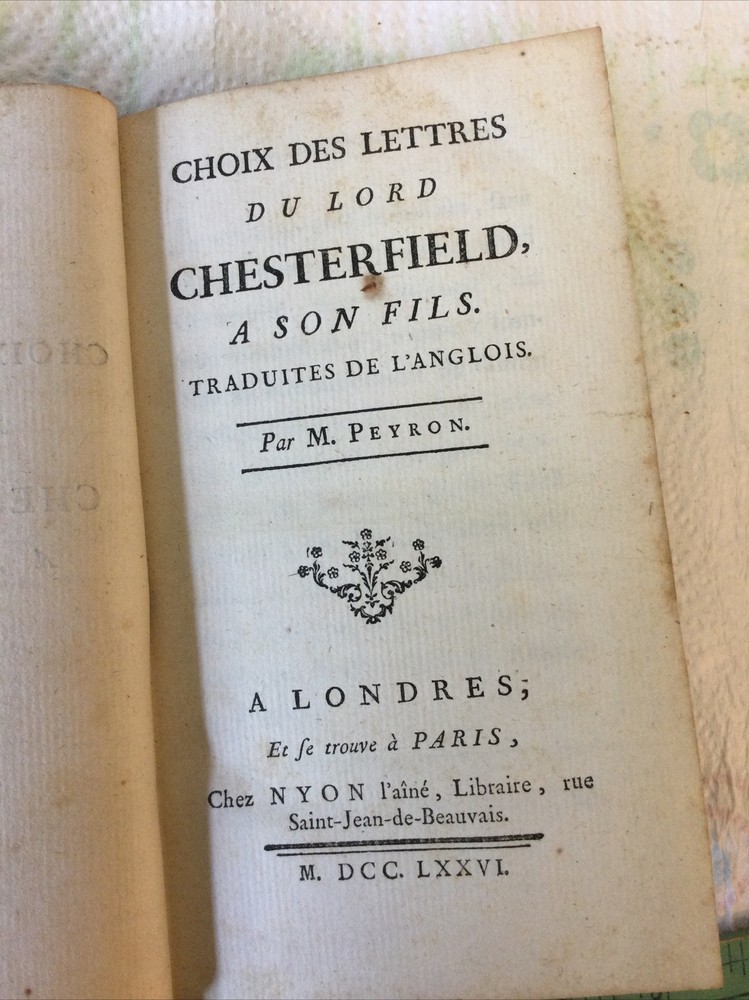 Letters from Lord Chesterfield to His Son in French Language 1776 Leather Bound. "Choix des lettres du lord chesterfield a son fils traduietes de l"anglois - choice of letters from lord chesterfield to his son translated from english". Genuine 1776 original publication - the book is 245 years old! Good solid complete condition with leather boards having normal age related wear and pages having some age toning but no brittle. No missing or loose pages. See my 9 photos. Chesterfield, Philip Dormer Stanhope. Published by Nyon l'ainél ibraire, rue Saint-Jean-de-Beauvais,, 1776 Hardcover. Condition: Fine. No Jacket. 1st Edition. In French, early translation from English. Published by Chez Nyon l'Aine, Hardcover,in Good condition. First French Edition. Small format, contemporary calf, red spine panel with gilt lettering and decoration, xii, 317 pages followed by 5 page index. Philip Dormer Stanhope, 4th Earl of Chesterfield, KG, PC (22 September 1694 – 24 March 1773) was a British statesman, diplomat, and man of letters, and an acclaimed wit of his time. Lord Chesterfield’s Letters to His Son is a compilation of 448 letters from Philip Dormer Stanhope, 4th Earl of Chesterfield (1694–1773), to his son, also named Philip (1732–1768), from the time the boy was five until his death. The letters contain lessons on subjects such as history and mythology in the boy’s youth, but the older he gets, the more the lessons relate to what Stanhope constantly refers to as, “the useful and necessary art of pleasing.” When the boy was eleven, Stanhope wrote that he desired he should be “as near perfection as possible” as “never were such pains taken for anybody’s education” and as his opportunities for knowledge and improvement were unparalleled. “The smallest inattention, or error in manners, the minutest inelegancy of diction, the least awkwardness in your dress and carriage, will not escape my observation,” Chesterfield wrote to his son. Understandably, Philip felt the need to keep secrets from his father. Upon his death from edema in 1768, Chesterfield discovered that Philip had been secretly married for ten years and had two sons. While Chesterfield provided for Philip’s two sons during what remained of his life and in his will, he neglected to leave Philip’s wife Eugenia anything, prompting her to publish over thirty years of his letters to his son. The collection of letters, published in 1774, attracted a great deal of notice in Britain and across the Atlantic.