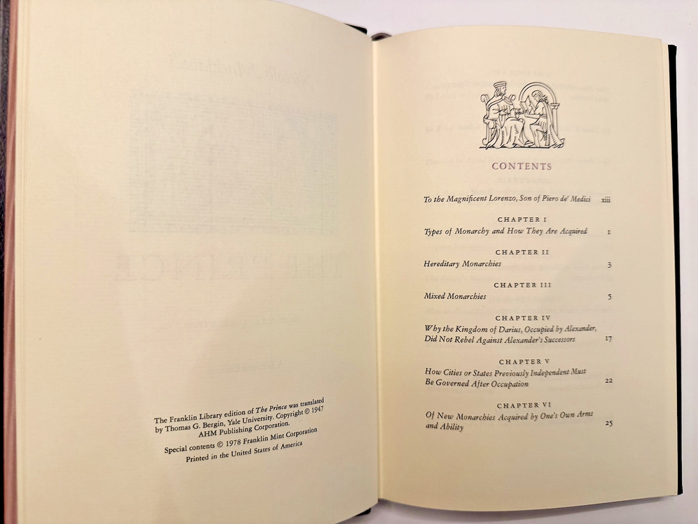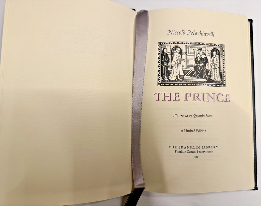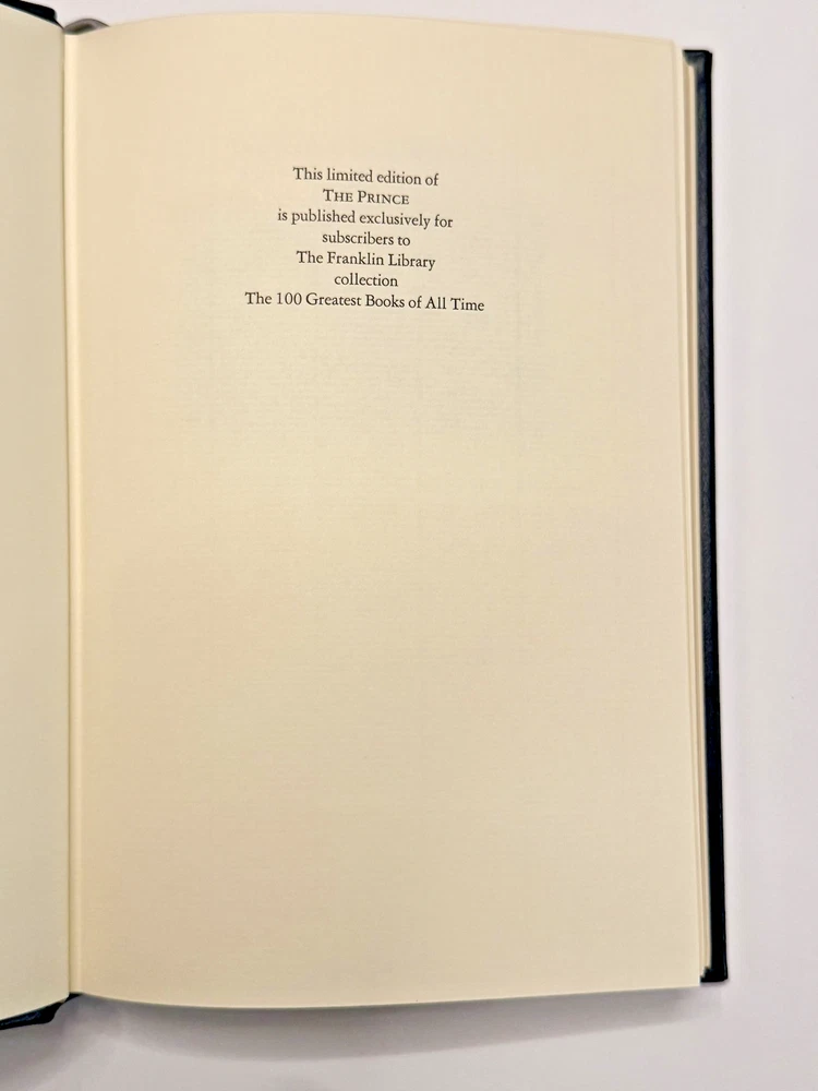 This is a beautiful leather-bound 1978 limited edition of "The Prince" by Niccolò Machiavelli, published exclusively for subscribers to The Franklin Library collection, The 100 Greatest Books of All Time . The book appears to be unread and is in perfect condition. The leather binding is sturdy and the pages are clean and crisp. The text is in English and the book was printed in the United States of America. This is a rare, high-end collector's edition of Machiavelli's most famous work, The Prince .