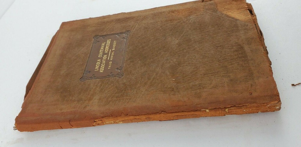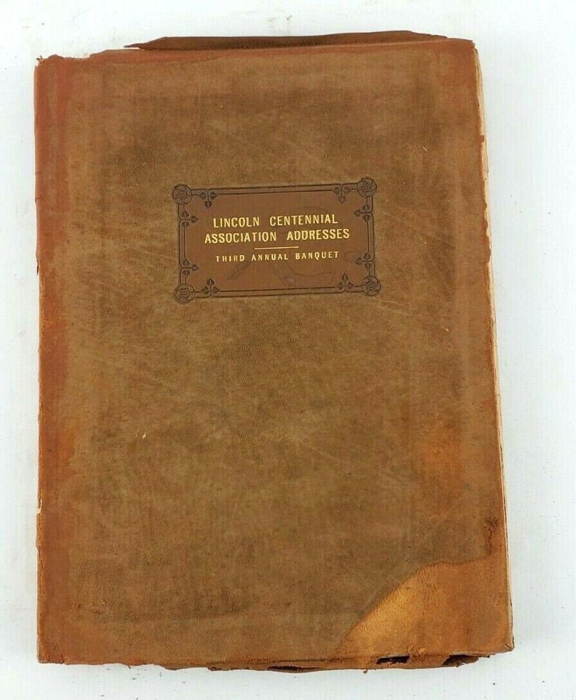 Lincoln Centennial Association Addresses Third Annual Banquet Leather Bound RARE. All Items Come From a Smoke Free Home and Climate Controlled area. Please see item condition for details. Please bid with confidence per my seller rating. Please make sure your PayPal and eBay shipping addresses match. We combine shipping on most items free of charge! If you have a problem with an item or have any questions please message me. Listing and template services provided by inkFrog