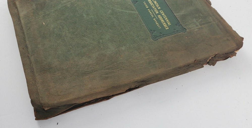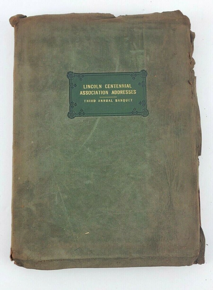 Lincoln Centennial Association Addresses Third Annual Banquet Leather Bound RARE. All Items Come From a Smoke Free Home and Climate Controlled area. Please see item condition for details. Please bid with confidence per my seller rating. Please make sure your PayPal and eBay shipping addresses match. We combine shipping on most items free of charge! If you have a problem with an item or have any questions please message me. Listing and template services provided by inkFrog