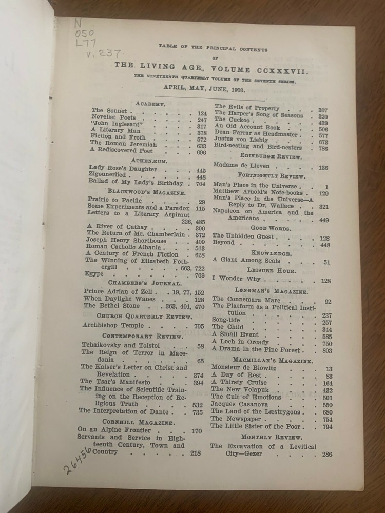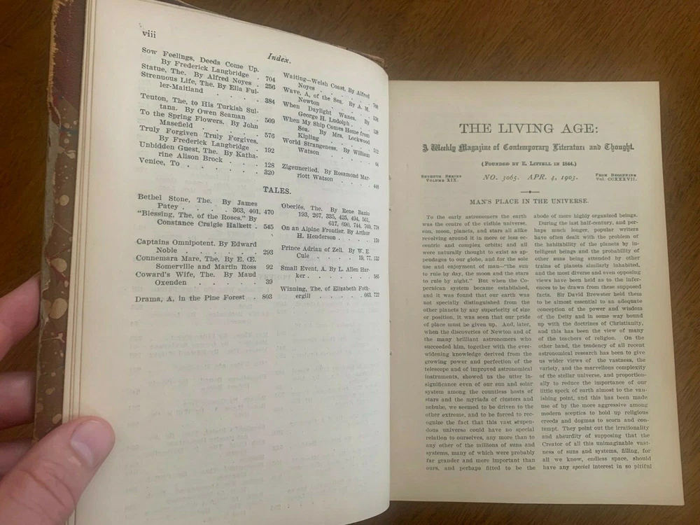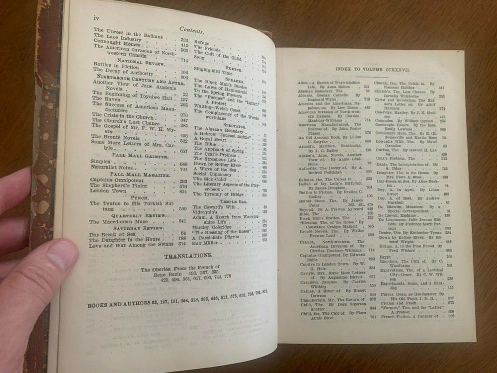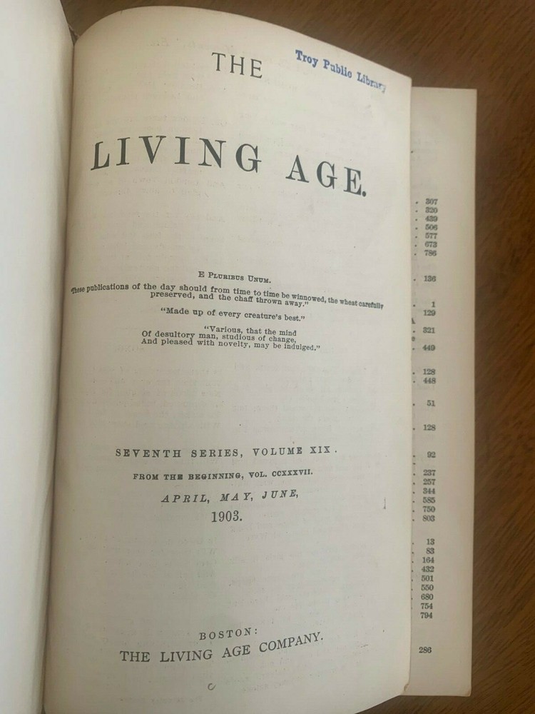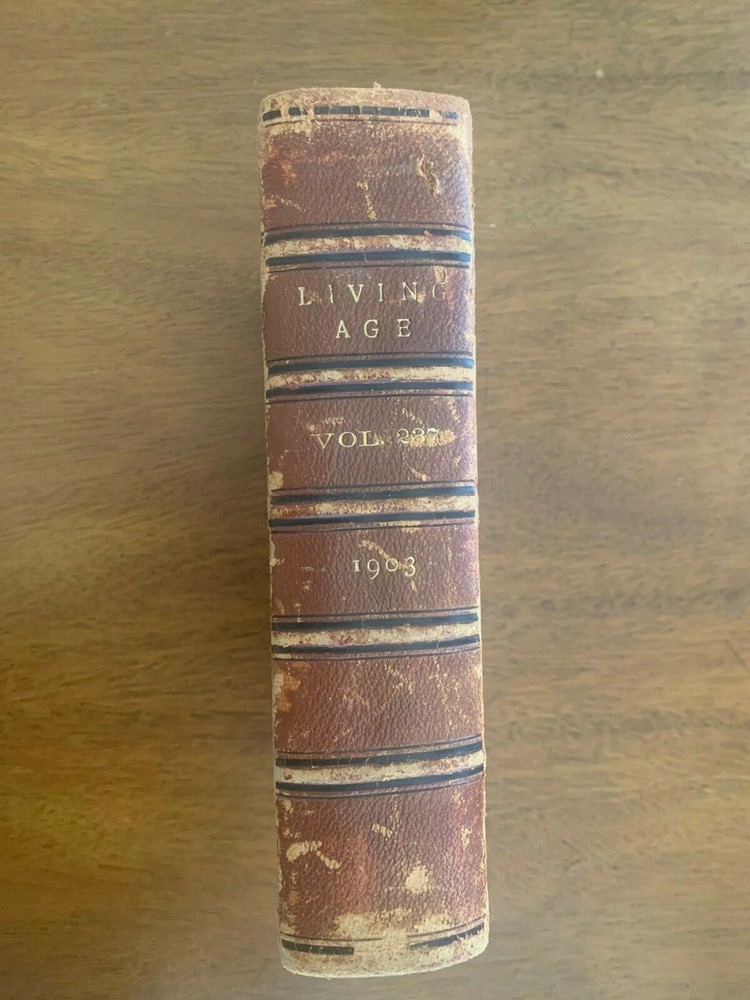 Littell's THE LIVING AGE Vol 237 1903 Leather Bound Collection Writings-Articles Up for sale is a volume 237; April - May - June of 1903 bound collection of Littell's THE LIVING AGE. The leather corners have wear but the spine is sound and the pages are in very nice condition. This was once a library collection so in the first pages there is a stamp from the library and some reference numbers in pencil. I have photographed all pages of the index so if you zoom in you can see the names of the numerous articles and writers contained in this volume. Robert S. Littell's THE LIVING AGE was a magazine comprising selections from various British and American magazines and newspapers published usually on a weekly basis from 1844-1941. I'm happy to combine shipping for multiple purchases when it can be done in a way that keeps all items safe. *Please note that my shipping time is up to 5 business days as I have multiple jobs and can only ship one day a week. If you happen to purchase after I return from the post office on shipping day it will be a full week wait until I am able to ship again. But most people will have a much shorter wait and some will have very fast shipping. No one will have to wait more than 5 business days. Thank you for understanding.