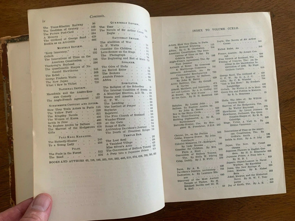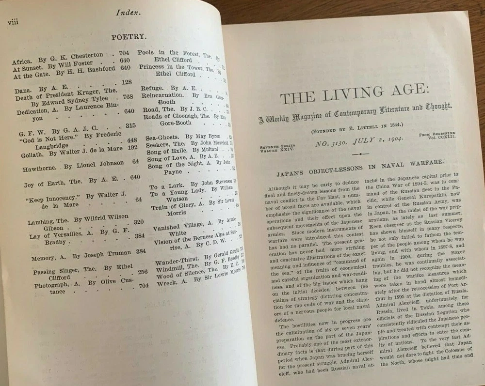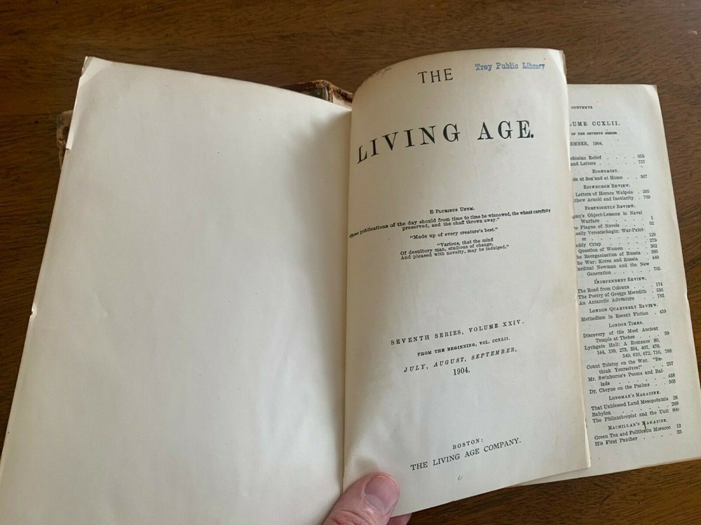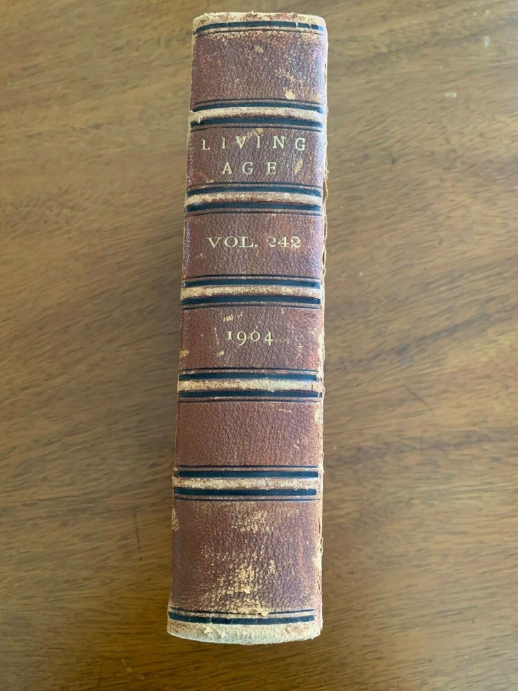 Littell's THE LIVING AGE Vol 242 1904 Leather Bound Collection Writings-Articles Up for sale is a volume 242; July-August-September of 1904 bound collection of Littell's THE LIVING AGE. The leather corners have wear. As in the photo, the book looks fine but when you open it the cover has pulled away from the spine and needs to be reglued. The first batch of 4 or five pages together but loose from the spine. The rest of the pages are in nice condition. This was once a library collection so in the first pages there is a stamp from the library and some reference numbers in pencil. I have photographed all pages of the index so if you zoom in you can see the names of the numerous articles and writers contained in this volume. Robert S. Littell's THE LIVING AGE was a magazine comprising selections from various British and American magazines and newspapers published usually on a weekly basis from 1844-1941. I'm happy to combine shipping for multiple purchases when it can be done in a way that keeps all items safe. *Please note that my shipping time is up to 5 business days as I have multiple jobs and can only ship one day a week. If you happen to purchase after I return from the post office on shipping day it will be a full week wait until I am able to ship again. But most people will have a much shorter wait and some will have very fast shipping. No one will have to wait more than 5 business days. Thank you for understanding.