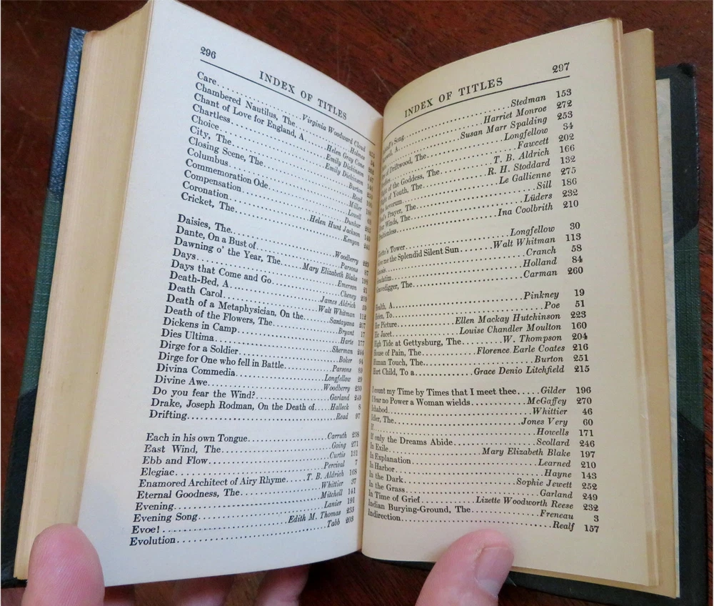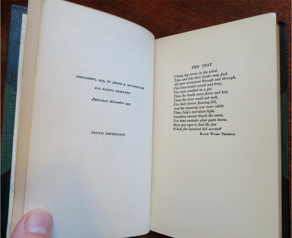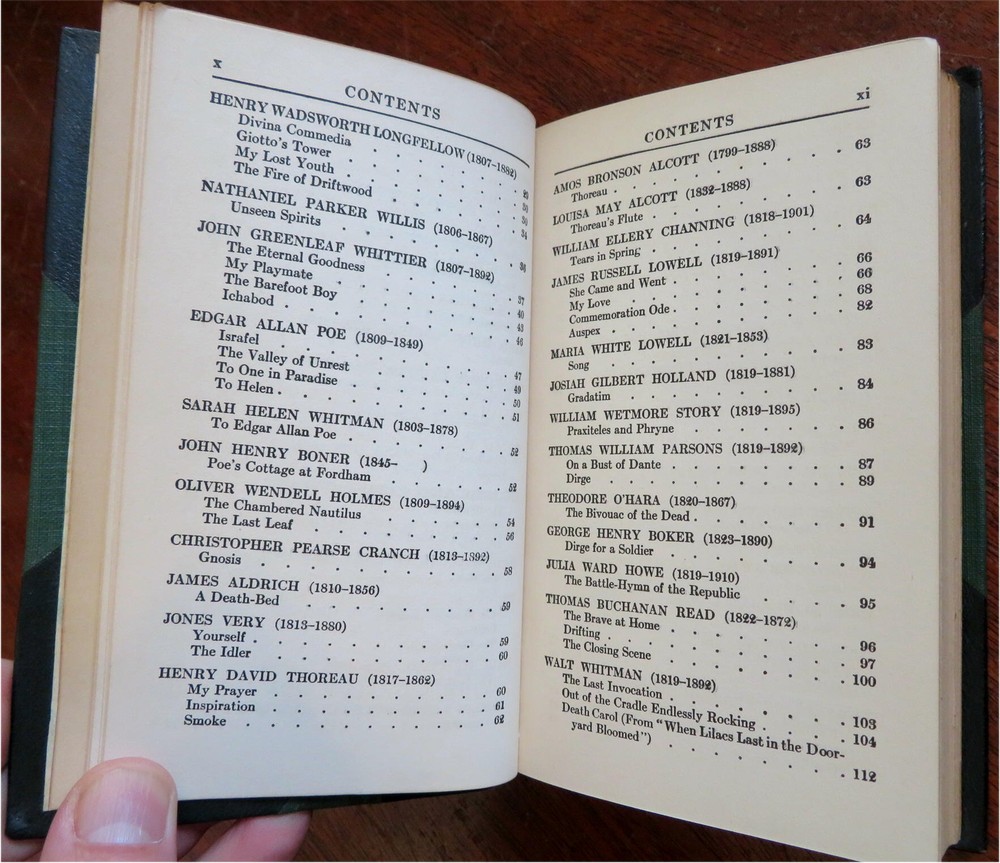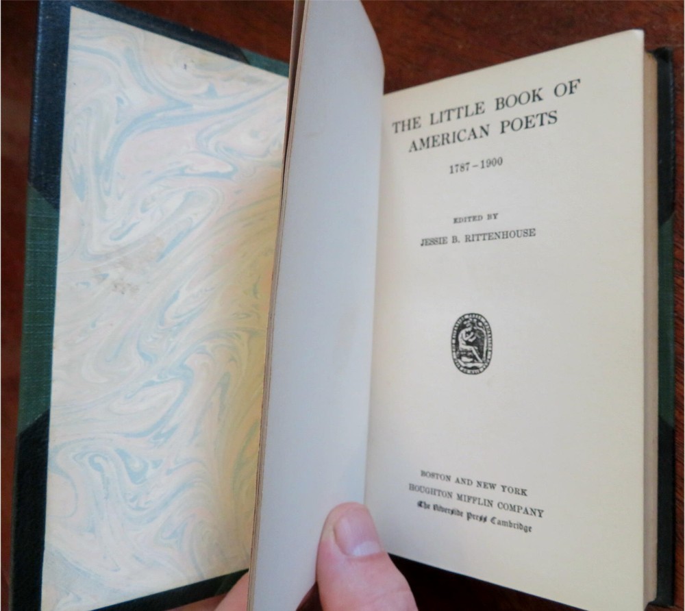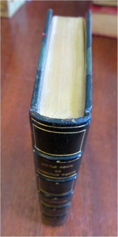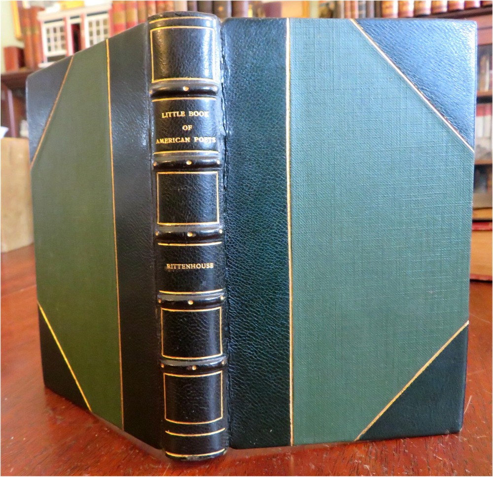Little Book of American Poets Collected Poems 1915 lovely leather book Little Book of American Poets Collected Poems 1915 lovely leather book (Old Books, Early 20th Century Books, Leather Books, Americana, Poetry, Collected Poems). The Little Book of American Poets: 1787-1900, edited by Jessie B. Rittenhouse. Published 1915, Boston & New York by Houghton Mifflin Company. 306 pages. Text in English. Attractive antiquarian 1/2 leather binding, raised & gilt bands, gilt title lettering, gilt ruled compartment decorations, cloth covers, marbled end papers. Book is physically old and shows some signs of handling and time. Binding gently age worn but still appealing, leather and joints slightly rubbed but still supple, remains overall very attractive as an object. Text block paper is gently age toned as typical, internally book remains mostly clean, tight and sound. A book which has been taken care of but may/ does not look like new. Still attractive on the shelf. Book displays a pleasing and unique age patina and is in rather nice antiquarian condition, any age flaws seem easy to overlook or forgive. Please review photos for more detailed attempt to present this book as it survives. We often over-describe any flaws that many sellers would not even bother to mention since most people would overlook them as minor and unworthy of comment. Many people tell us the books they receive from us are nicer in person than they appears on the screen. We want you to be clear about what you are buying, so we take numerous photos and try to describe it openly and honestly. Book Measures c. 6 3/4" H x 4 1/4" W. [B8964].