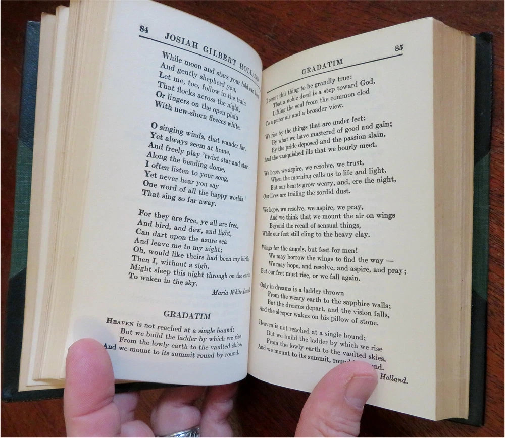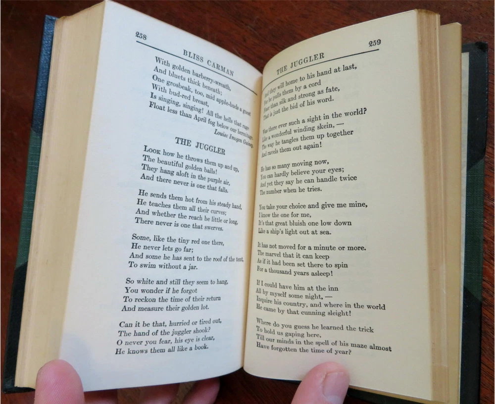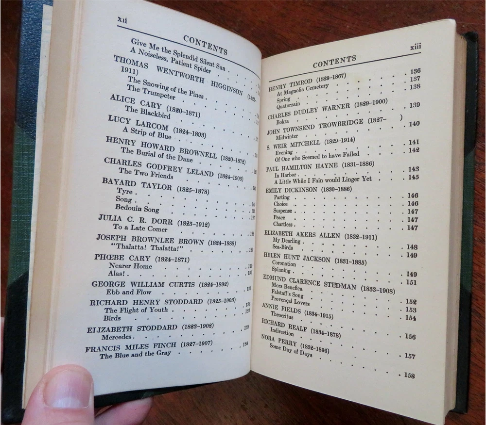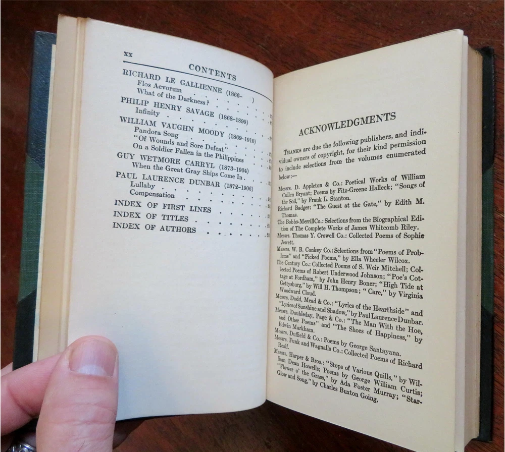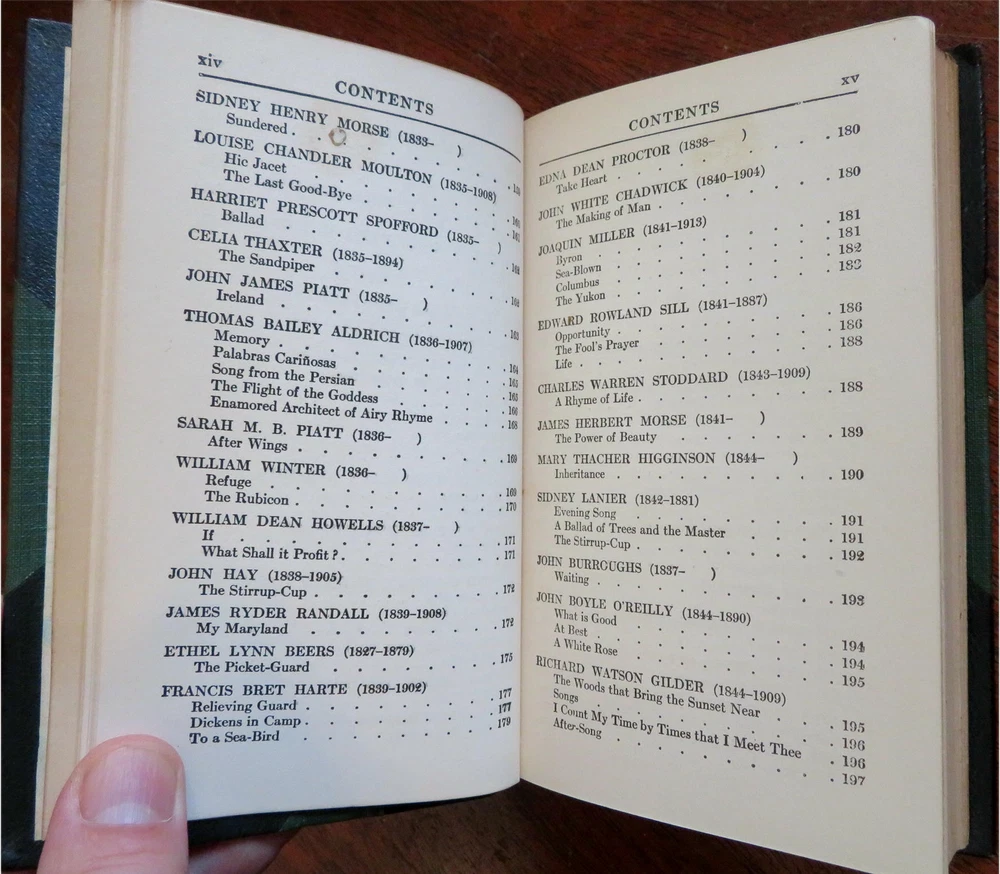 Little Book of American Poets Collected Poems 1915 lovely leather book Little Book of American Poets Collected Poems 1915 lovely leather book (Old Books, Early 20th Century Books, Leather Books, Americana, Poetry, Collected Poems). The Little Book of American Poets: 1787-1900, edited by Jessie B. Rittenhouse. Published 1915, Boston & New York by Houghton Mifflin Company. 306 pages. Text in English. Attractive antiquarian 1/2 leather binding, raised & gilt bands, gilt title lettering, gilt ruled compartment decorations, cloth covers, marbled end papers. Book is physically old and shows some signs of handling and time. Binding gently age worn but still appealing, leather and joints slightly rubbed but still supple, remains overall very attractive as an object. Text block paper is gently age toned as typical, internally book remains mostly clean, tight and sound. A book which has been taken care of but may/ does not look like new. Still attractive on the shelf. Book displays a pleasing and unique age patina and is in rather nice antiquarian condition, any age flaws seem easy to overlook or forgive. Please review photos for more detailed attempt to present this book as it survives. We often over-describe any flaws that many sellers would not even bother to mention since most people would overlook them as minor and unworthy of comment. Many people tell us the books they receive from us are nicer in person than they appears on the screen. We want you to be clear about what you are buying, so we take numerous photos and try to describe it openly and honestly. Book Measures c. 6 3/4" H x 4 1/4" W. [B8964].