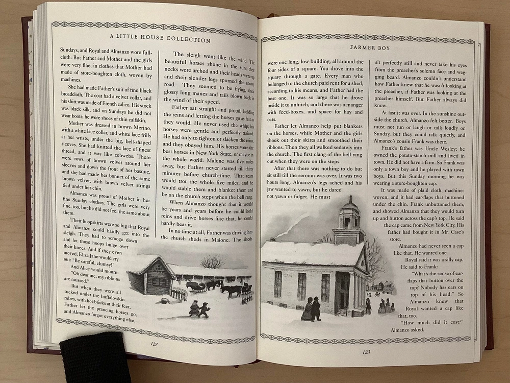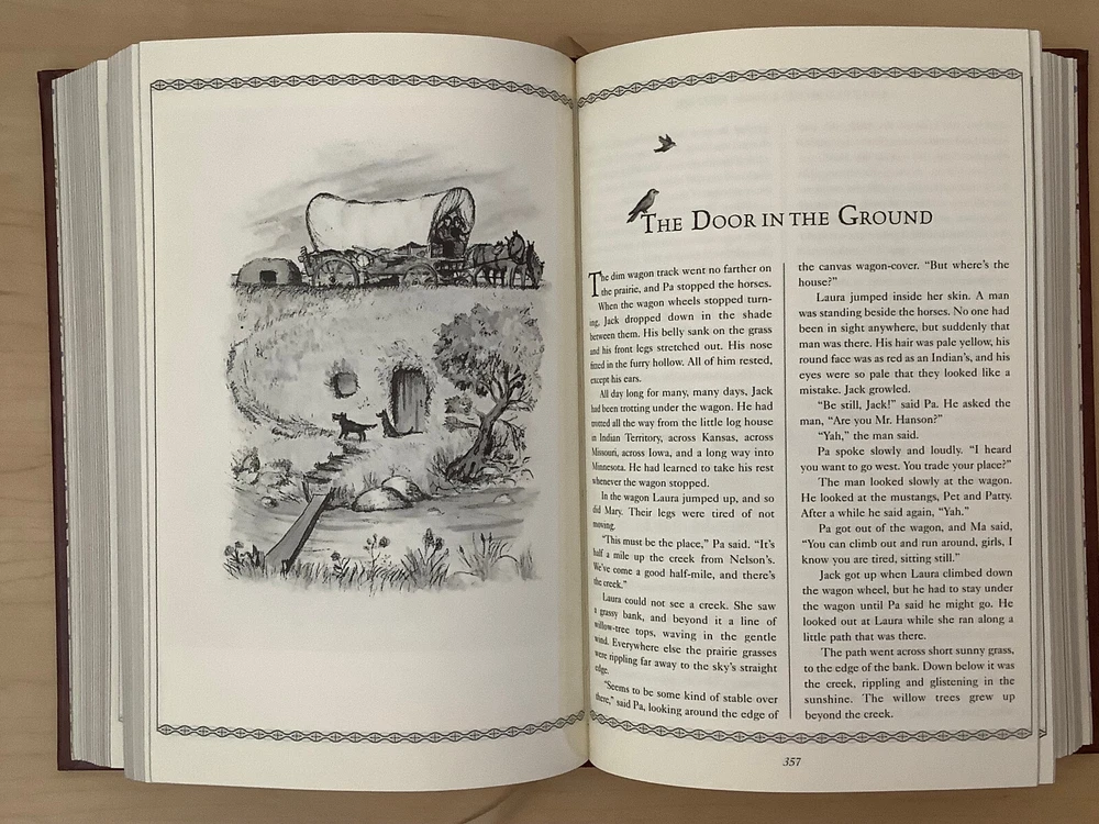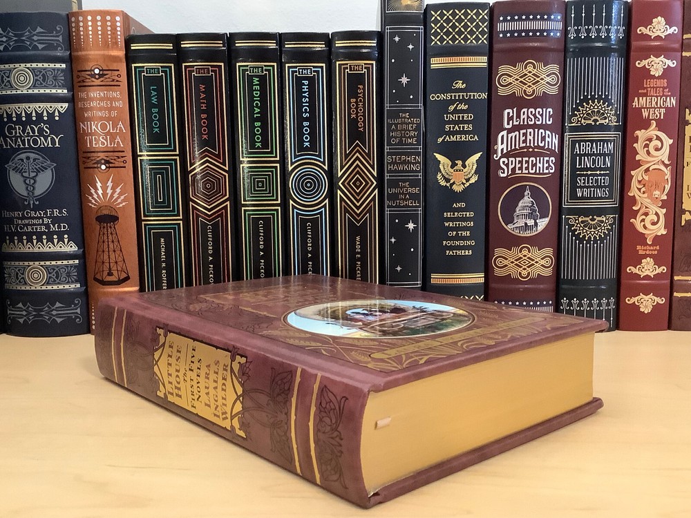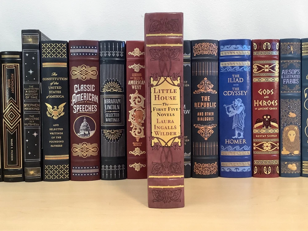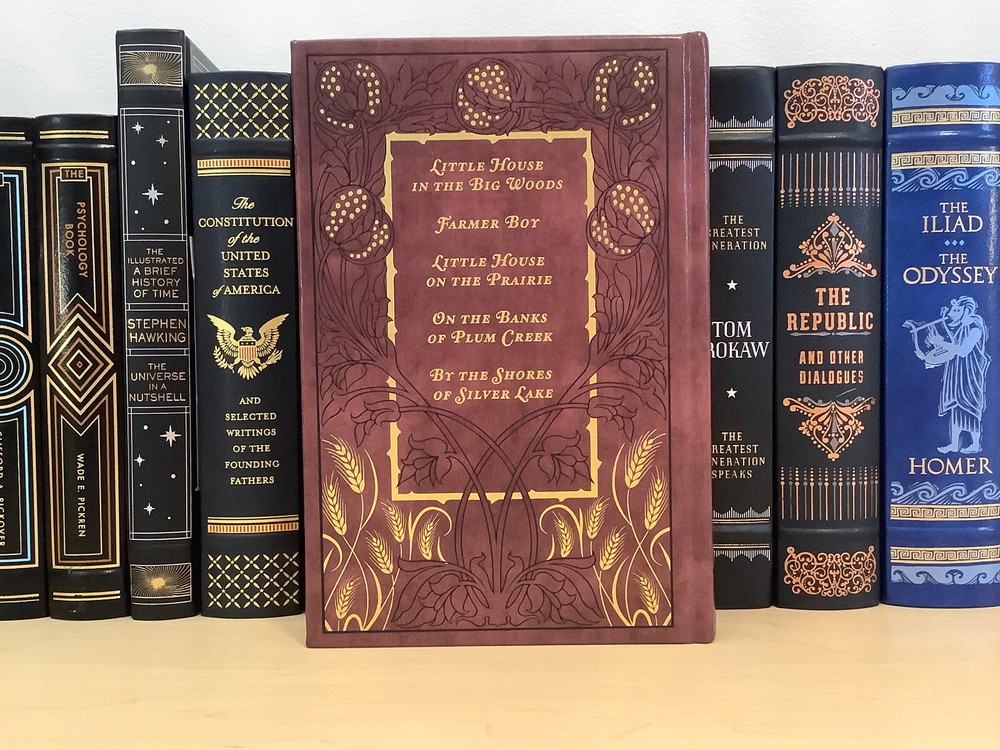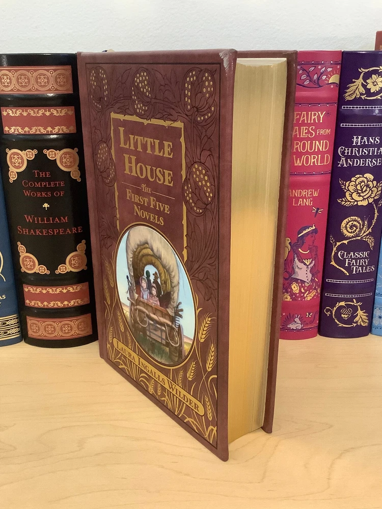 Little House – The First Five Novels by Laura Ingalls Wilder bound in leather, with gilt edged pages and a ribbon marker illustrated by Garth Williams contents: Little House In The Big Woods Farmer Boy Little House On The Prairie On The Banks Of Plum Creek By The Shores Of Silver Lake Item Condition: This is a leatherbound hardcover in Very Good condition. There are no names, bookplates or stamps from previous owners inside. The binding is tight, with a slight sag to the printblock, and the pages are clean. The gilt page edging has some wear with marks and scrapes to it. The leather is in nice condition, with a scuff on the top front corner (see photos #1 & #5), and the spine and corners have light bumping and rubbing to them. Dimensions are approx: 9.25" x 6.25" x 1.75" This book will ship in a box with bubble wrap. Photos are of the actual book that will be shipped.
