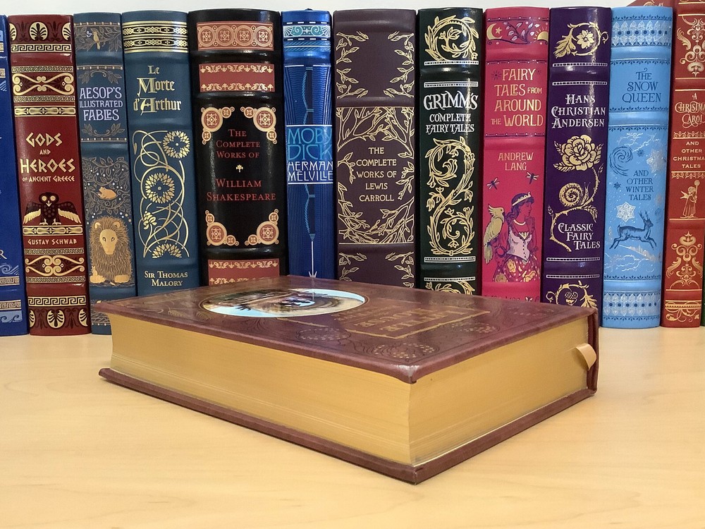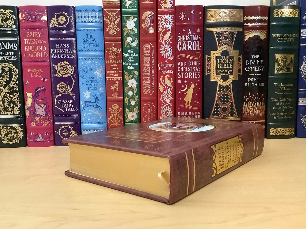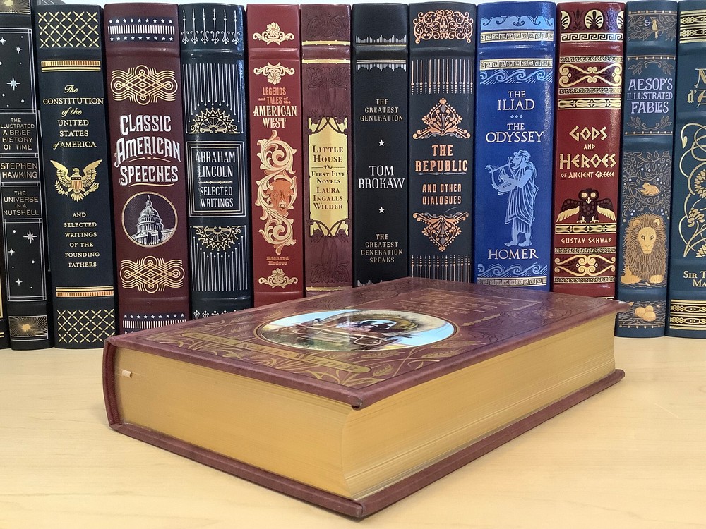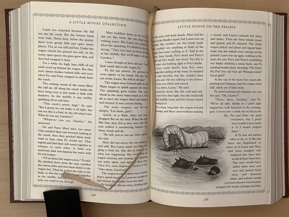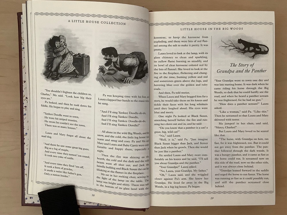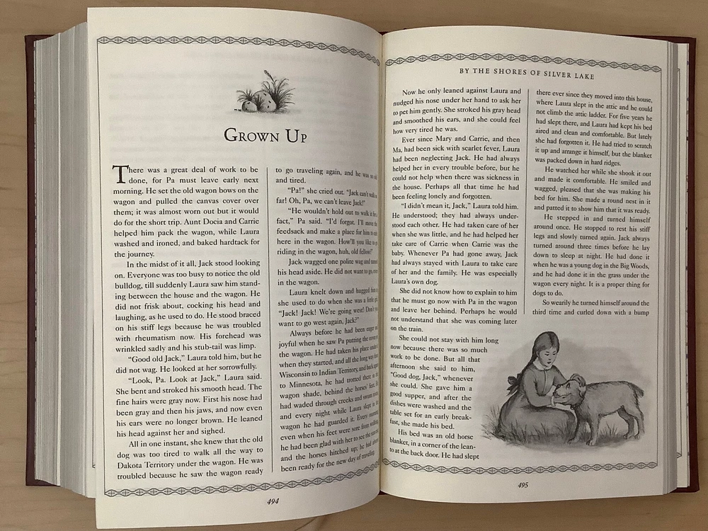 Little House – The First Five Novels by Laura Ingalls Wilder bound in leather, with gilt edged pages and a ribbon marker illustrated by Garth Williams contents: Little House In The Big Woods Farmer Boy Little House On The Prairie On The Banks Of Plum Creek By The Shores Of Silver Lake Item Condition: This is a leatherbound hardcover in Very Good condition. There are no names, bookplates or stamps from previous owners inside. The binding is tight, with a slight sag to the printblock, and the pages are clean. The gilt page edging has some wear with marks and scrapes to it. The leather is in nice condition, with a scuff on the top front corner (see photos #1 & #5), and the spine and corners have light bumping and rubbing to them. Dimensions are approx: 9.25" x 6.25" x 1.75" This book will ship in a box with bubble wrap. Photos are of the actual book that will be shipped.