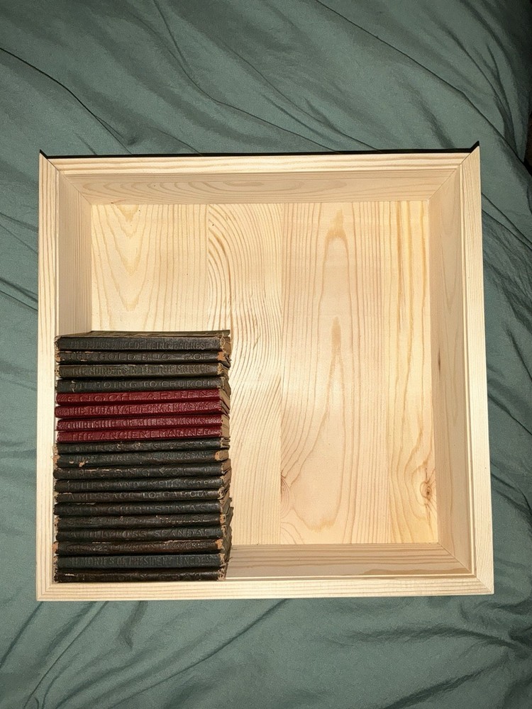 The Little Leather Library Collection, Quantity 19, includes miniature leather-bound books in English language, focusing on literature and fiction. This set comes with a shadow box for display, adding a touch of elegance to any collection. The books are original, not facsimiles, and were manufactured in North America, specifically the United States. Perfect for book lovers looking to add unique and collectible pieces to their library.
