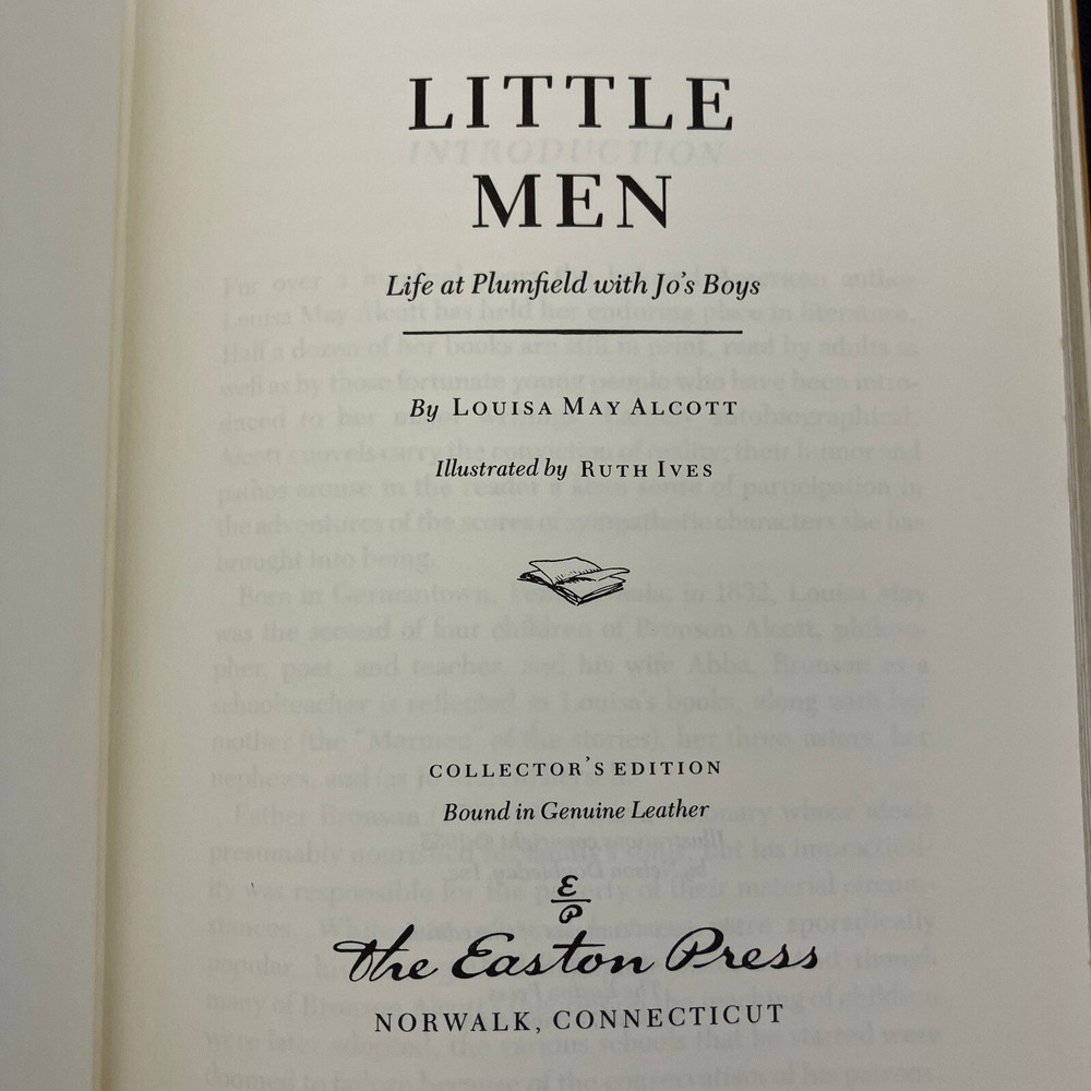 Little Men by Louisa May Alcott Easton Press American Literature 1988 Leather HC This is a used book with general edge and shelf wear, some fading to the covers and spotting on gilded page edges. Binding is intact, no writing, stains, or unusual smells. See pictures for overview of condition. We are BrightLight Books. We have sold tens of thousands of items online since 1998. Money Back Guaranteed! For Local Pickup in our Fern Park, FL store, please message us! 10-45 (5010717) 11/11/2024 AH