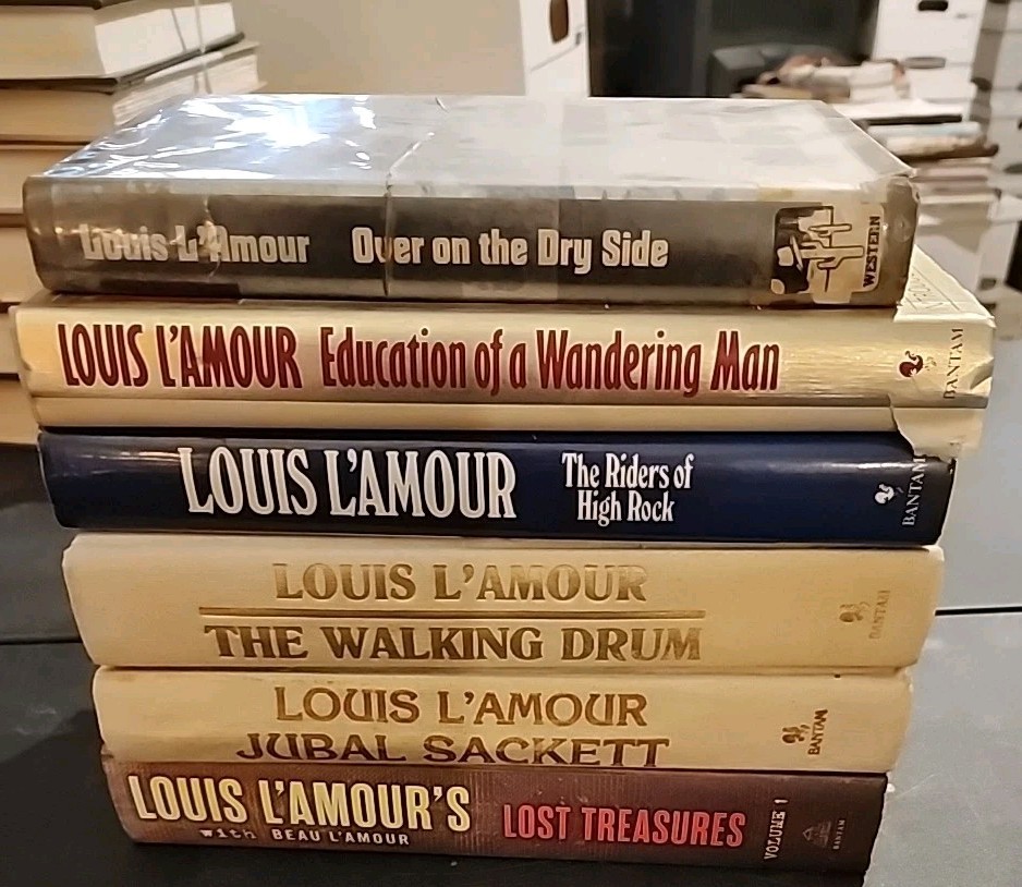 This lot includes six hardcover books from The Louis L'Amour Collection, featuring titles such as The Riders Of High Rock, Education Of A Wondering Man, The Walking Drum, Jubal Sackett, Lost Treasures Volume I, and Over On The Dry. These books are part of a Western genre, with cowboy and western themes. The books are in English and were published by Bantam Books. Each book measures 9.25 inches in length and 6.25 inches in width. They are faux leather bound and have a vintage look. These books are perfect for collectors and fans of Western novels.