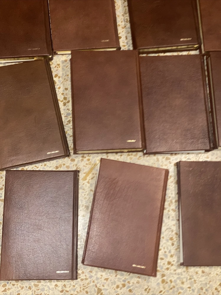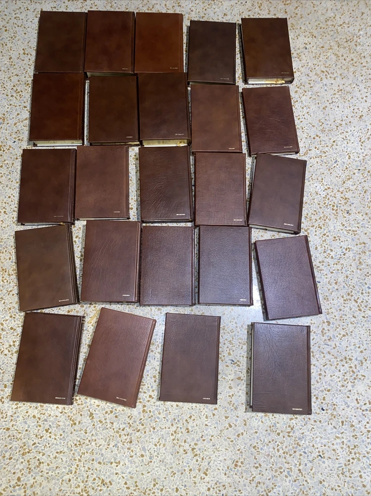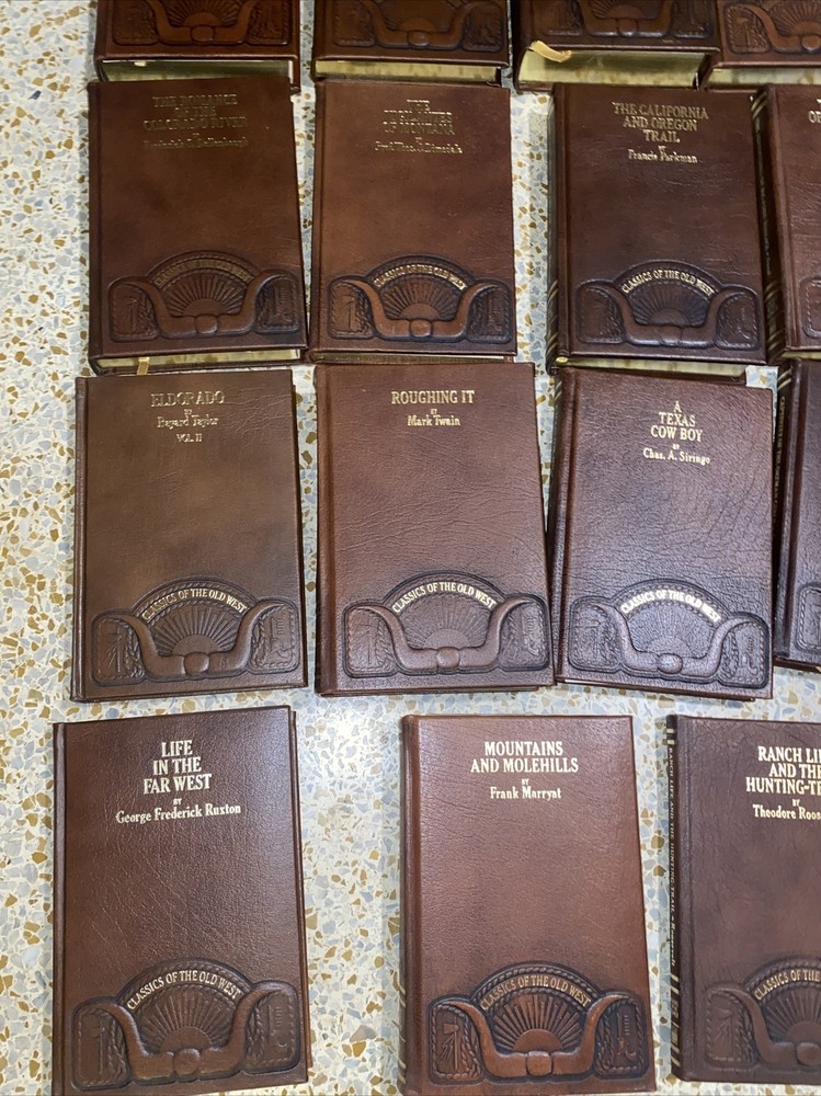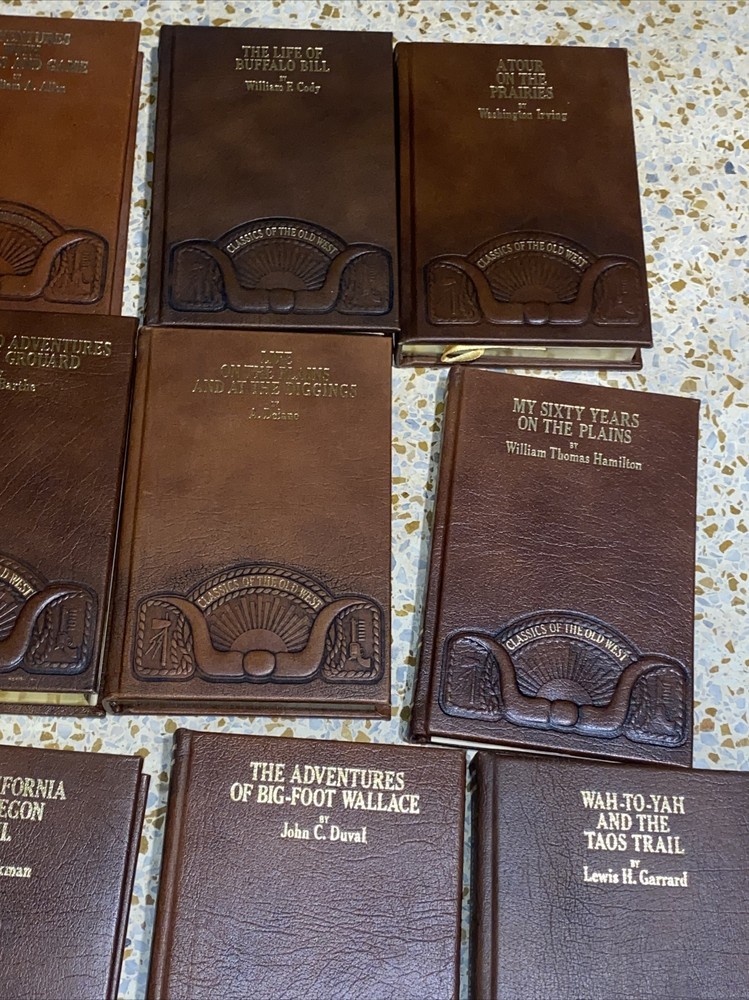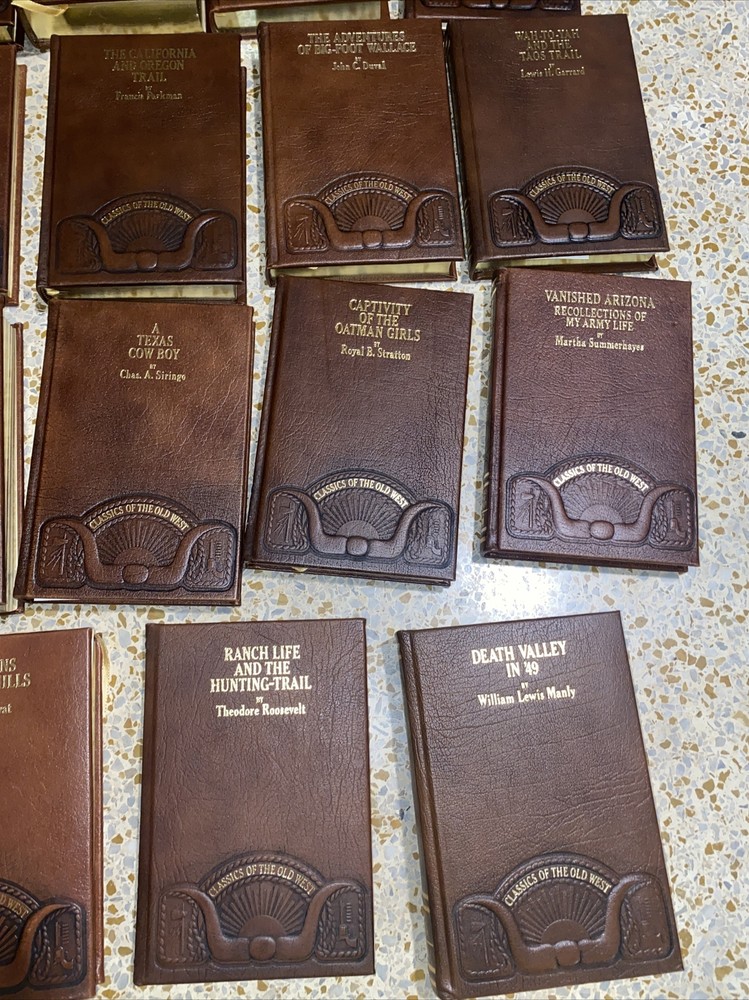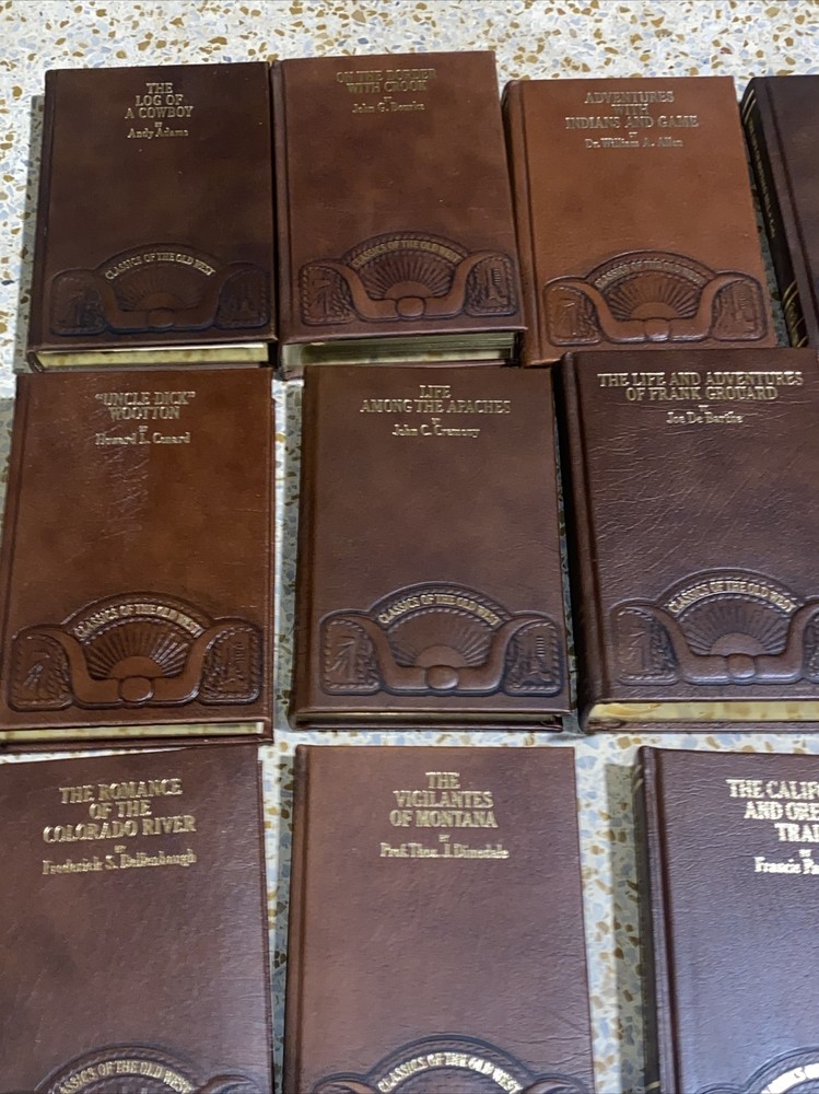 Lot of 24 LEATHER Classics Of The Old West Time Life Books Set 1982 Very Good condition overall. Most moola have the original advertisements in the front. Books feel tight and some may have been read once. No writing, tears, stains, or highlights. There is an exception, the adventures of Bigfoot Wallace. It has a small tear near the bottom of the spine. It’s on the outside and is pictured. The rest of the books are In like new condition. Titles are: The romance of the Colorado river The vigilantes of Montana El Dorado Life in the far west Ranch life and the hunting trail Death valley in 49 Mountains and molehills A tour on the prairies The life of Buffalo Bill Adventures with Indians and game On the border with crook A log of a cowboy My 60 years on the plains Life on the plains and at the digging’s The life and adventures of Frank Grouard “Uncle Dick” Wooten Life among the Apaches The California and Oregon trail Vanished Arizona Captivity of the Oatman girls Roughing it, twain A Texas cow boy Wah-to-yah sand the Taos trail