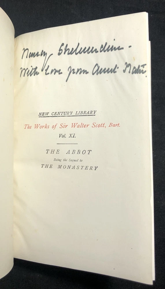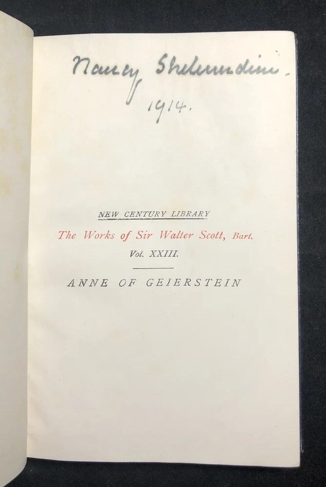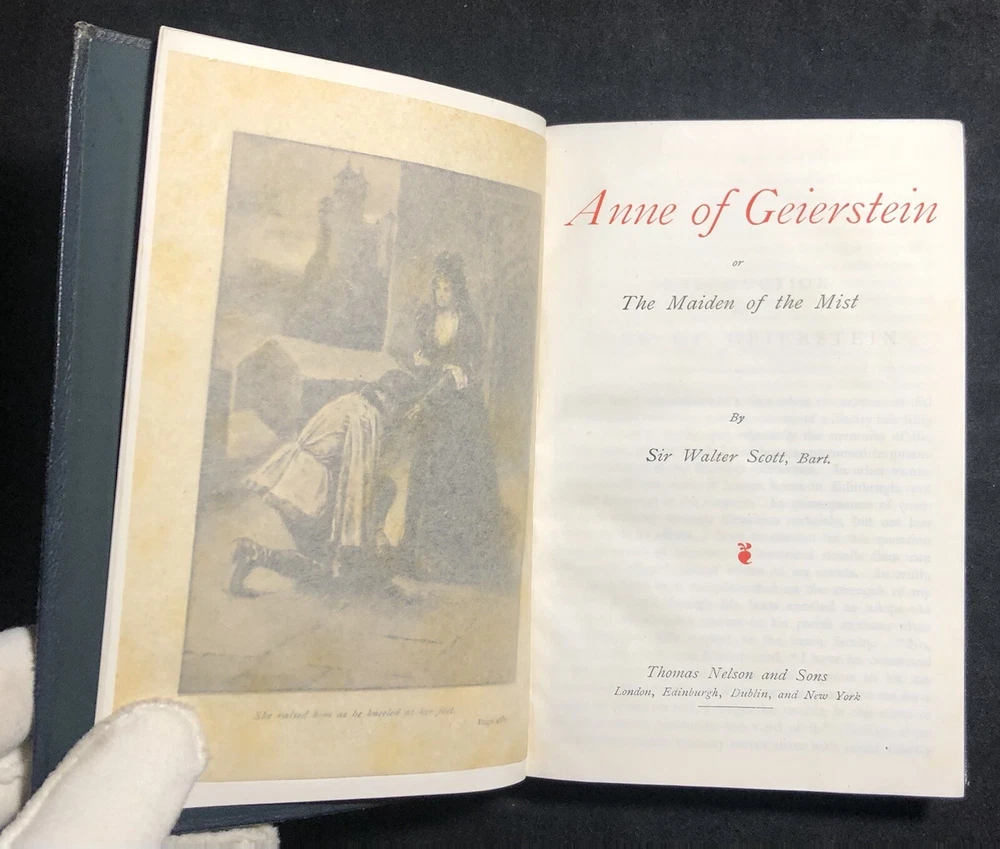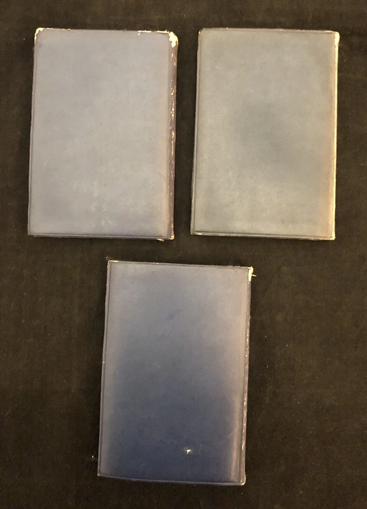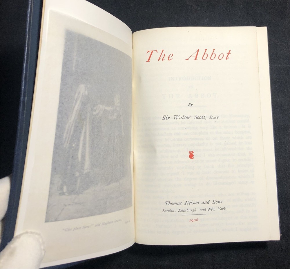 Lot of 3 blue leather bound Sir Walter Scott novels: The Monastery, its sequel The Abbot, and Anne of Geierstein. Illustrated with black and white frontispieces and plates. Gold painted on the tops of the text blocks. White ribbon bookmarks. Volumes X, XI, and XXIII, New Century Library published by Thomas Nelson & Sons in 1906, 1907, and c.1914. Measures 6-1/4 x 4-1/4 x 5/8 inches. In good preowned condition. Some wear on the covers, mainly on the corners and the spines. Anne of Geierstein has more wear and overall fading on the covers. Bindings are tight. Some foxing on the ends of the text blocks. Pages are clean, however. Inscriptions in vintage felt tip pen on the flyleaves, one dated 1914. See images for details. N-B11