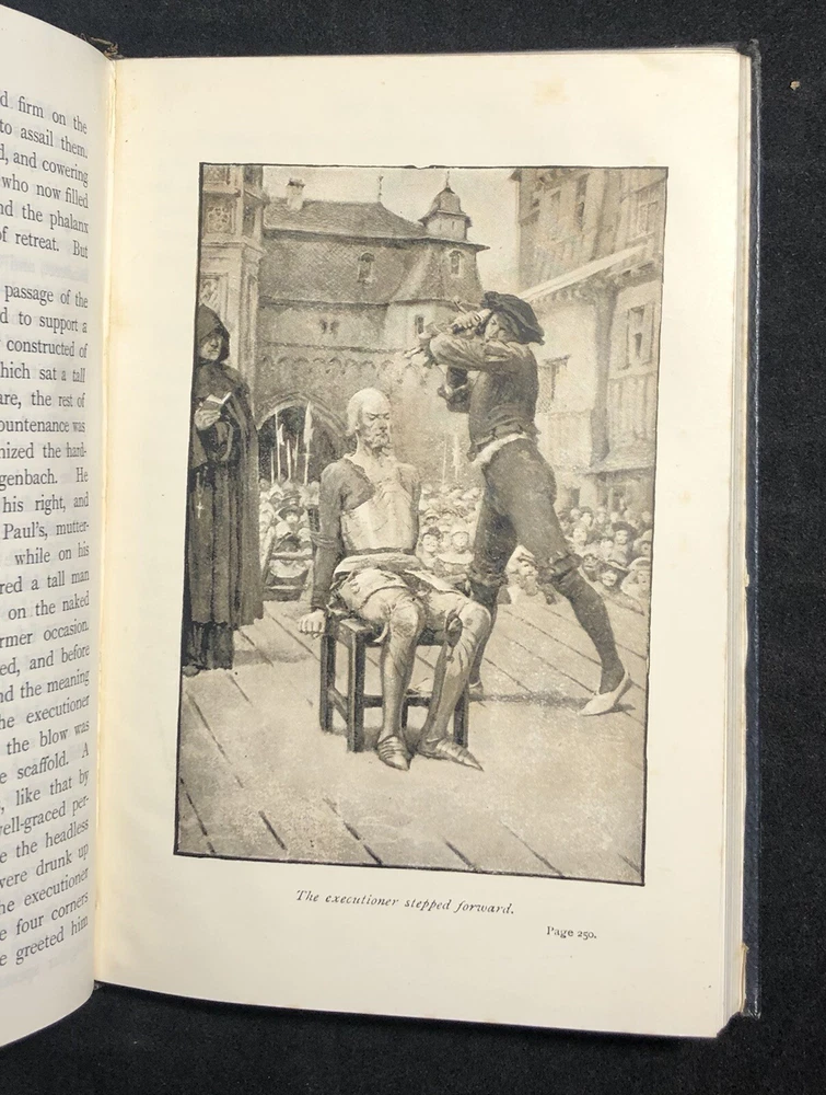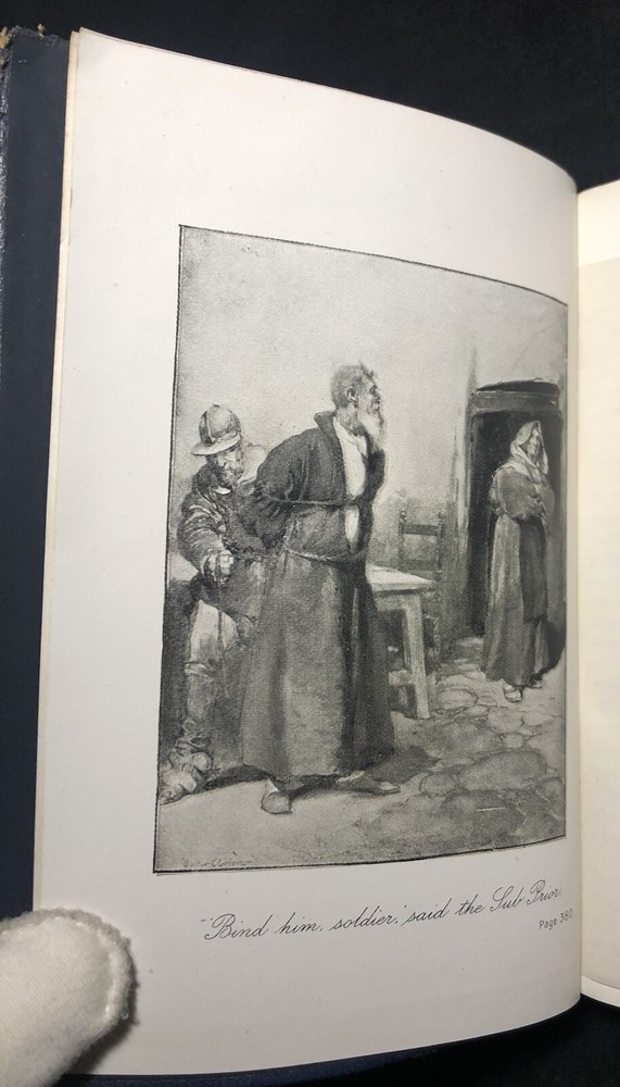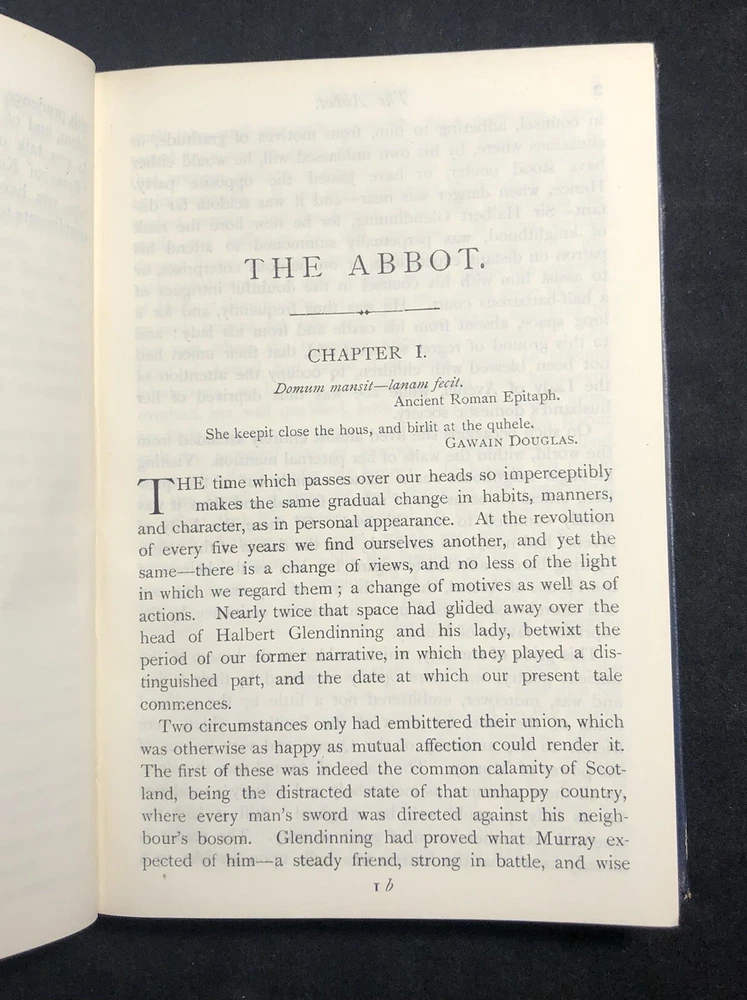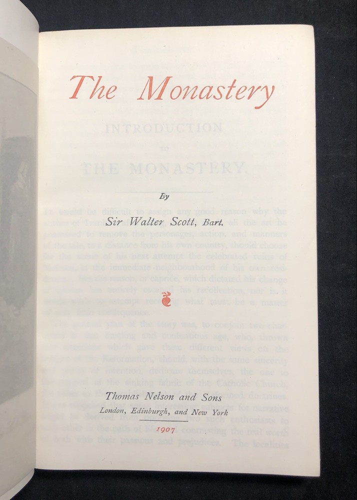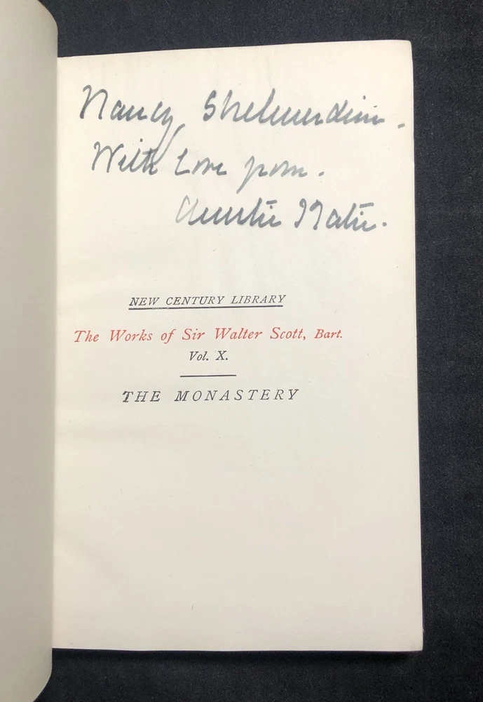 Lot of 3 blue leather bound Sir Walter Scott novels: The Monastery, its sequel The Abbot, and Anne of Geierstein. Illustrated with black and white frontispieces and plates. Gold painted on the tops of the text blocks. White ribbon bookmarks. Volumes X, XI, and XXIII, New Century Library published by Thomas Nelson & Sons in 1906, 1907, and c.1914. Measures 6-1/4 x 4-1/4 x 5/8 inches. In good preowned condition. Some wear on the covers, mainly on the corners and the spines. Anne of Geierstein has more wear and overall fading on the covers. Bindings are tight. Some foxing on the ends of the text blocks. Pages are clean, however. Inscriptions in vintage felt tip pen on the flyleaves, one dated 1914. See images for details. N-B11