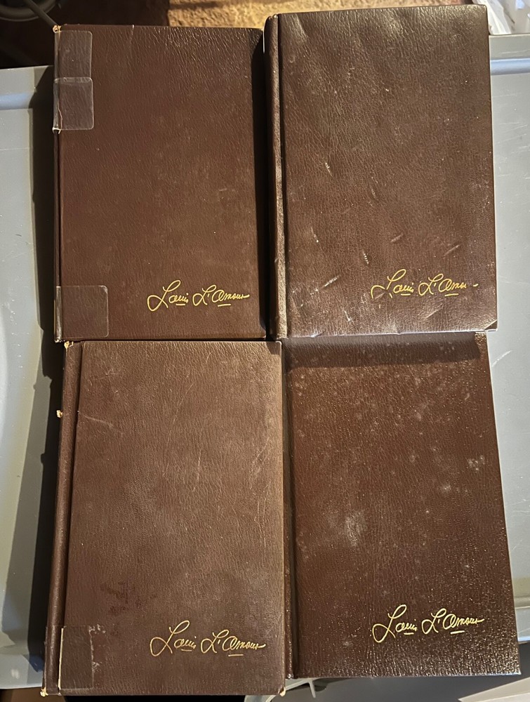 Lot of 4 Leatherette Louis Lamour books. Some tape on spine but in great condition. Sackett, Hanging Woman Creek, The Daybreakers, and Jubal Sackett. 2 paperback beyond the great snow mountains, and l...
