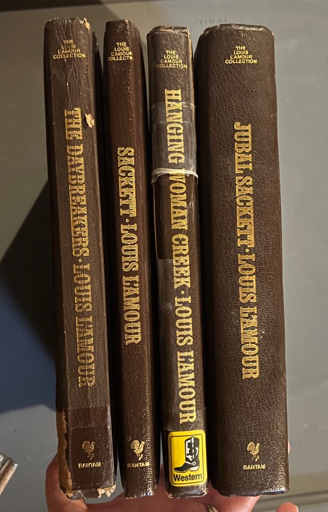 Lot of 4 Leatherette Louis Lamour books. Some tape on spine but in great condition. Sackett, Hanging Woman Creek, The Daybreakers, and Jubal Sackett. 2 paperback beyond the great snow mountains, and last of the breed