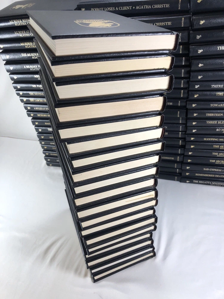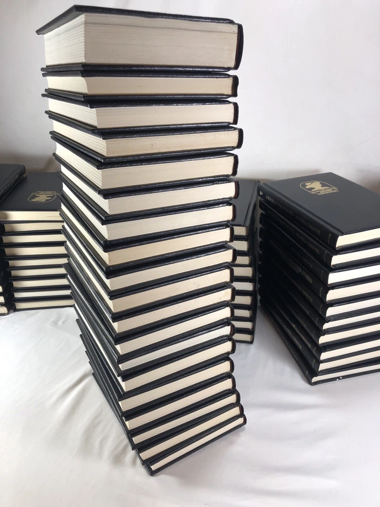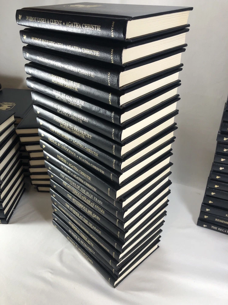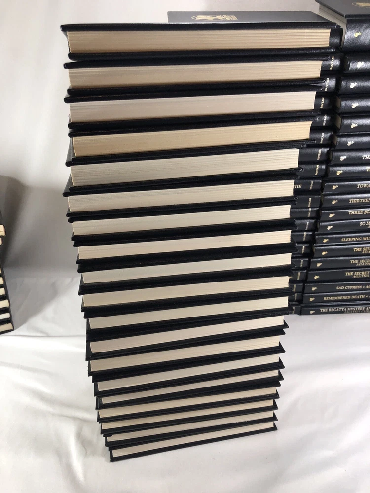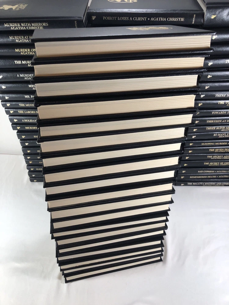 This is a lot of 76 Agatha Christie mystery collection hard cover books. They have a very dark blue leatherette cover with gold lettering. The books are in excellent condition, suitable for gift giving. There are no marks inside, no writing, nameplates, or folded pages. These books were stored very well, and do not have any off odors, such as a moldy smell. It looks as though the books really have never been read when opening them up. The titles are mostly in alphabetical order to easily see everything that is included in the first few photos. There are some rare titles. Note that there are two copies of the one book called evil under the sun. Included the maximum 24 photos to show the condition of the books, which again are in excellent condition. Each book weighs approximately 1 pound. Total shipping weight will be well over 75 pounds. The books will be packed well for protection, and shipped in two boxes. An extra handling fee has been added to help offset the shipping cost for the second package, since the eBay shipping rate can only handle one package. Books will be shipped from Connecticut, so the closer you are the less expensive shipping will be. I’ve included two different shipping options, choose whatever is best. Signature confirmation will be included if eBay requires it. LOCAL PICKUP IS AVAILABLE. LOCATED IN CT 06035 Please email with any questions.