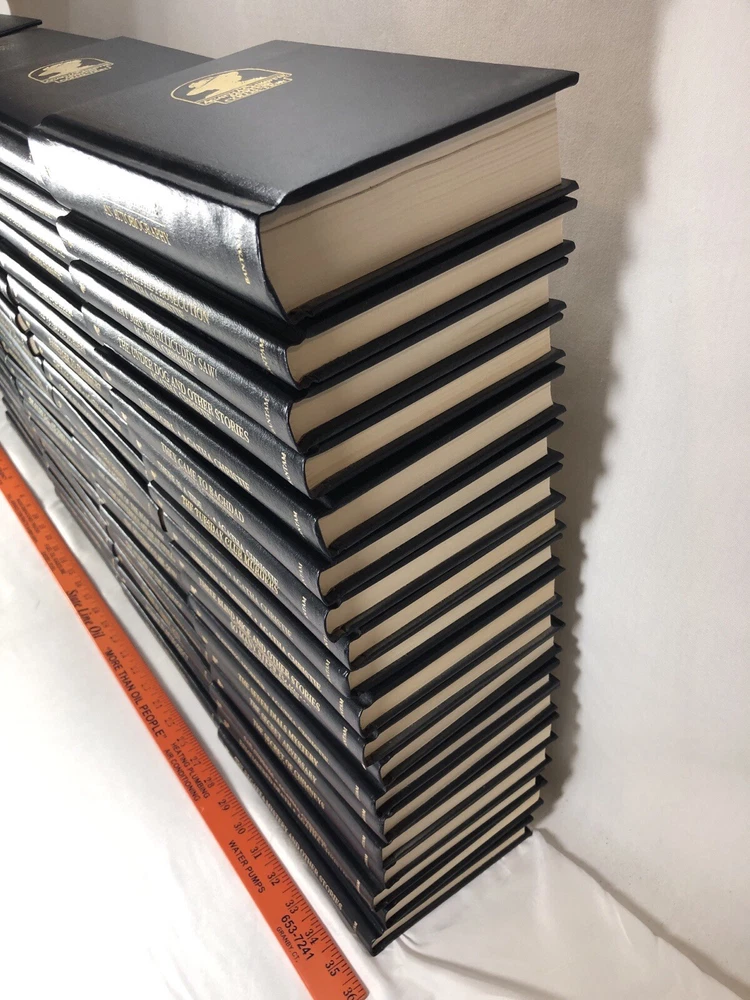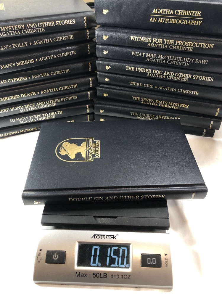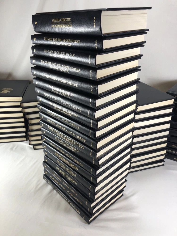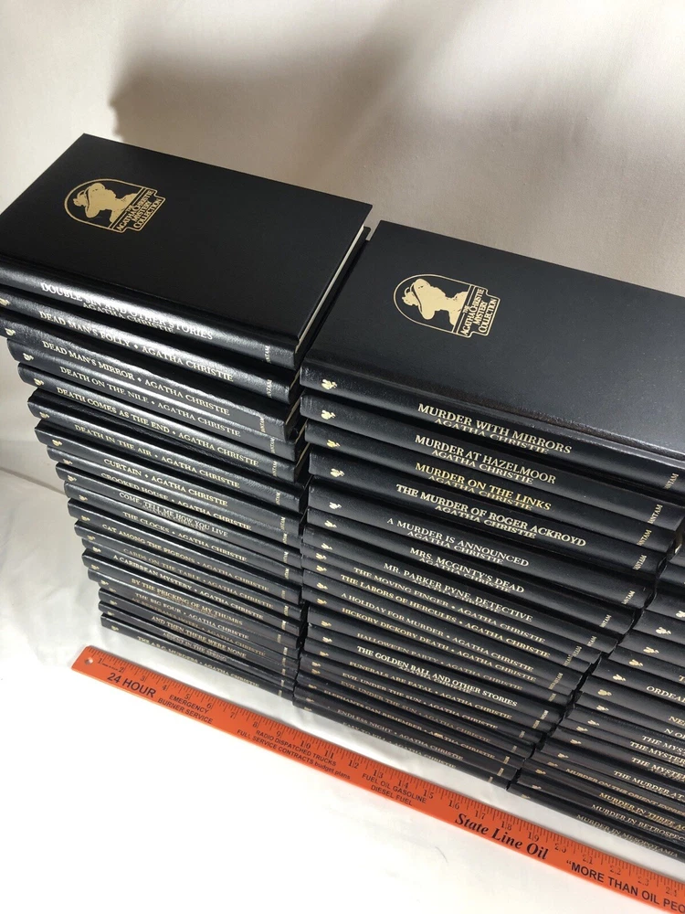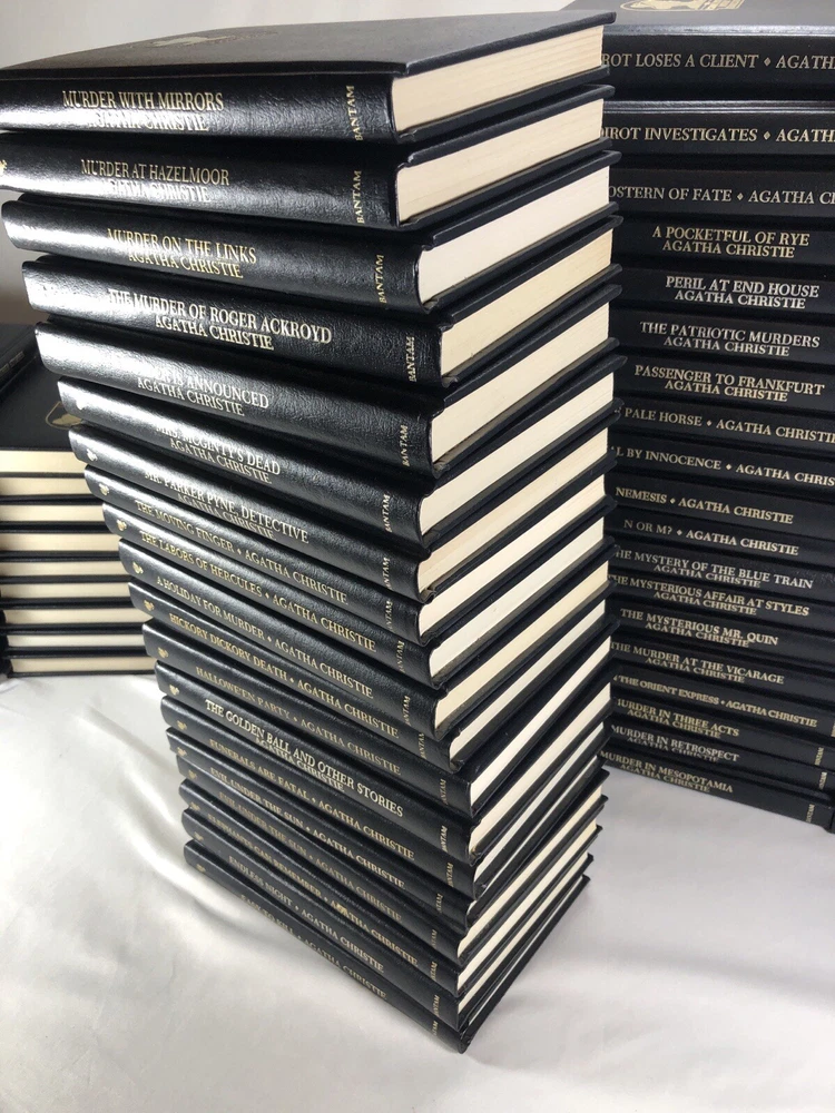 This is a lot of 76 Agatha Christie mystery collection hard cover books. They have a very dark blue leatherette cover with gold lettering. The books are in excellent condition, suitable for gift giving. There are no marks inside, no writing, nameplates, or folded pages. These books were stored very well, and do not have any off odors, such as a moldy smell. It looks as though the books really have never been read when opening them up. The titles are mostly in alphabetical order to easily see everything that is included in the first few photos. There are some rare titles. Note that there are two copies of the one book called evil under the sun. Included the maximum 24 photos to show the condition of the books, which again are in excellent condition. Each book weighs approximately 1 pound. Total shipping weight will be well over 75 pounds. The books will be packed well for protection, and shipped in two boxes. An extra handling fee has been added to help offset the shipping cost for the second package, since the eBay shipping rate can only handle one package. Books will be shipped from Connecticut, so the closer you are the less expensive shipping will be. I’ve included two different shipping options, choose whatever is best. Signature confirmation will be included if eBay requires it. LOCAL PICKUP IS AVAILABLE. LOCATED IN CT 06035 Please email with any questions.