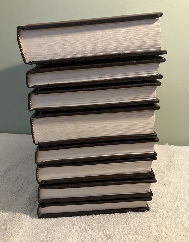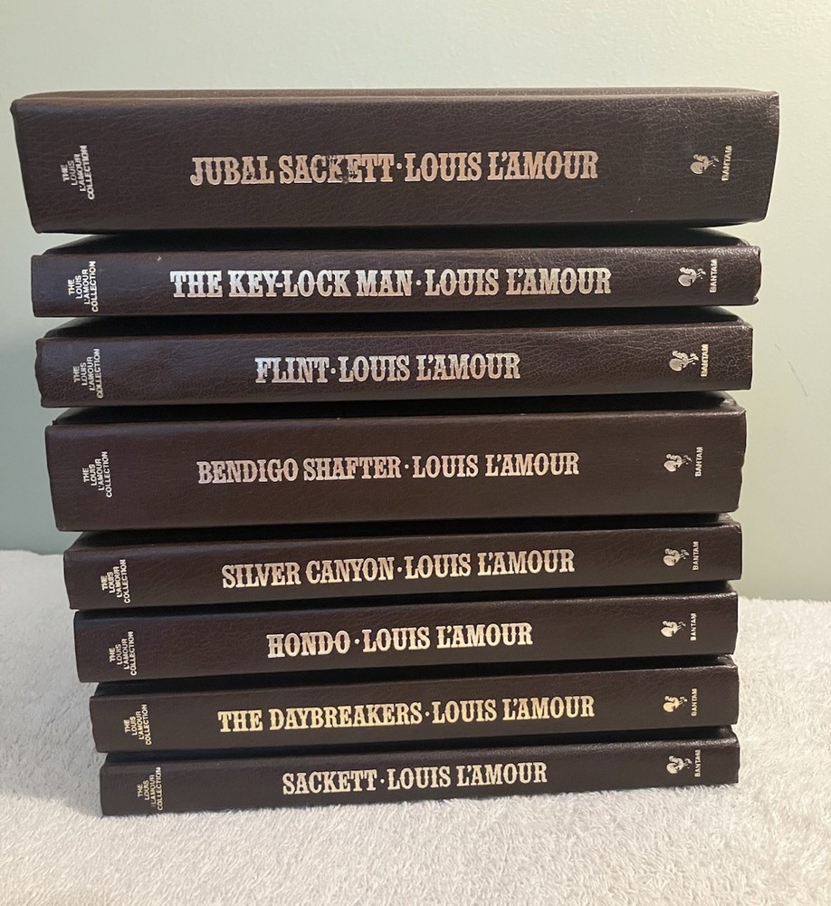 This is a lot of 8 hardcover leatherette books from The Louis L'Amour Collection published by Bantam Books in the 1980s. The books contain various titles of Western fiction narratives, including anecdotes, action, adventure, and historical stories. The books are faux leather bound and intended for adult readers. All 8 books are in very good condition. Jubal Sackett book was published upside down from last page to first page. All other books are published normally from front to rear. Please review photos. Any questions or concerns please feel free to ask. Shipped USPS Media Mail
