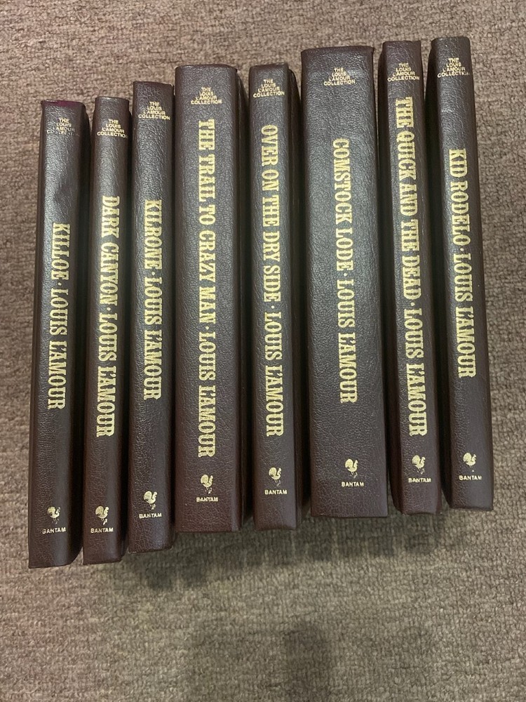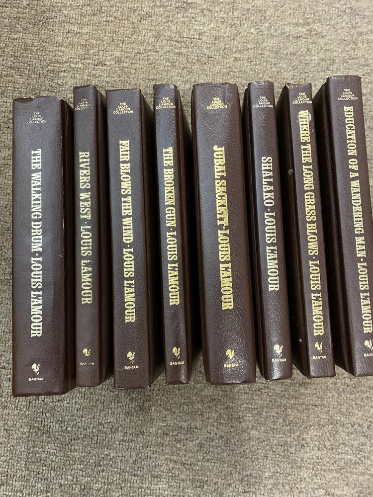 Louis L'Amour Leatherette Books: The High Graders Flint Showdown at Yellow Butte Silver Canyon The Last of the Breed Long Ride Home The Empty Land The Californios The Man Called Noon Passin Through The Rider of the Ruby Hills Down the Long Hills Sackett The Outlaws of Mesquite Chancy The Man From Skibbereen To Tame A Land High Lonesome Last Stand At Papago Wells Mustang Man Taggart Kiowa Trail Conagher Callaghen Catlow The Key-Lock Man The Proving Trail Yondering Night Over the Solomons Dutchman's Flat Lonigan The Tall Stranger Tucker The Walking Drum Rivers West Fair Blows the Wind The Broken Gun Jubal Sackett Shalako Where the Long Grass Blows Education of a Wandering Man Dark Canyon Killoe Kilrone The Trail to Crazy Man The Quick and the Dead Comstock Lode Over on the Dry Side Kid Rodelo