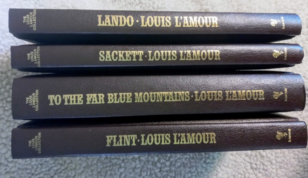 This collector's edition Louis L'Amour Western novel set features four books bound in faux leather. The vintage books were published by Bantam Books in the 1980s and are part of a series of collections of short stories. The books are in excellent condition and are perfect for adult readers who love historical Western novels. Start or add to your collection, or give as a gift. The set includes various titles and do not have any damage or inscriptions so are suitable for gift-giving. The Louis L'Amour Collection 4 Book Lot is an ideal addition to any Western genre enthusiast's bookshelf.