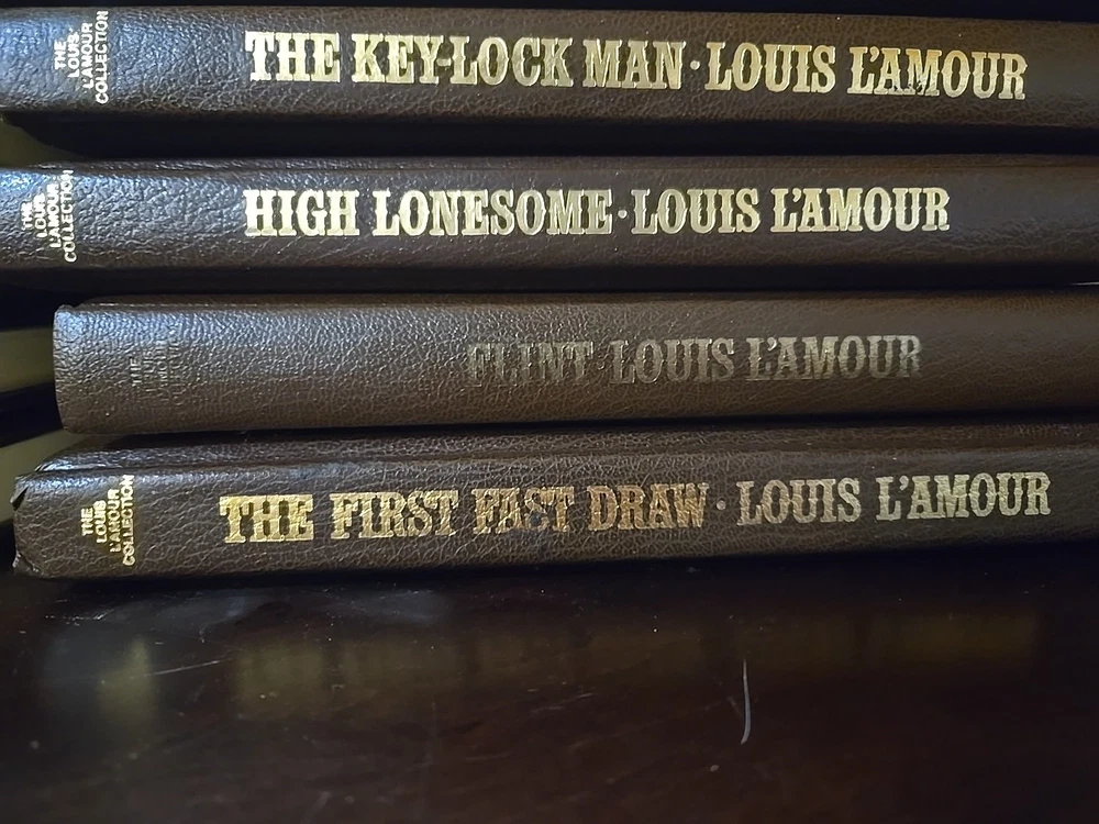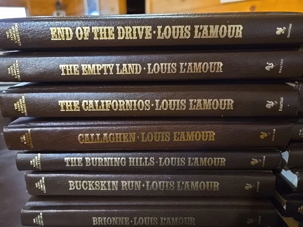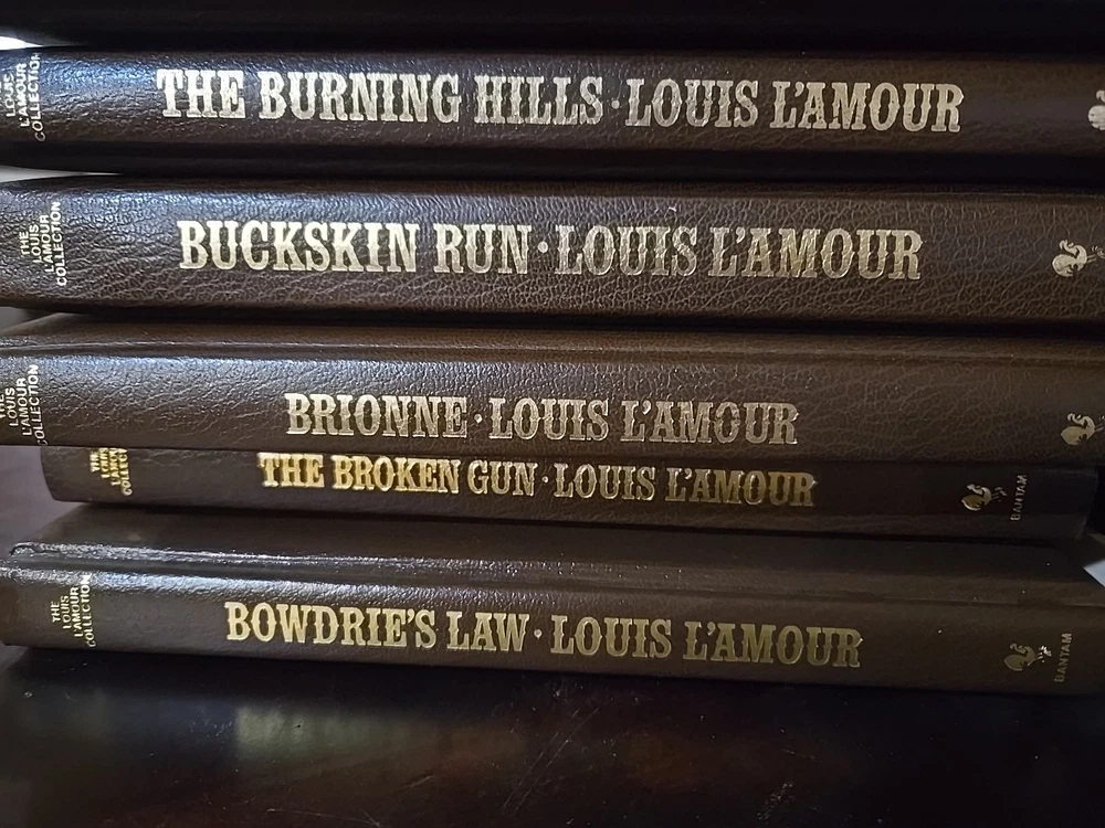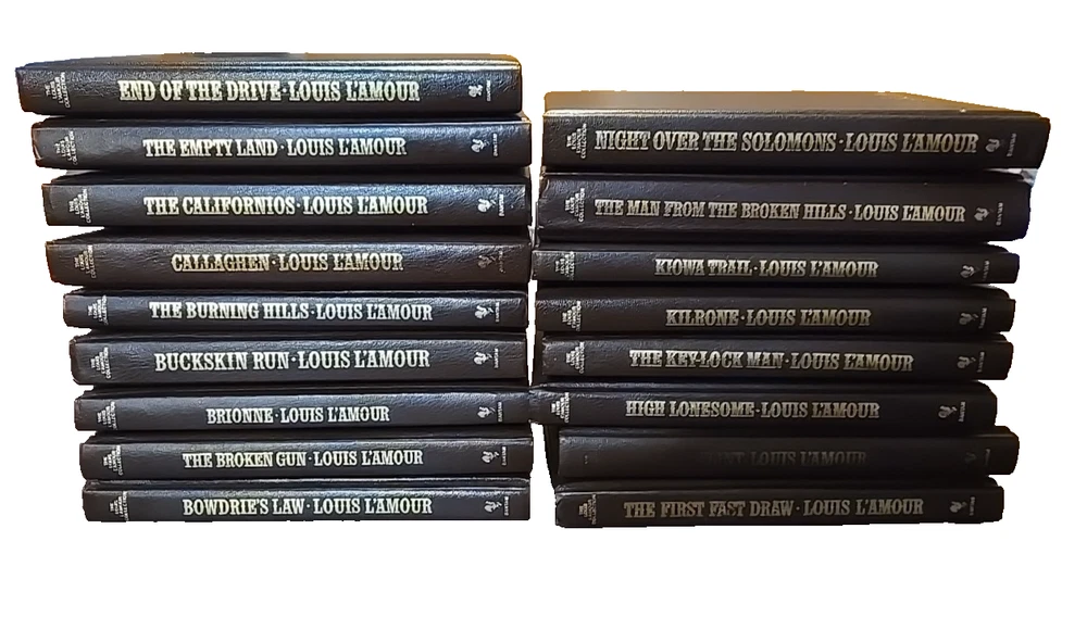 Louis L’Amour Collection 1st Lot of 17 I Have 2 Lots Listed Each Have 17 Books See Store for other Listing Leatherette Books No Duplicates Bantam Included Are: Bowdrie's Law The Broken Gun Brionne Buckskin Run The Burning Hills Callaghen The Californios The Emptyland End of The Drive The First Fast Draw Flint High Lonesome The Key-Lock Man Kilrone Kiowa Trail The Man From The Broken Hills Night Over The Solomons Always check out photos for more info on details I AM NOT A PHOTOGRAPHER! Please check out my other sales. Most items I get came from yard sales, Goodwill/Thrift stores and Auctions. I try to list any flaws I see. I definitely am not perfect. If I miss anything of MAJOR proportions, I will definitely make it right. Please note, all of these items are used unless noted. I like to say · I know a lot about a little · I know a little about a lot · I know Everything about NOTHING!