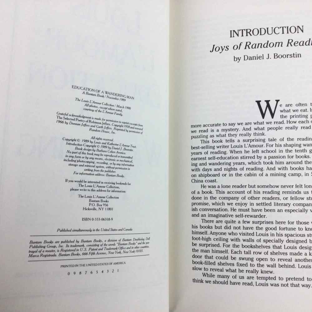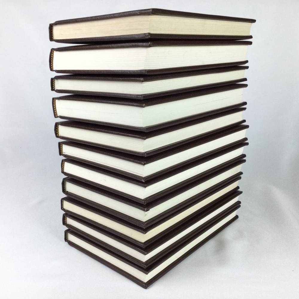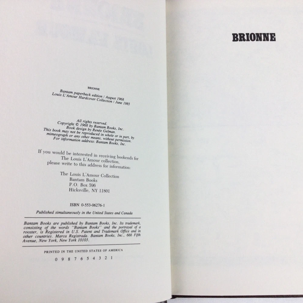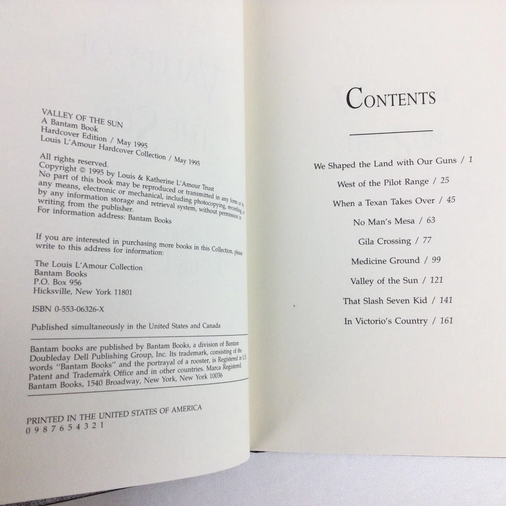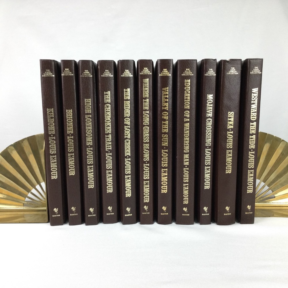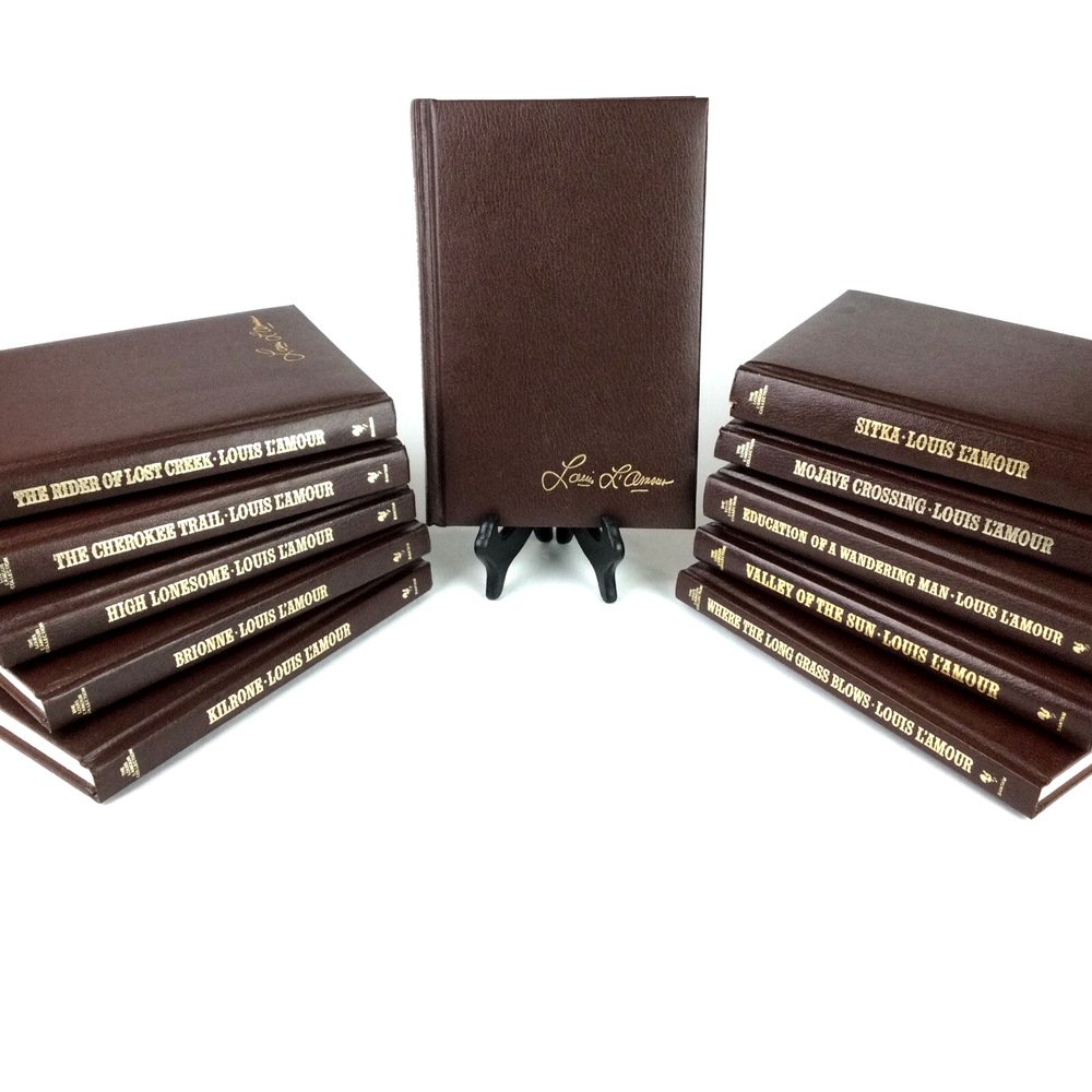 The Louis L'Amour Collection Lot x 11 Padded Leatherette Hardcover Set Bantam Books 1980s 9.25" x 6" size Condition - ALL books have pristine near mint / mint interior with crisp clean white pages. Three noted with (*) have small exterior flaw, see description below. All other books have excellent exteriors. Mojave Crossing Westward The Tide High Lonesome The Cherokee Trail The Rider of Lost Creek Where the Long Grass Blows Valley of the Sun Brionne *Kilrone - small ding on front cover, see photo 17 *Education of a Wandering Man - small ding on front cover, photo 18 *Sitka - small tear on top spine, see last photo 19