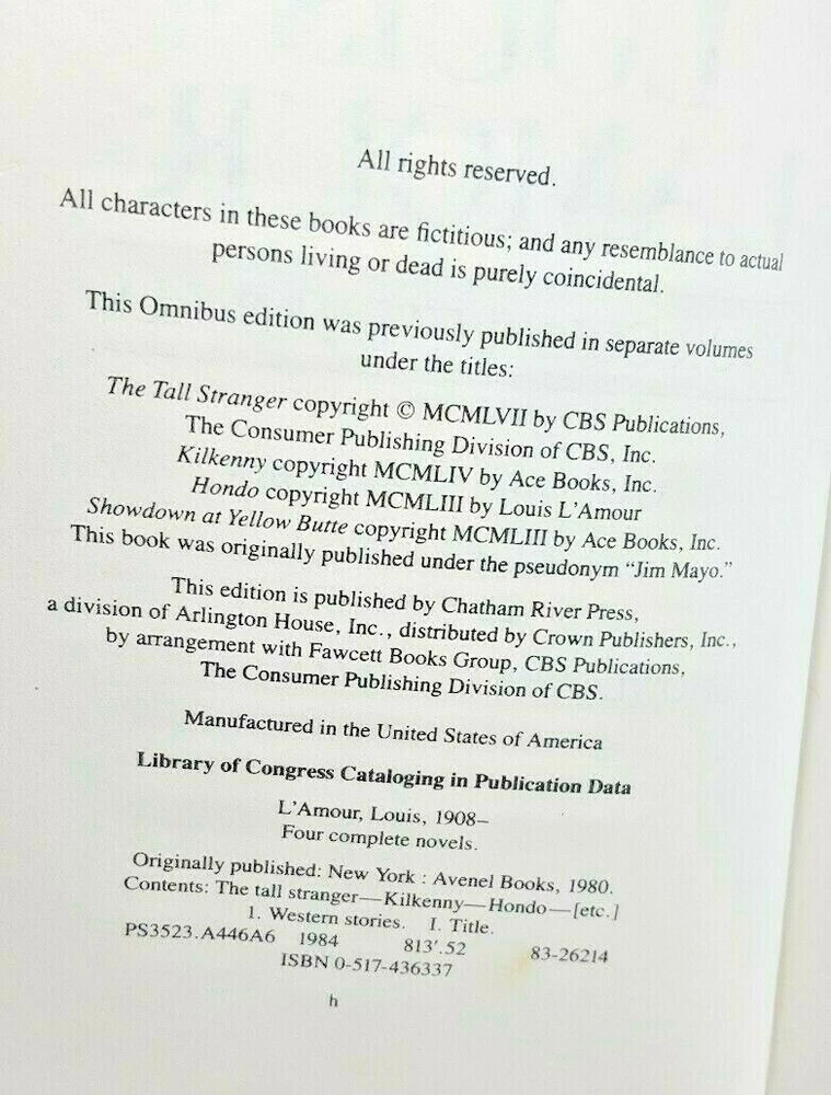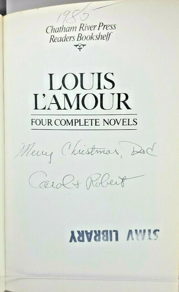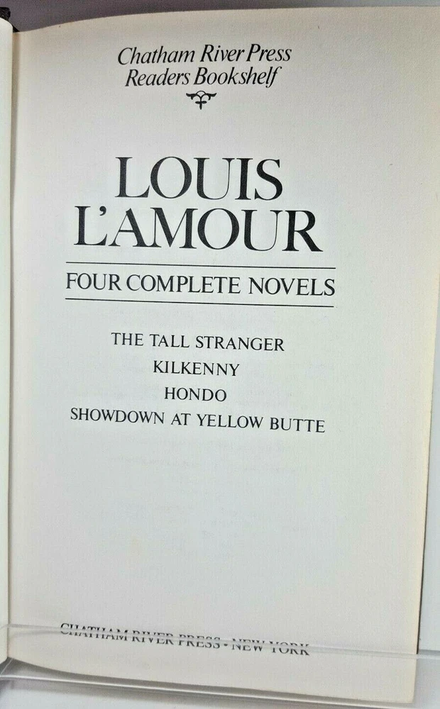 Louis L'Amour Four Complete Novels Bonded Leather Chatham River Press 1984 Book is in good, preowned condition. There is an inscription. Beautifully Leather Bound with Gold embossed lettering and gilt-edged pages. Decorative endpapers at the front and back of the book. Four Novels, unabridged: The Tall Stranger Kilkenny Hondo Showdown at Yellow Butte. SHIPPING TIME: We ship all items within 1 business day of your payment clearing. (Excluding holidays and weekends) ITEM DESCRIPTION: The item you see in the photograph is the exact item you will receive . We do not use stock photos. RETURNS: We accept ANY item back within 60 days of the original purchase date for a full refund. FEEDBACK: We aim to earn positive 5-star feedback for every item. If you’re happy with your purchase please take a minute to leave positive 5-star feedback. If you have any issues with your purchase please contact us directly using eBay’s message service to resolve the issue so that we can earn your positive 5-star feedback. Thank you!