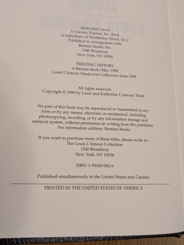 Louis L'Amour MONUMENT ROCK Bantam Leatherette Hardcover Western Book - LNUC Like New Used Condition - Book is in Great Condition, I don't believe it has been read. Near Mint Condition. Please see all Pics for Overall Condition. 1998 Bantam Books Leatherette Hardbound Edition. Book Size: 9.25" x 6.25" Please ask if you have any other questions and thanks for looking at the listing.