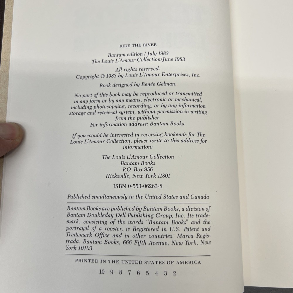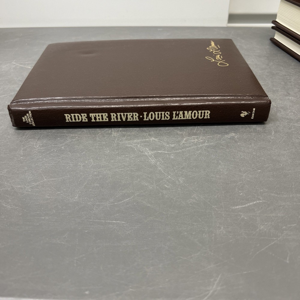 Immerse yourself in the gripping Western narrative of "Ride the River" by Louis L'Amour, presented in a distinguished Bantam leatherette hardcover edition. A collectible treasure for aficionados of the genre, this novel captivates with its rich storytelling and vivid setting. Published in 1998, it is a testament to L'Amour's enduring legacy in the world of fiction. This edition, part of the Louis L'Amour Collection, boasts an elegant faux leather bound cover, measuring 9.25 inches in height and 6.25 inches in width. A must-have for any Western genre enthusiast or collector of Americana literature, "Ride the River" is a novel that transcends time with its timeless tale of adventure and destiny.