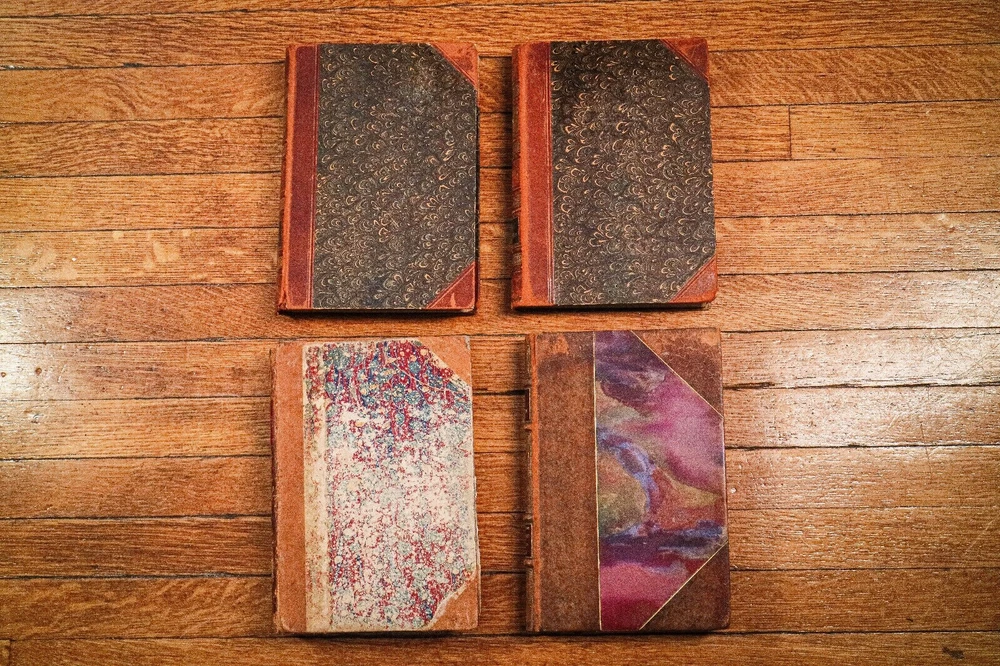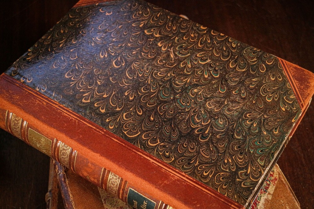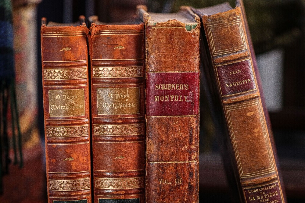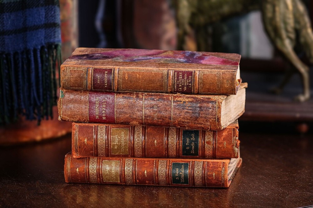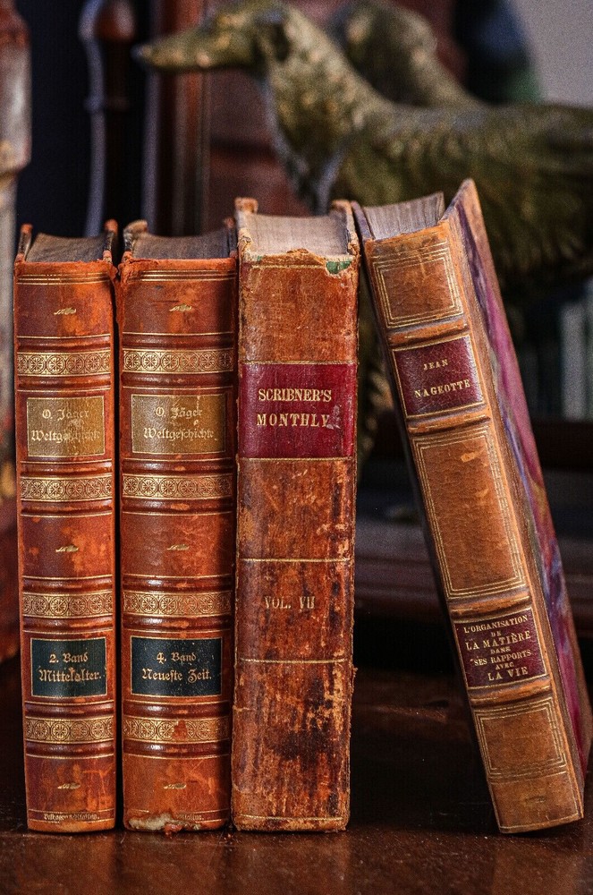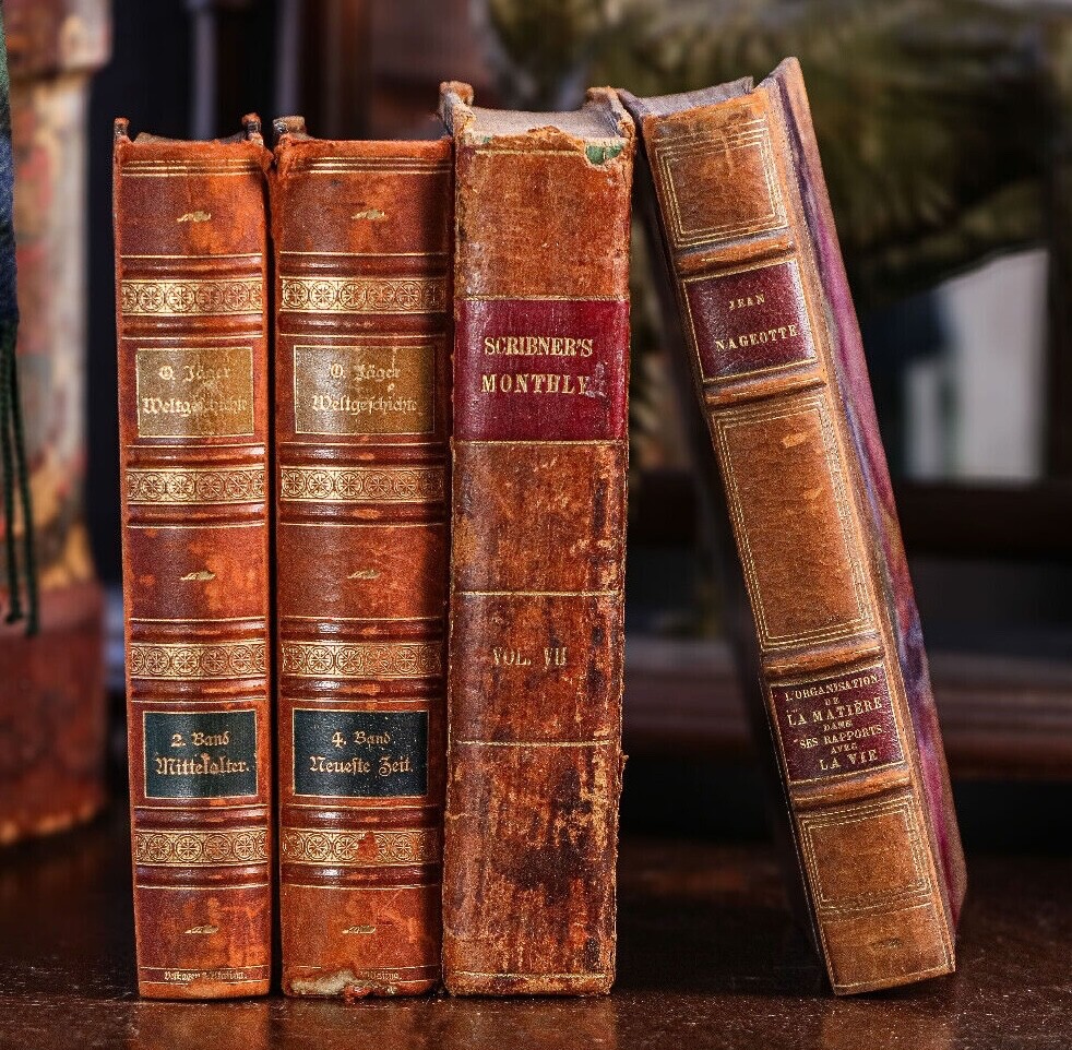 This collection of four antique leather spine books offers a glimpse into the rich history of literature and craftsmanship. Each book exudes a distinguished charm, adorned with a captivating aged patina that speaks to its journey through time. Bound in luxurious leather, these books boast an exquisite texture and allure, inviting the observer to run their fingers over the weathered spines and feel the weight of history within their pages. From classics of literature to volumes of poetry or historical tomes, each book holds its own unique narrative waiting to be discovered. Scribner's Monthly Vol. VII (Nov 1873 to April 1874) Measures 9.25 inches high, 7 inches wide and 2 inches deep. L'Organisation de La Matière (The Organization of Matter 1922) Text language is French. Measures 9.75 inches high, 6.5 inches wide and 1.25 inches deep. Weltgelchichte (World History) Vol. 2 and 4 (1899 and 1902) Text language is German. Measures 9.25 inches high, 7 inches wide and 1.25 inches deep Perfect for display in any setting, whether adorning the shelves of a cozy study, gracing the coffee table of a sophisticated living room, or adding character to a bookcase in a traditional library, these antique treasures lend an air of sophistication and nostalgia to their surroundings. Good antique condition with signs of age-related wear. Please review the photos for further condition assessment. With their timeless appeal and inherent beauty, this collection of antique leather spine books serves as both a decorative statement piece and a tangible connection to the past, inviting readers and collectors alike to embark on a journey through the annals of literature and history. Check out our other book and antique listings.