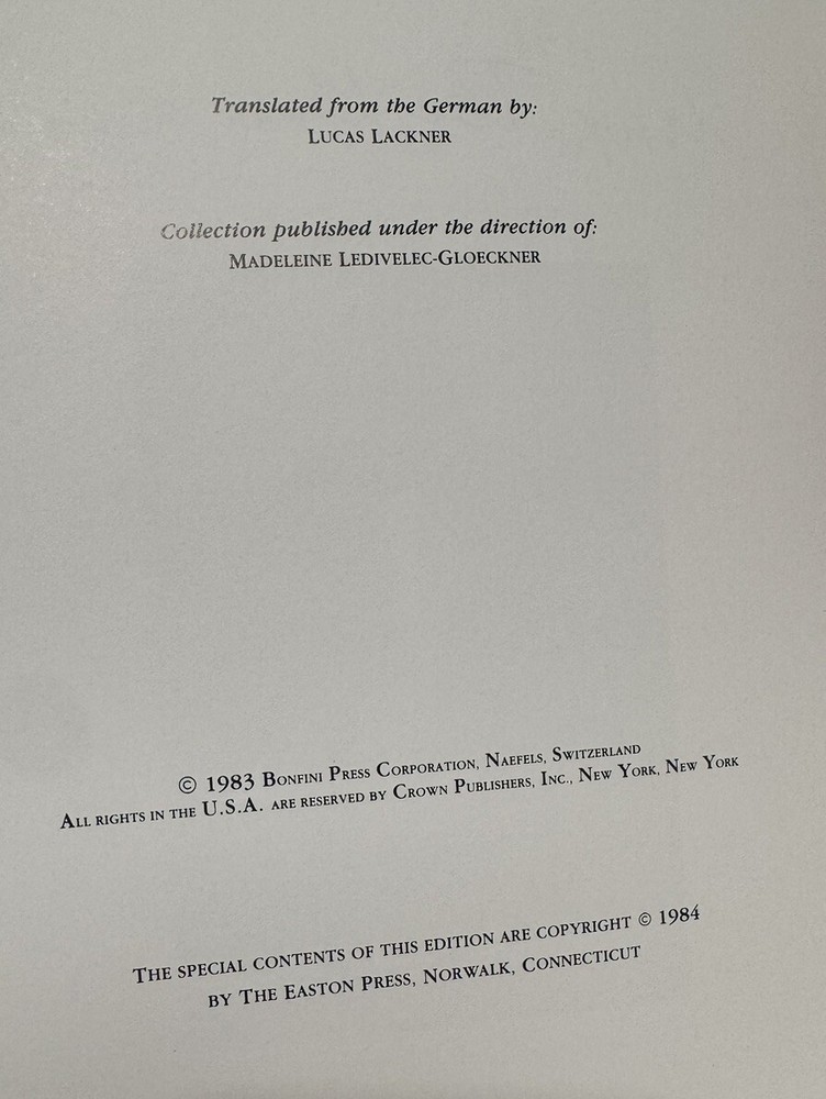 Max Beckmann by Stephan Lackner A glimpse into the famous German artist’s life as a painter, draftsman, printmaker, sculptor, and writer. Full-color plates of the art. Published in a beautiful fine binding: Accented in 22kt gold, printed on archival acid-free paper with gilded edges, custom patterned endpapers, satin ribbon place holder, Smyth sewing & concealed muslin joints. Bound In full leather with hubbed spines. Oversized, quarto: 12.25” x 9”. Illustrated throughout. Published in 1984. First edition thus. An Easton Press 1st edition/1st printing. Condition: NEAR MINT (FINE). Minimum shelf wear and rubbing. INTERIOR AS NEW. No former owner bookplates, no foxing, no writing. ***A spectacular copy of this special deluxe edition in FINE condition!*** Please view pictures to appreciate the craftsmanship and condition. Max Carl Friedrich Beckmann (February 12, 1884 – December 27, 1950) was a German painter, draftsman, printmaker, sculptor, and writer. Although he is classified as an Expressionist artist, he rejected both the term and the movement. In the 1920s, he was associated with the New Objectivity (Neue Sachlichkeit), an outgrowth of Expressionism that opposed its introverted emotionalism. Even when dealing with light subject matter like circus performers, Beckmann often had an undercurrent of moodiness or unease in his works. By the 1930s, his work became more explicit in its horrifying imagery and distorted forms with combination of brutal realism and social criticism, coinciding with the rise of nazism in Germany. As a fellow book collector, I know how frustrating it can be when items aren’t accurately described or poorly packaged for shipping. That is why I (1) take a lot of pictures and try to describe condition issues as accurately as possible and (2) pack your book purchases with the utmost care before shipping. I have been selling and buying on eBay for over 10 years and have a 100% satisfaction rating, and offer a 100% satisfaction guarantee 30-day return policy. Happy to combine shipping on multiple orders to save you money. Please follow me as I have dozens of Easton Press books and thousands of other collectible books to list in the coming weeks and months!