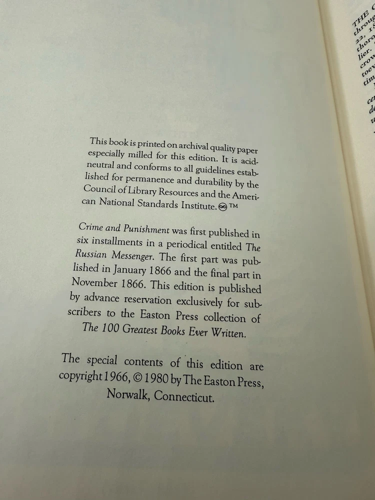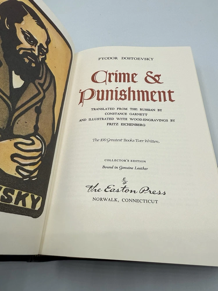 Dive into the depths of human nature with "Crime & Punishment" by Dostoevsky, a masterpiece that's as thought-provoking today as it was when first penned. This luxurious Easton Press edition is a treasure for both collectors and literary enthusiasts, boasting a rich leather binding that exudes elegance. It's part of the esteemed 100 Greatest Books Ever Written series, a testament to its timeless significance in the world of literature and fiction. The book is not only a gateway to classic Russian literature but also a visual delight, featuring stunning illustrations that complement the dense, atmospheric narrative. Whether you're brushing up on your English or simply appreciating the fine art of bookmaking, this edition offers an immersive experience into the complexities of Dostoevsky's work, ensuring it takes pride of place in your collection. Features of this Easton Press Illustrated Collection include: Fully and tightly bound in genuine leather. 22kt gold accents deeply inlaid on the "hubbed" spine. Heavy duty binding boards enhance the book’s durability. Superbly printed on acid-neutral paper that lasts for generations. Sewn pages — not just glued like ordinary books. Handsome moiré endpages and a satin-ribbon page marker. Gilded page ends. Printed and bound in the USA using imported materials. Rigorous inspection at every stage ensures adherence to our exacting standards. Superb craftsmanship and commitment to quality. These Easton Press editions are printed on sturdy, acid-neutral paper specially milled for this edition that conforms to all guidelines established for permanence and durability by the Council of Library Resources and the American National Standards Institute.