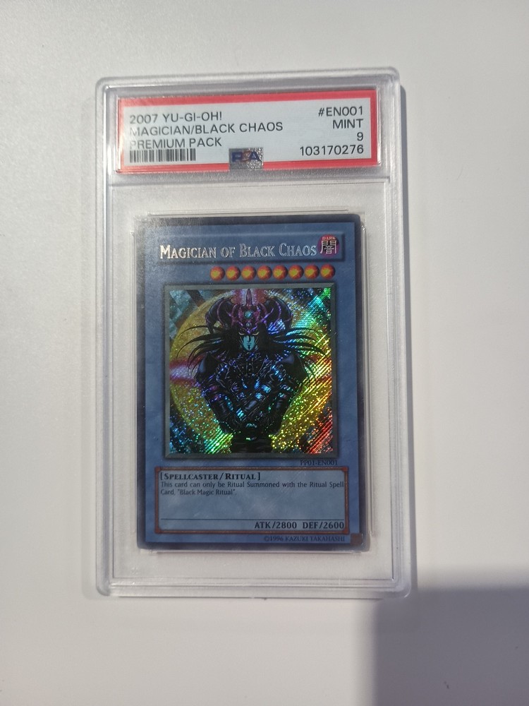 The Magician of Black Chaos PP01-EN001 Premium Pack 1 Unlimited card is a highly sought-after collectible in the Yu-Gi-Oh! TCG community. This Secret Rare Ritual Monster card features a Dark attribute, 2600 Defense/Toughness, and 2800 Attack/Power. Manufactured by Konami and graded by Professional Sports Authenticator (PSA) as a 9, this card is a valuable addition to any Yu-Gi-Oh! card collection. With its unique features and rare status, the Magician of Black Chaos card is sure to be a prized possession for any serious collector or player.