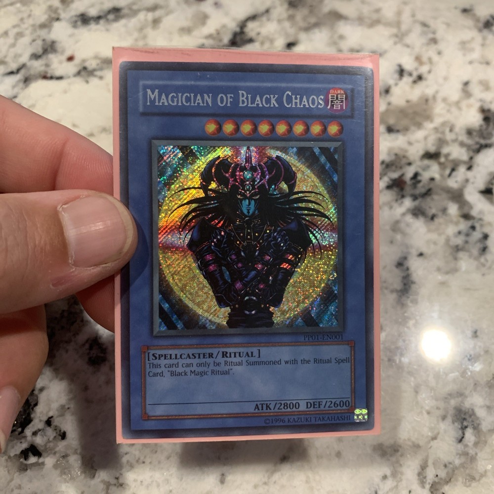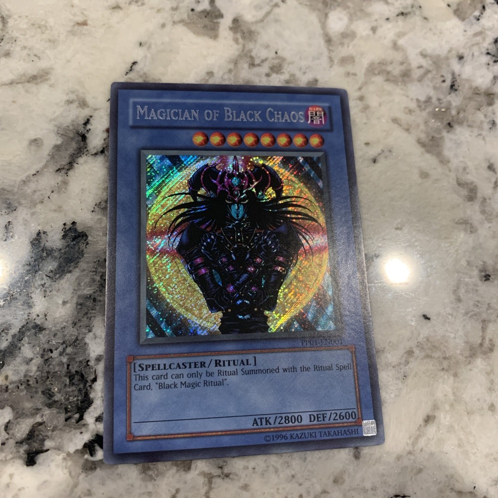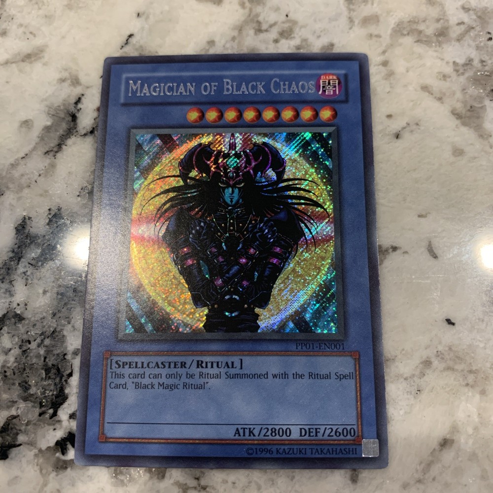 The Magician of Black Chaos Secret Rare PP01-EN001 from the Premium Pack 1 series is a powerful Ritual Monster in the Yu-Gi-Oh! TCG. With a dark attribute, 2800 attack power, and 2600 defense, this English-language card is a valuable addition to any collector's deck. Manufactured by Konami, this foil card features the potent "Black Magic Ritual" summoning condition and is part of the Rare Edition collection, making it a sought-after item for fans of the game.