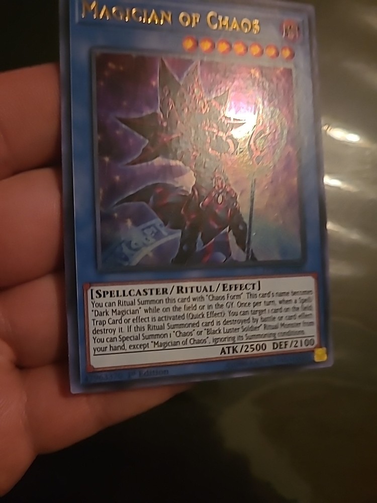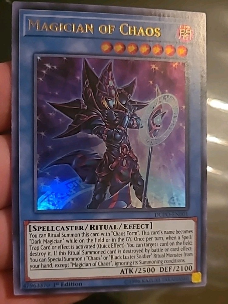 The Magician of Chaos DUPO-EN001 card is a Dark attribute Spellcaster card with 2500 attack power and a defense of 2100. This 1st Edition card from the Duel Power-1st Edition set features the ability to Ritual Summon "Dark Magician" and destroy a card on the field once per turn. It also has the special ability to Special Summon a "Chaos" or "Black Luster Soldier" Ritual Monster from your hand when it is destroyed by battle or card effect. This Ultra Rare card is manufactured by Konami in the United States, making it a valuable addition to any Yu-Gi-Oh! TCG collection.
