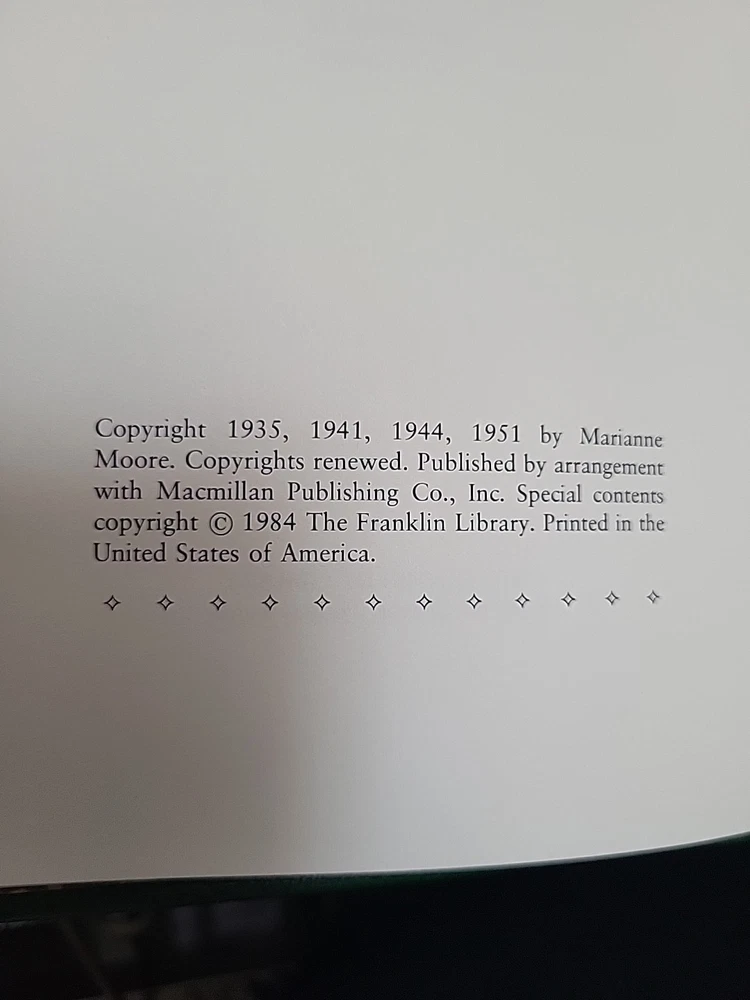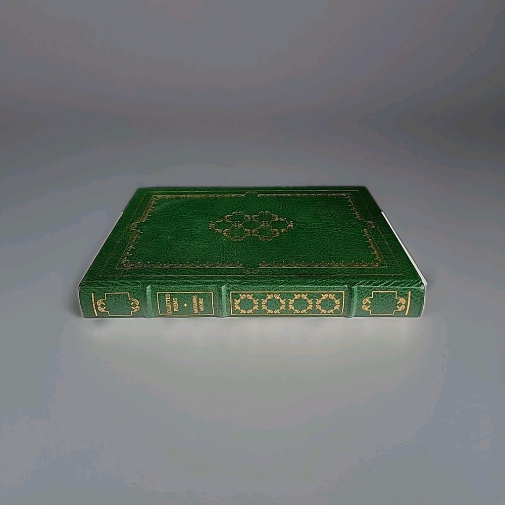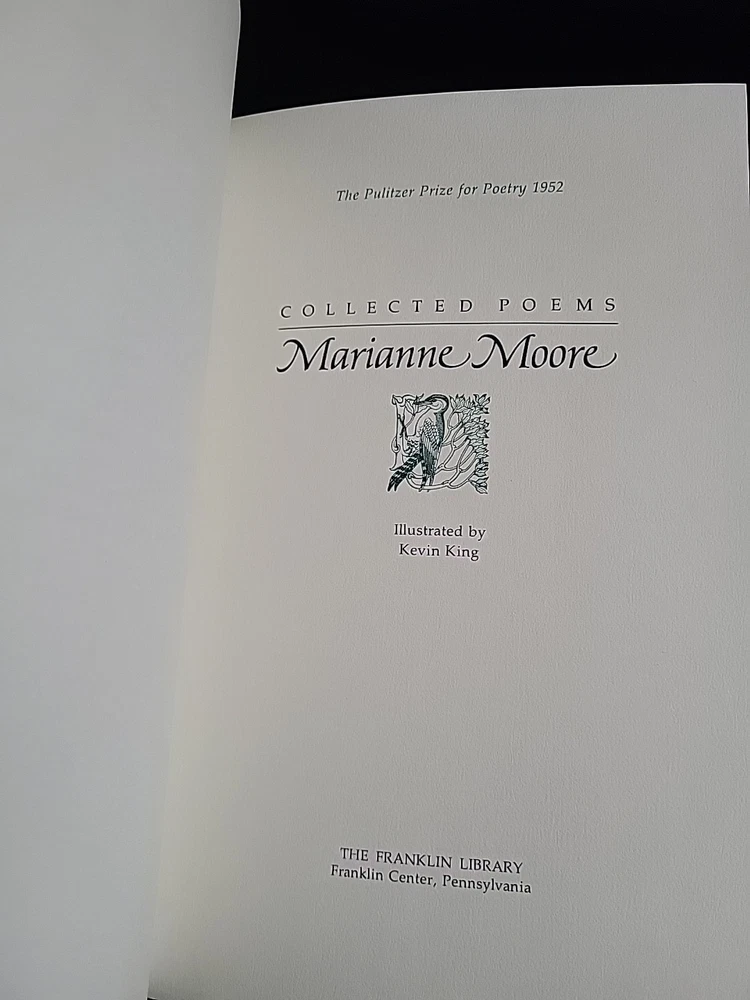 The Marianne Moore COLLECTED POEMS Illustrated Franklin Library 1984 Leather Bonding is a luxurious collector's edition book featuring the works of Marianne Moore. Published by Franklin Library in the United States, this hardcover book is adorned with leather binding and illustrations by Kevin King. The vintage edition is suitable for young adults and adults interested in literature and classic poetry, making it a valuable addition to any collection or display. With its high-quality craftsmanship and timeless appeal, this book is a must-have for poetry lovers and collectors alike.