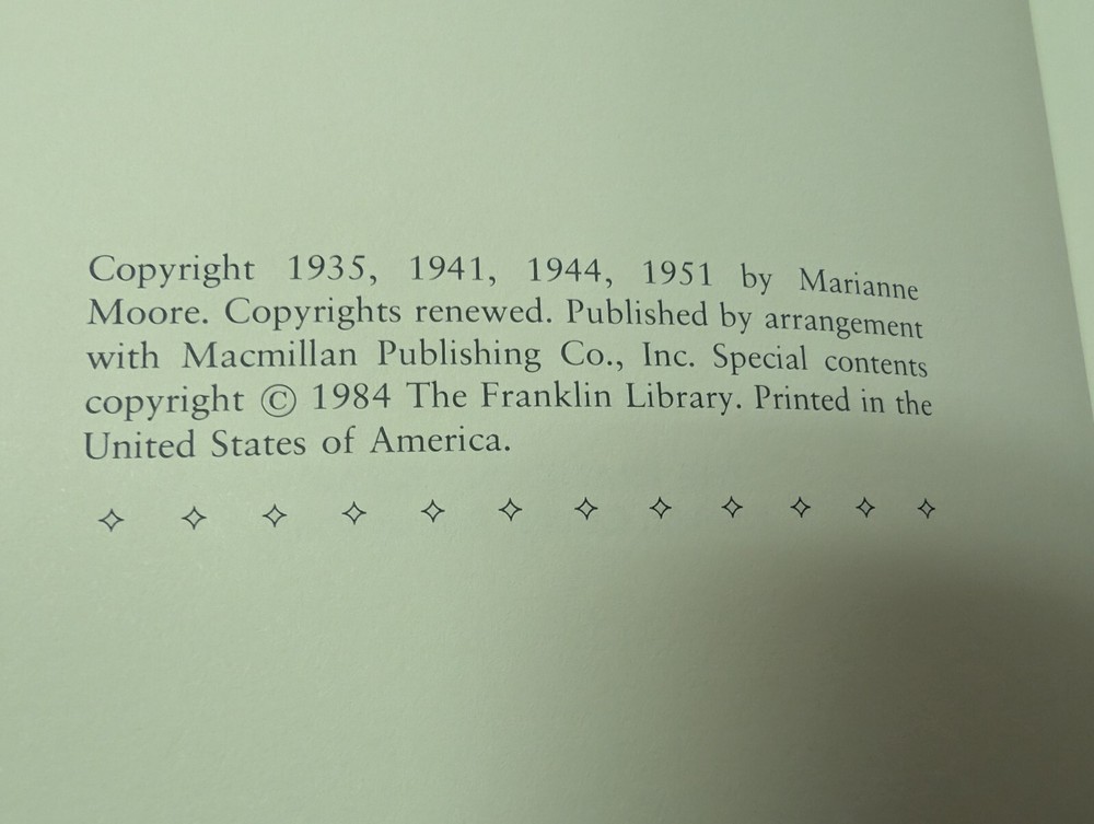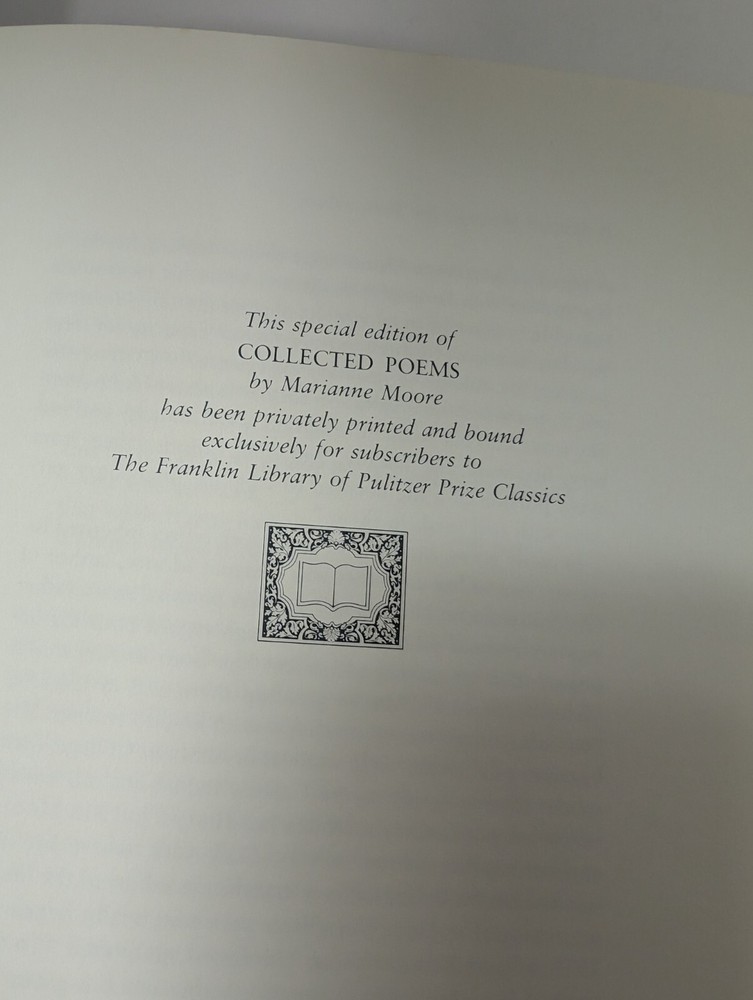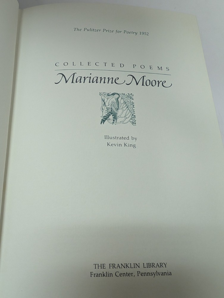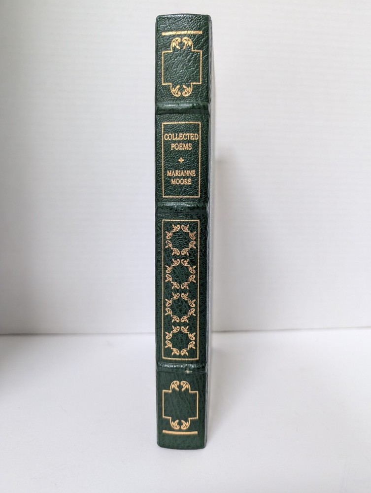 Collected Poems by Marianne Moore. Published by The Franklin Library, 1984. The Franklin Library of Pulitzer Prize Classics. Pulitzer Prize for Poetry 1952. Book Condition Very Good. Tight binding, clean interior, sharp corners. Leather bound in green with gold embellishments, gold page edges. Top page edge has some scaling other two edges unblemished. Illustrated by Kevin King. Shipped within 48 hours. Expertly packaged. We are new to Ebay, but have been in the book business for more than a decade. Buy with confidence. Brick and mortar store in Canton, Ohio. Google us to ensure our credibility. A Cornucopia of Cool Books.